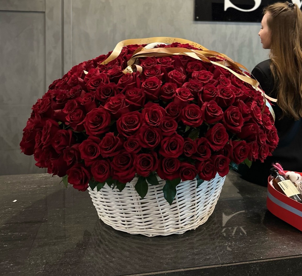 Роза сорта EXPLORER — это невероятная выразительность и яркий алый цвет, которое пленяет своей нежной текстурой и насыщенным ароматом. Каждый цветок этого сорта имеет округлую форму и густую структуру, что придает им особую привлекательность и объем. В плетеной корзине 201 роза производит настоящий ВАУ эффект