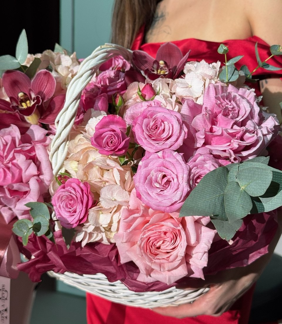 Заказать Корзина цветов с розами и орхидеей и эвкалиптом с доставкой по Самаре