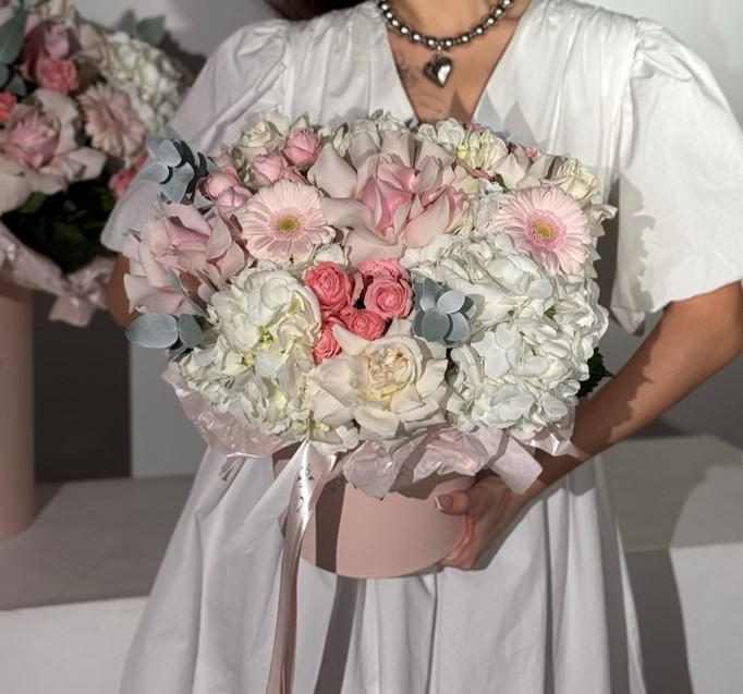 гортензией, с любимыми всеми девушками ранункулюсами и парфюмированной французской розой сорта White O'Hara , для нежных