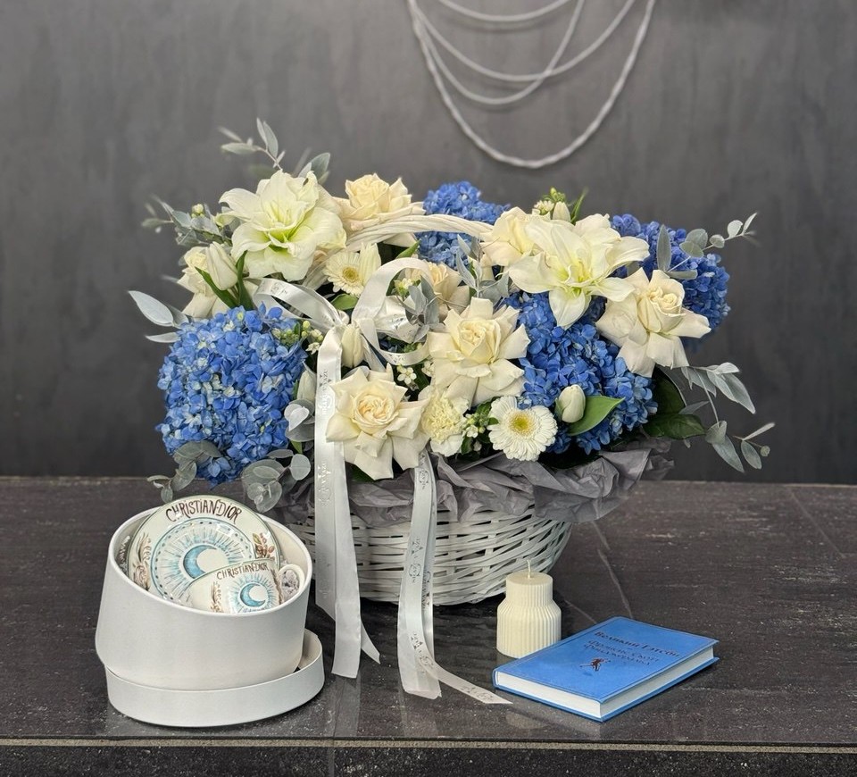 В плетеной корзине расположена восхитительная композиция в бело-синих оттенках. Синяя гортензия с ее нежными соцветиями привлекает взгляд, прекрасно контрастируя с элегантной белой лилией, излучающей свежесть и утончённость. Рядом расцветает белая французская роза, обладающая романтичным шармом и сладким ароматом. В завершение, изумрудные веточки эвкалипта добавляют композиции изящества и легкости, создавая гармоничное, стильное и вдохновляющее настроение.