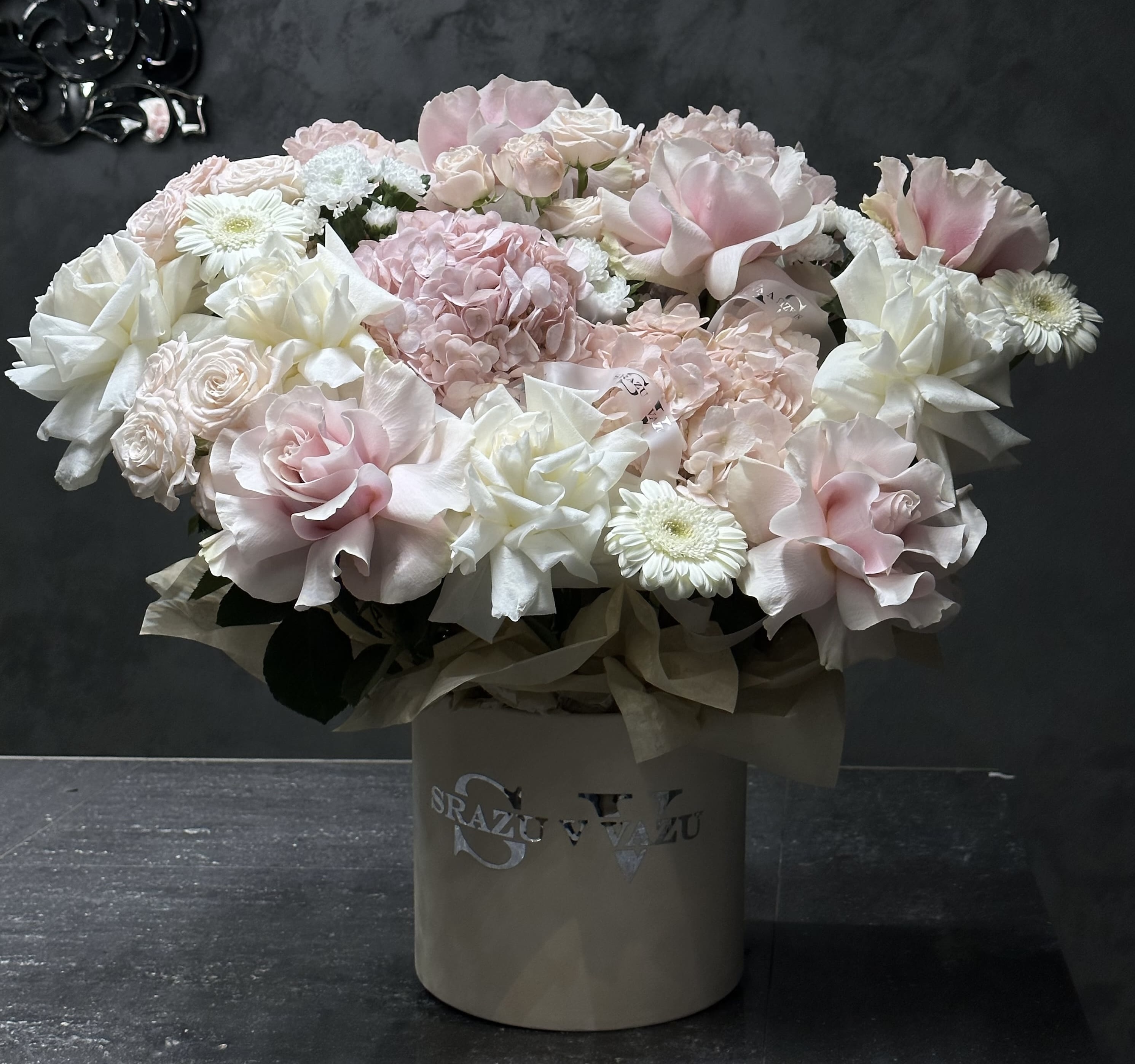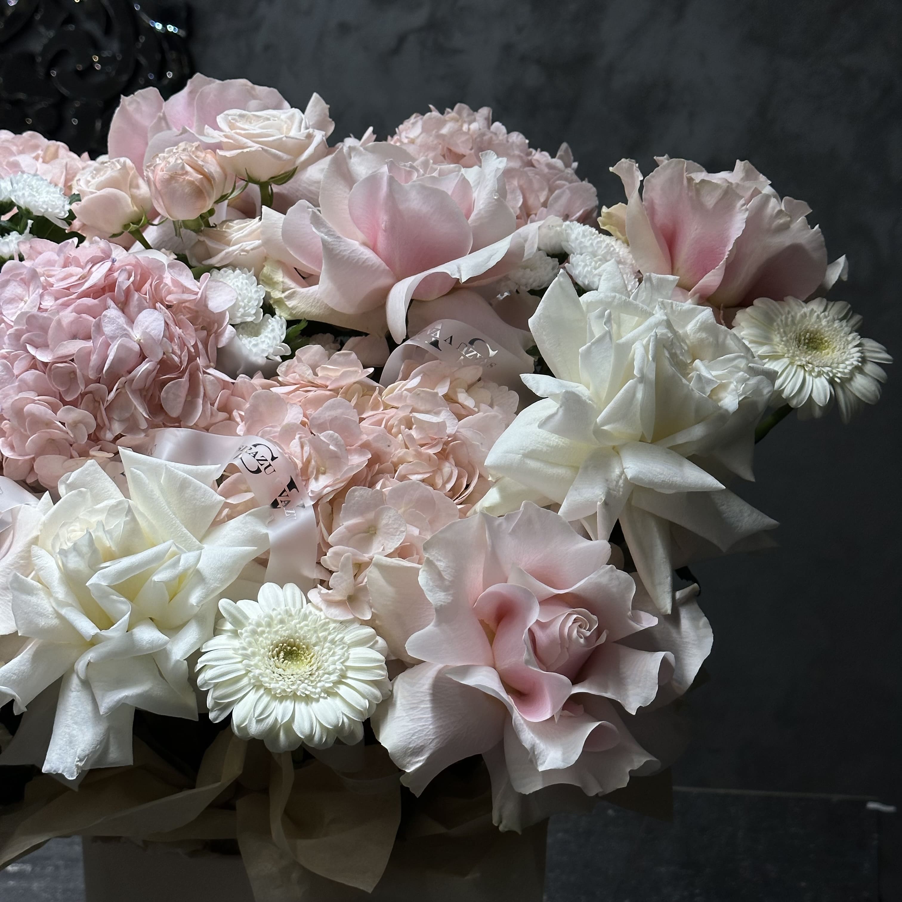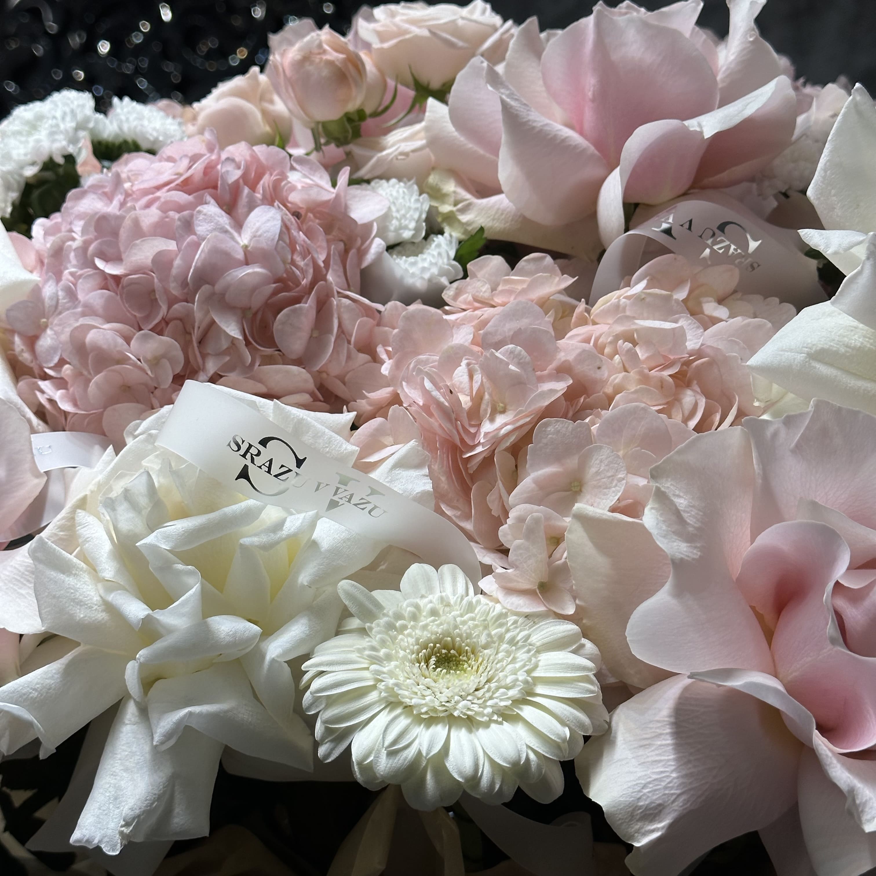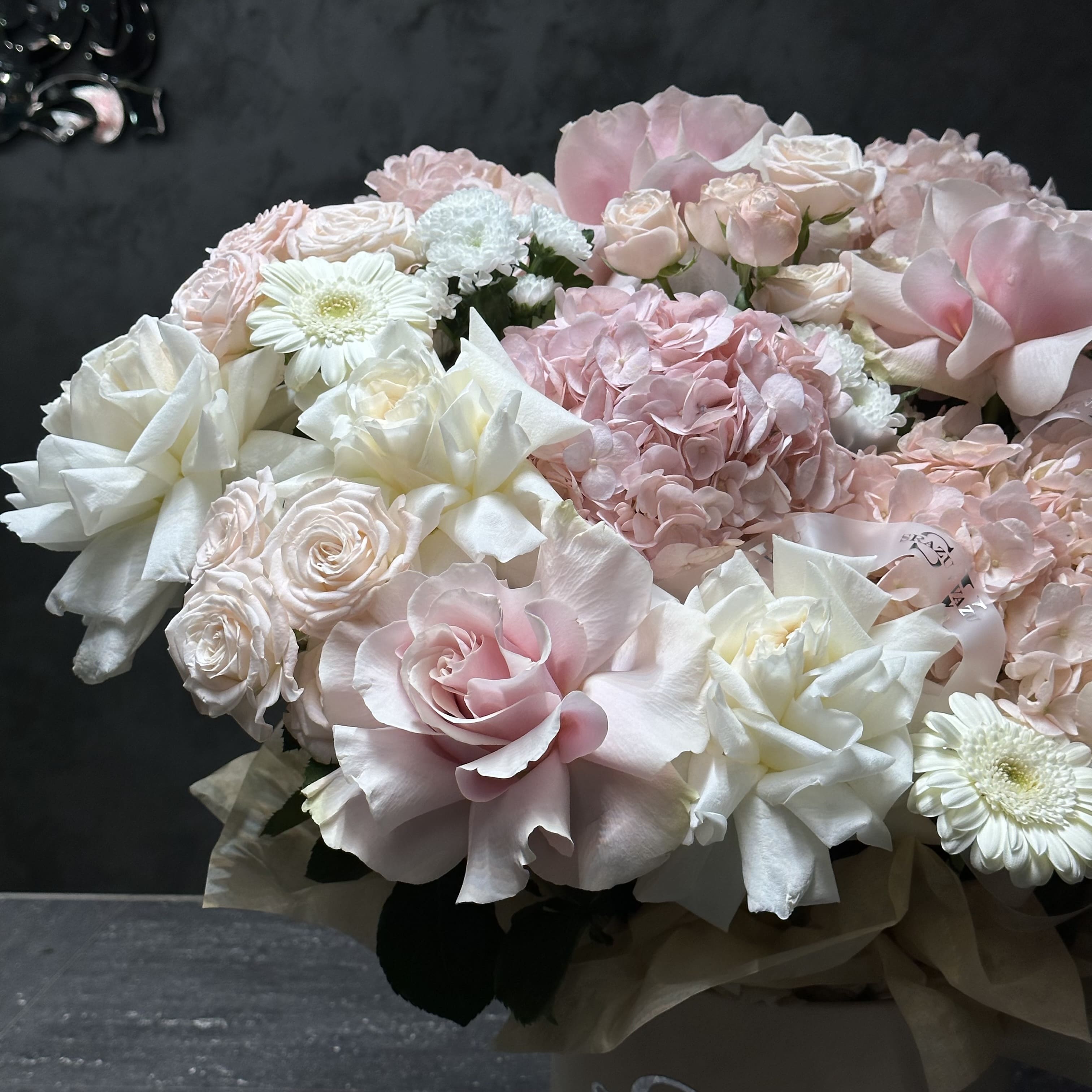 Волнующая и нежная, конфетная розово-белая гамма, выполненная в лучших цветочных текстурах и оттенках, французская роза сорта PINK MONDIAL, пышная голубая гортензия, весенняя гермини создают неповторимое игривое настроение, станут ярким выражением ваших чувств