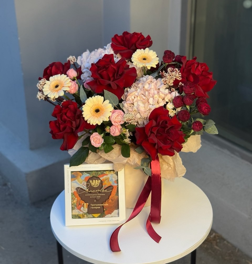 Благородная композиция в шляпной коробке с французскими розами сорта Explorer и озотамнусом. Беспроигрышное сочетание персикового и алого, станет отличным подарком для ценителей строгой красоты и благородных цветовых сочетаний