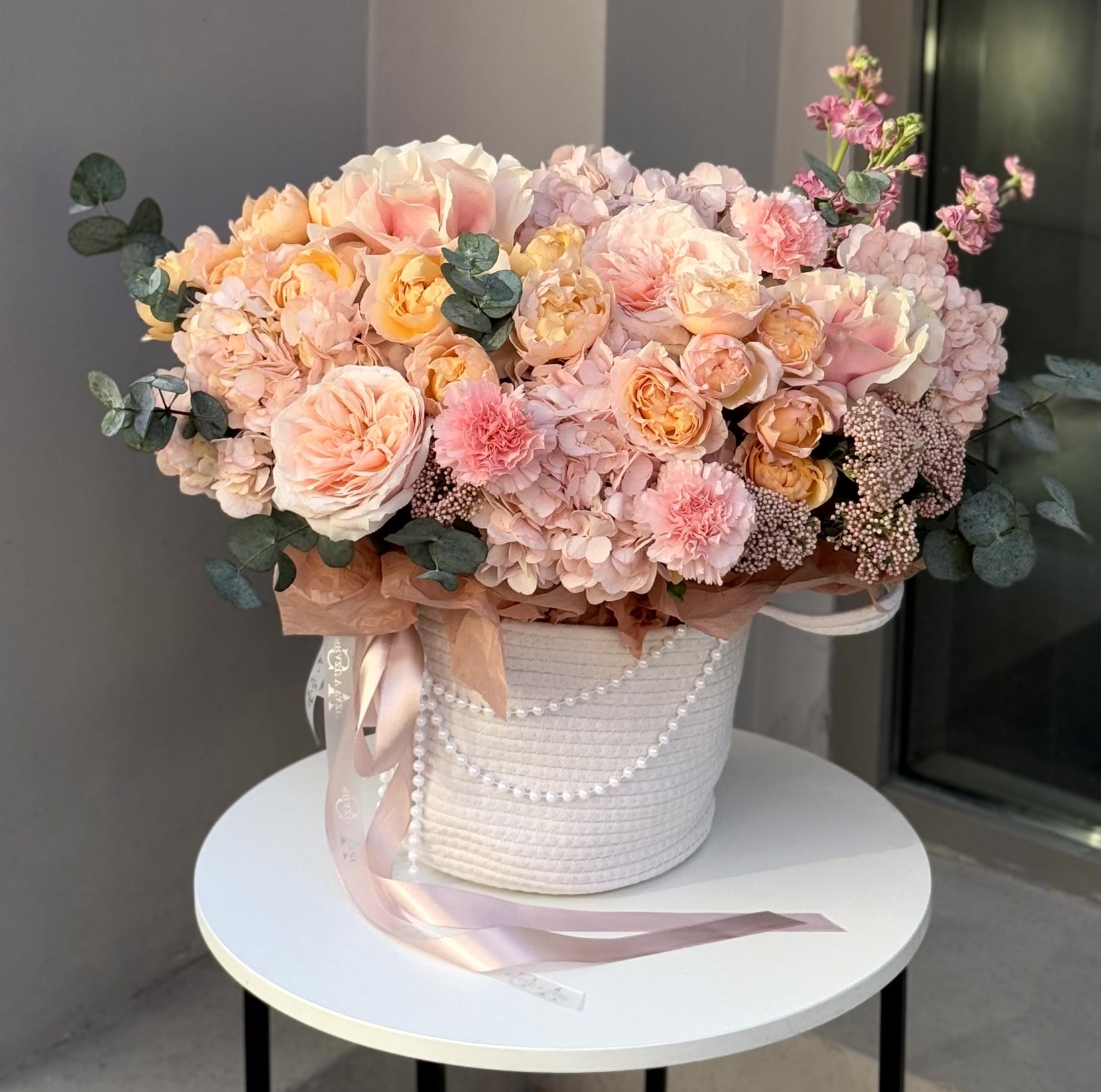 Нежнейшая композиция в пастельных теплых оттенках с премиальными пионовидными розами и свежим эвкалиптом в джутовой сумкой. Элегантное сочетание розовых и персиковых оттенков подчёркивается изящным жемчугом и гроздьями озотамнуса