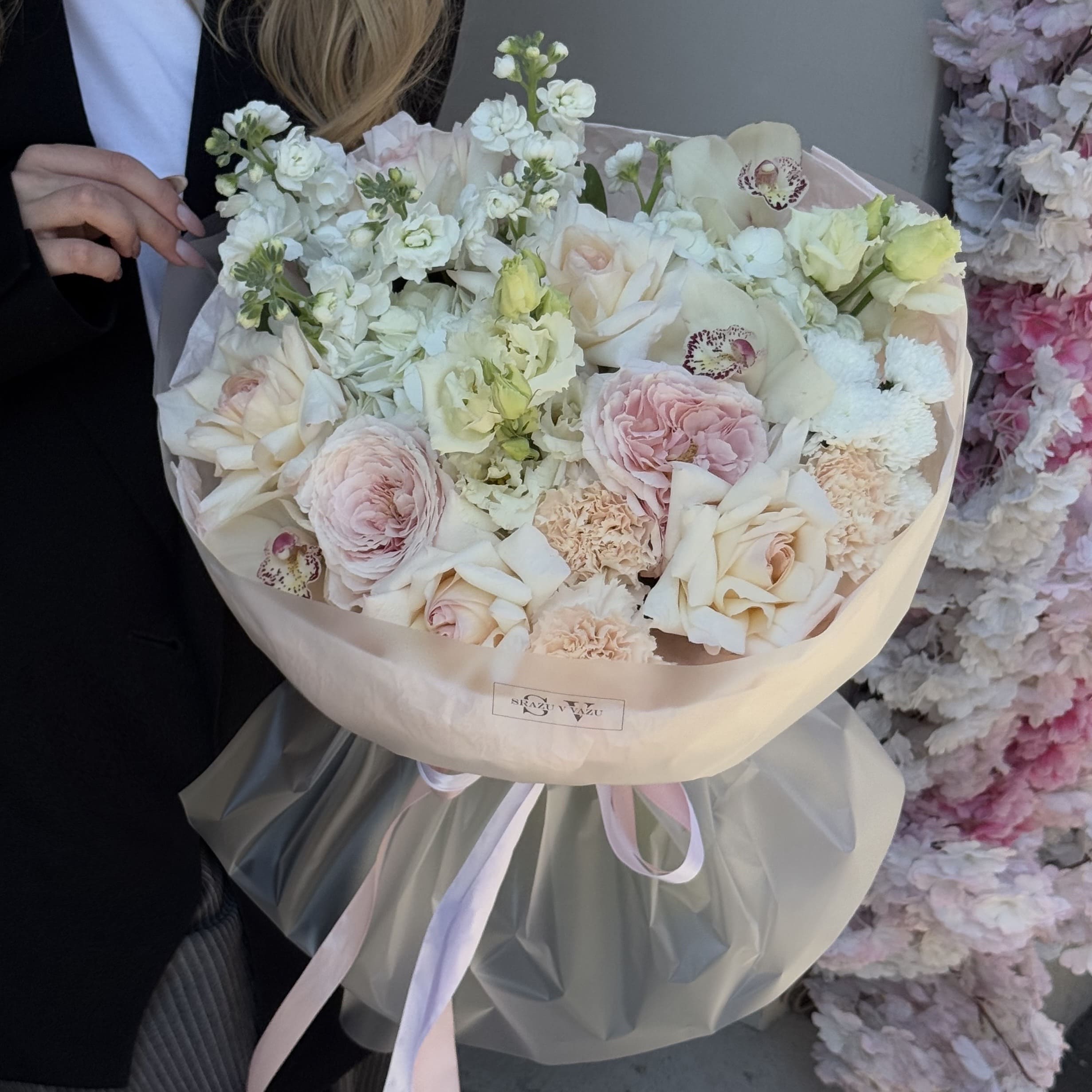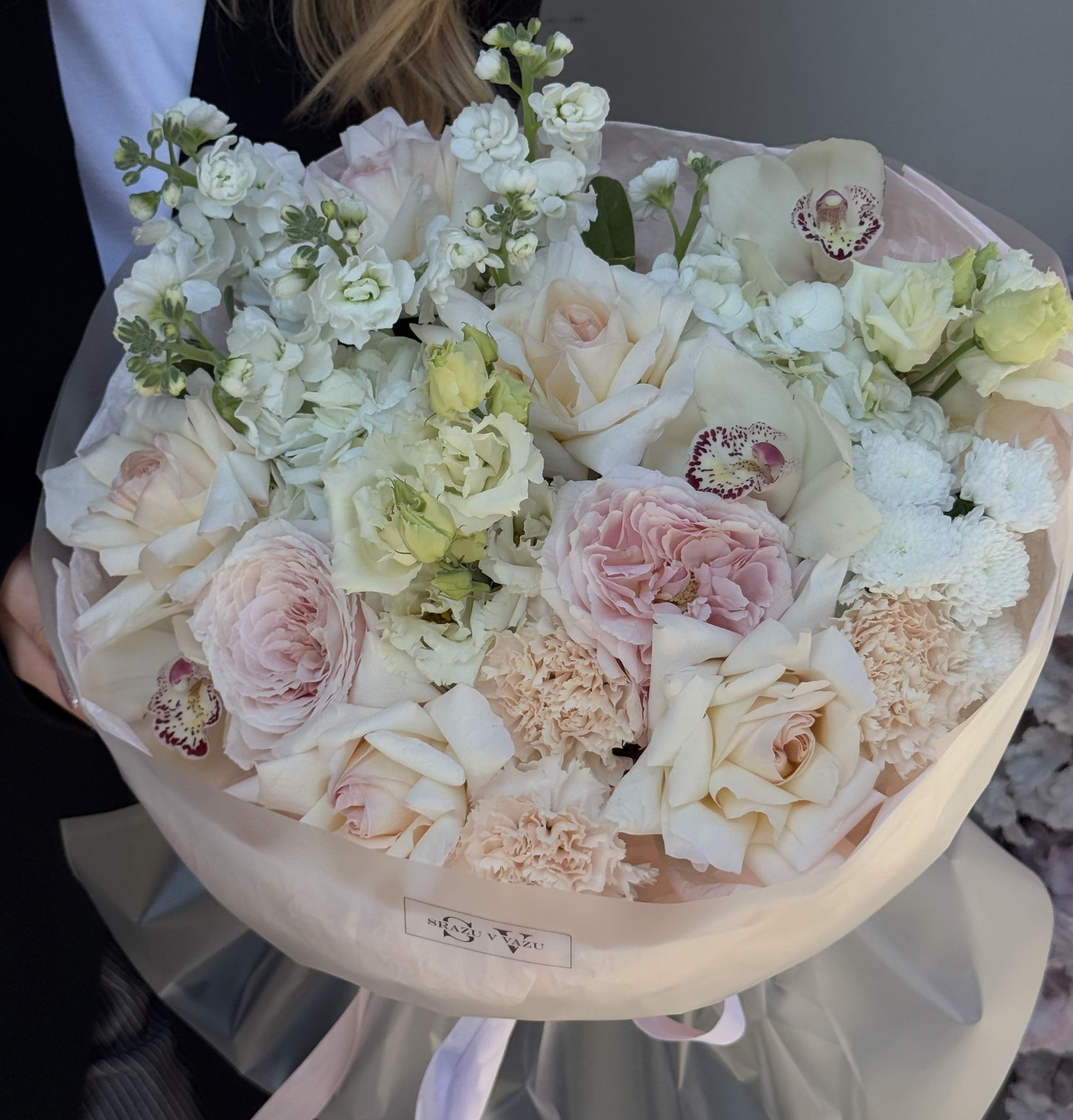 Авторский букет, в составе которого ароматная белая маттиола, стойкие орхидеи, пионовидная японская роза TSUMUGI, хрупкие диантусы в кремовом оттенке, белые шапочки гортензий, из которых выглядывают эустомы и сантини. Аромат букету придают французские розы сорта WHITE O'HARA