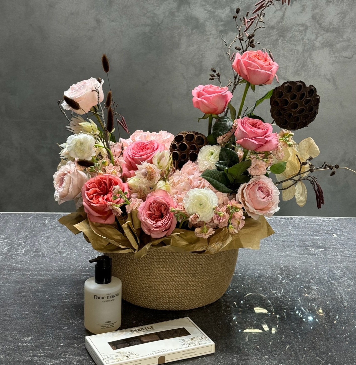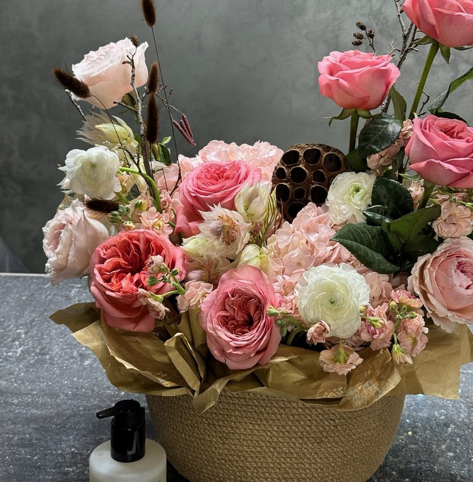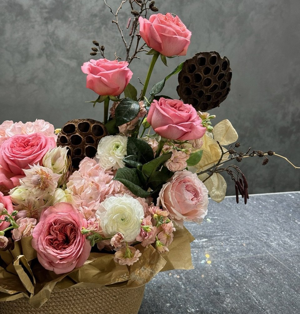 Необычная ассиметричная композиция в вегетативном стиле - оригинальный выбор. Благодаря контрасту темно-коричневых сухоцветов, садовой розы сложного оттенка ,нежнейшей гортензии и белоснежных ранункулюсов, создается органичный, цветочный тандем