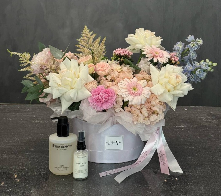 Авторская композиция в коробке шайбе отлично подойдет как для презента, так и в качестве украшения праздничного стола. Нежное пастельное сочетание от белоснежного до конфетного розового, и немного голубого дельфиниума для акцента.