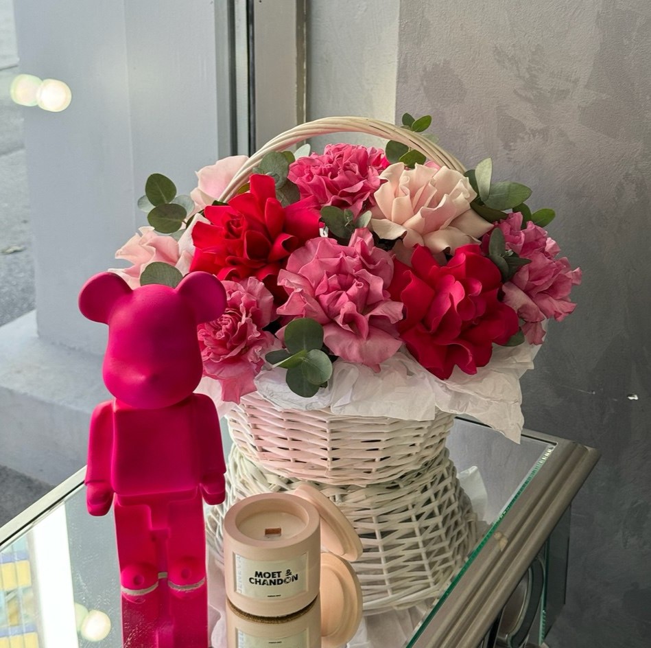 Потрясающий градиент цвета и разнообразие фактур нежнейших лепестков французских премиальных роз сортов Pink Mondial, Pink Floyd, Country Blues. Одновременно нежный и яркий, ароматный тандем с освежающей ноткой зеленого эвкалипта