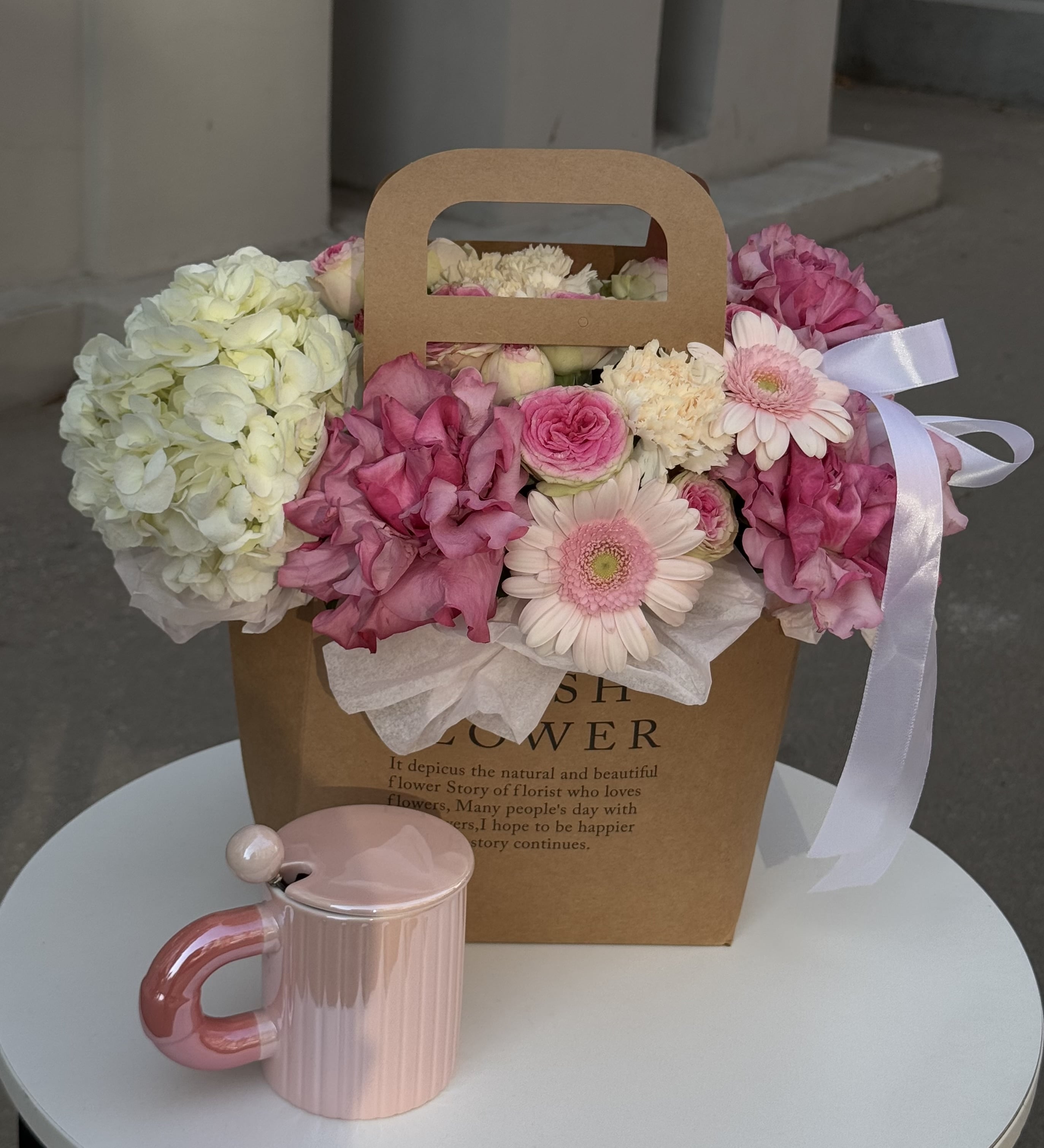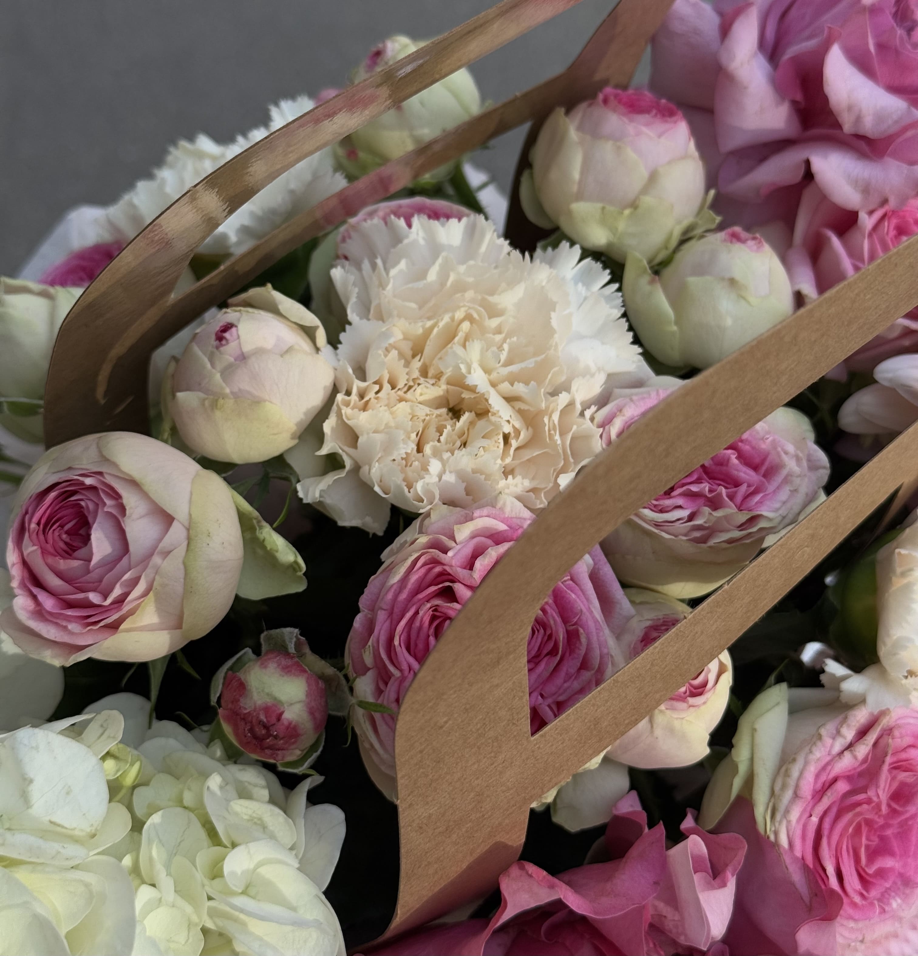 Изысканная композиция в крафтовой сумочке — гармоничное сочетание гортензий, французских и кустовых роз, гермини и диантусов в нежных тонах. Мягкая палитра и натуральная упаковка создают уютную и романтичную атмосферу