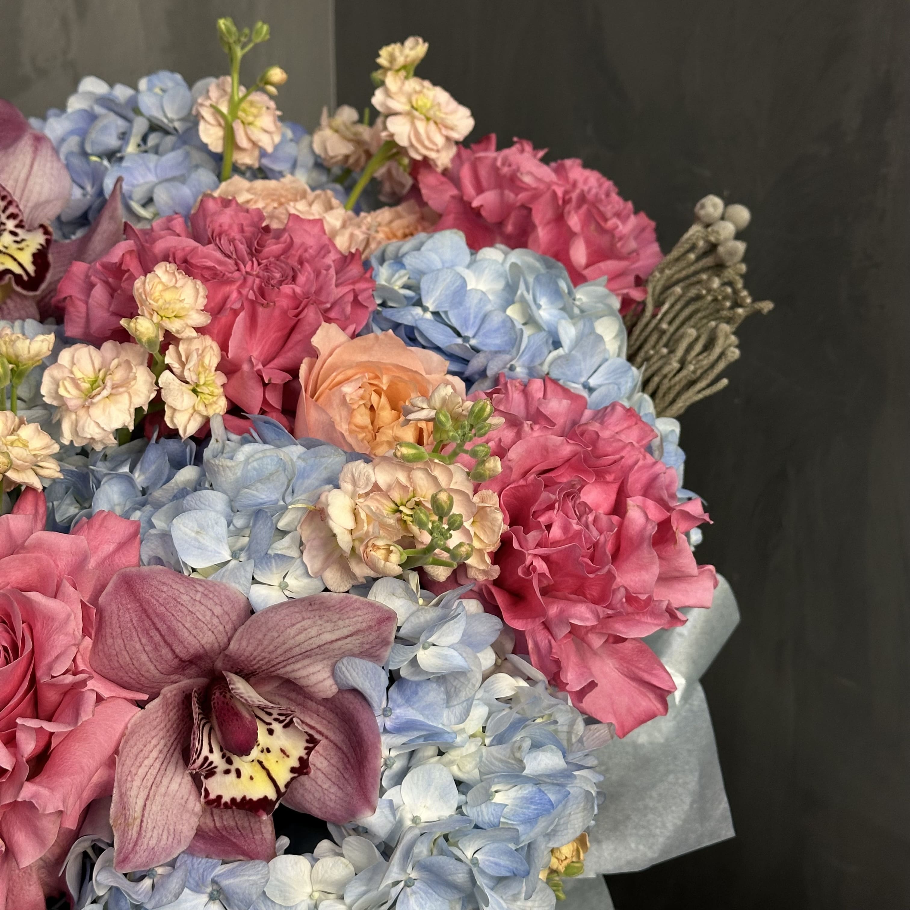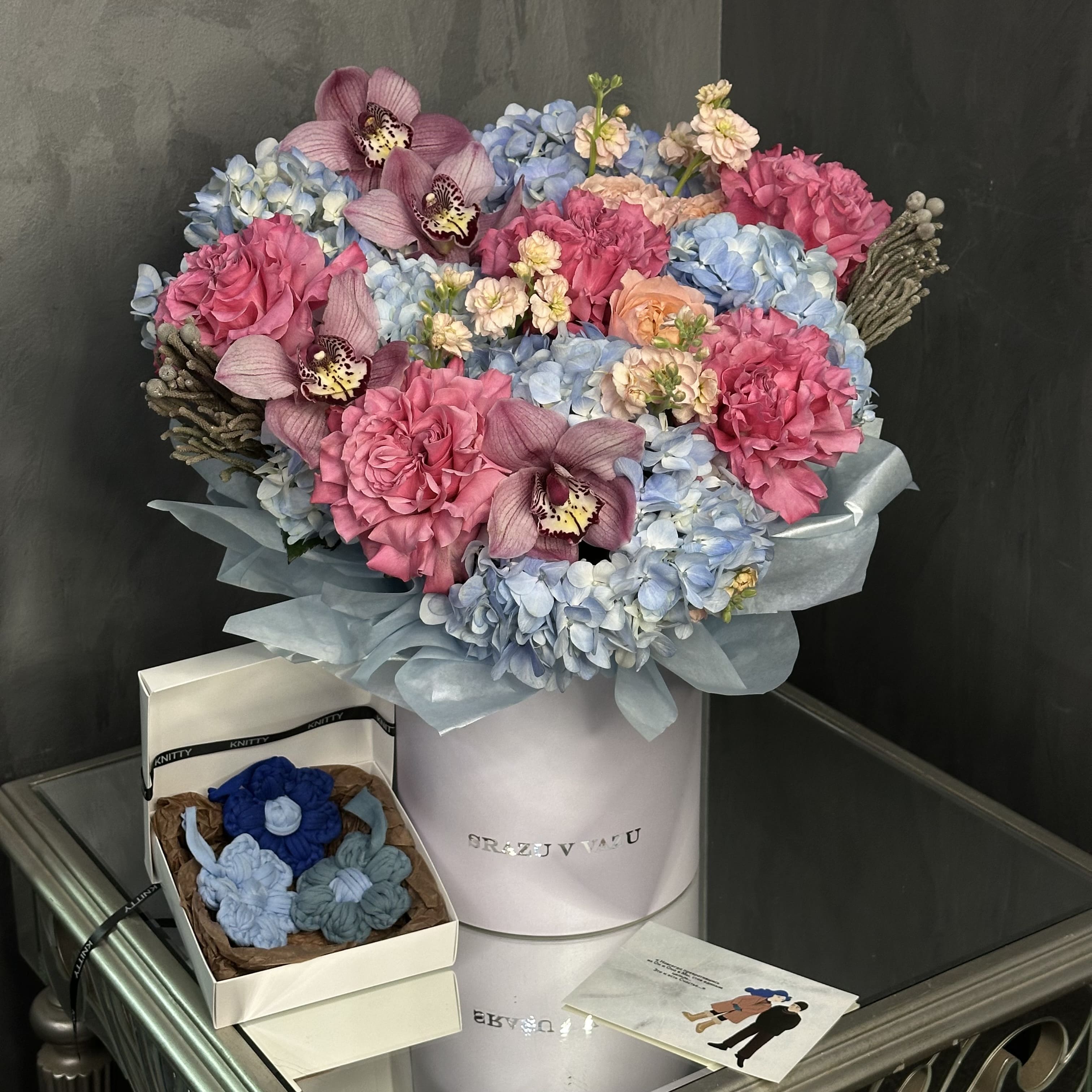 Композиция из голубой гортензии, винной орхидеи, ароматных французских роз, маттиолы и диантусов — изысканная палитра и нежная фактура. Объёмная, естественная аранжировка в шляпной коробке, доминирующие голубые и лавандовые оттенки создают романтичное настроение.