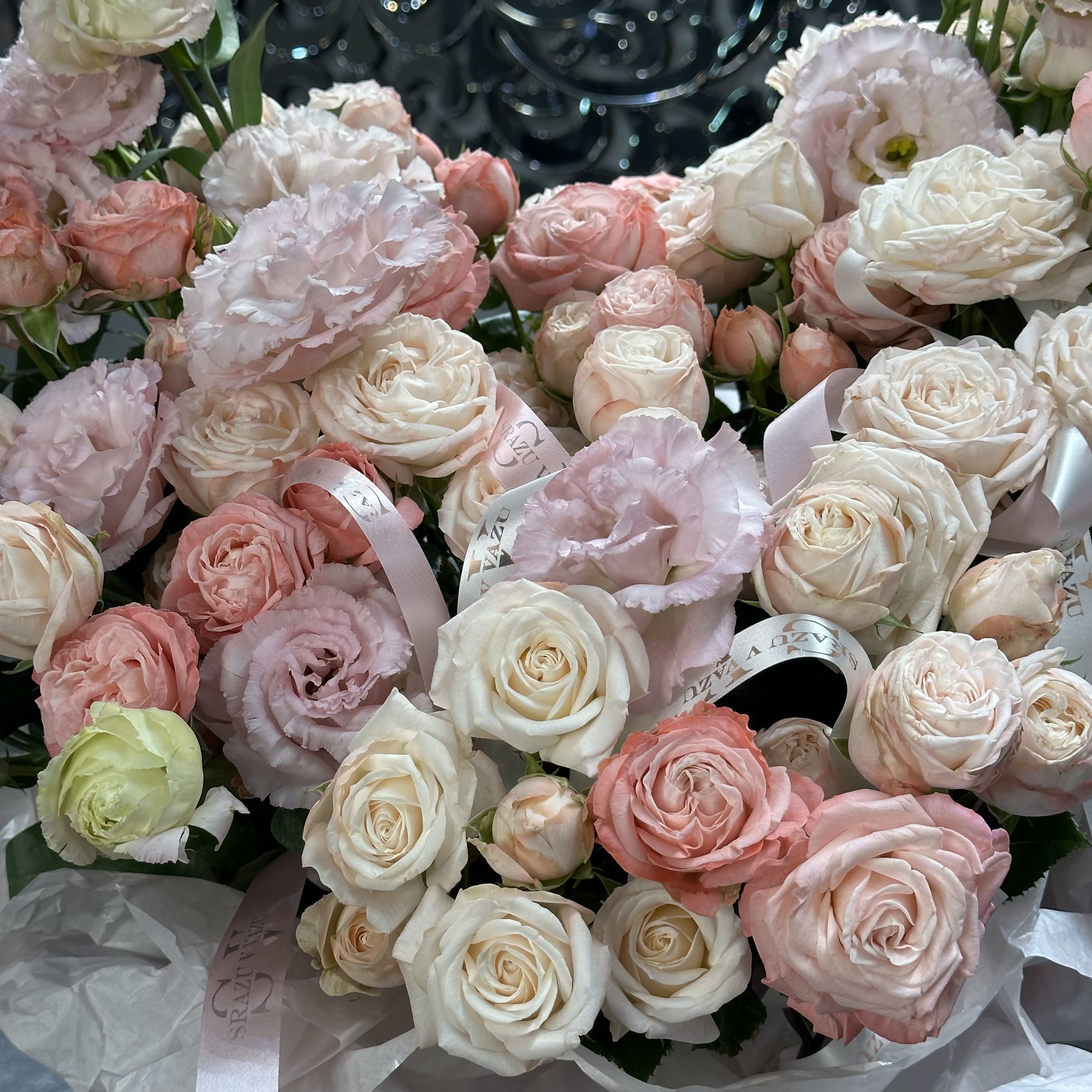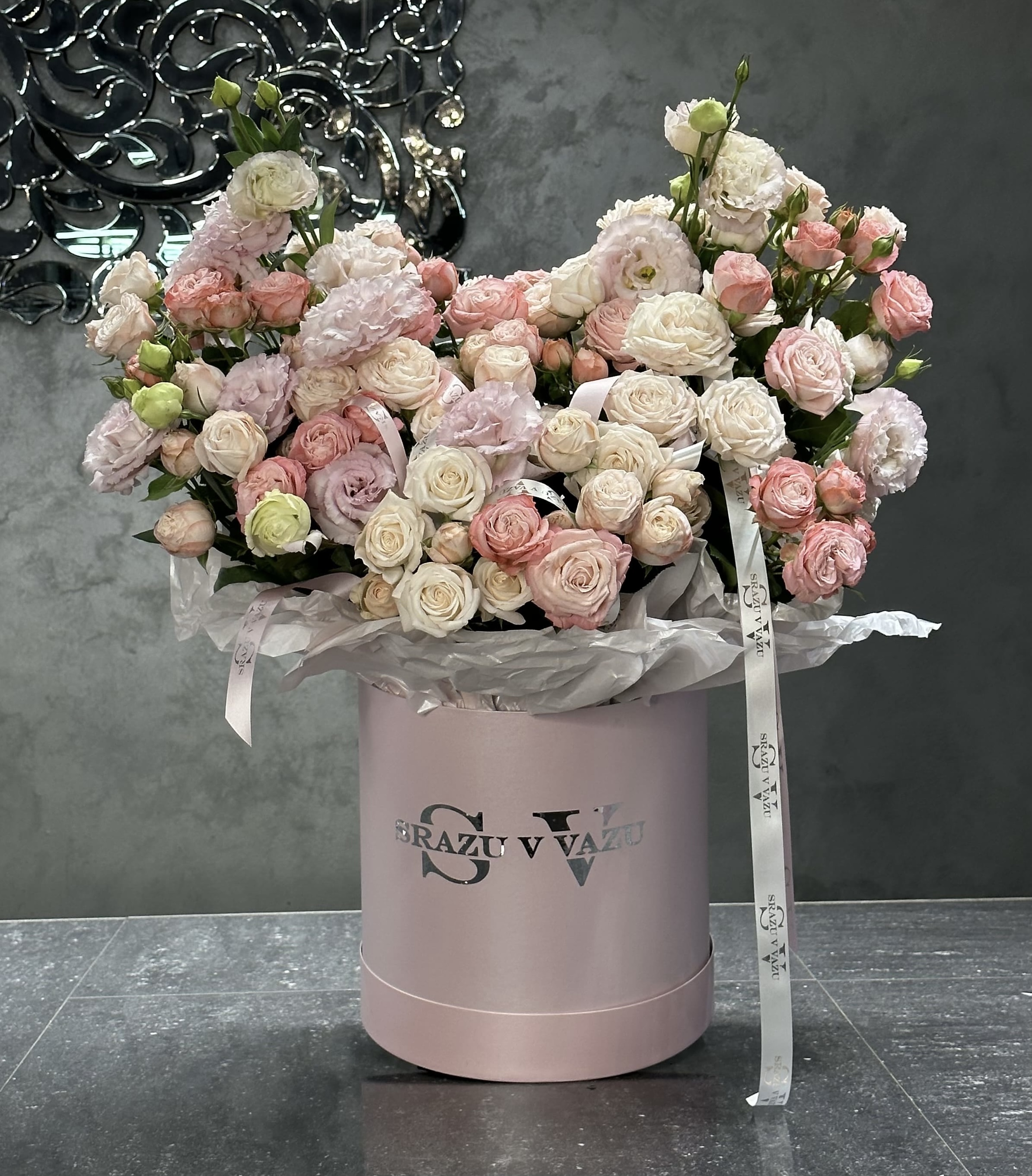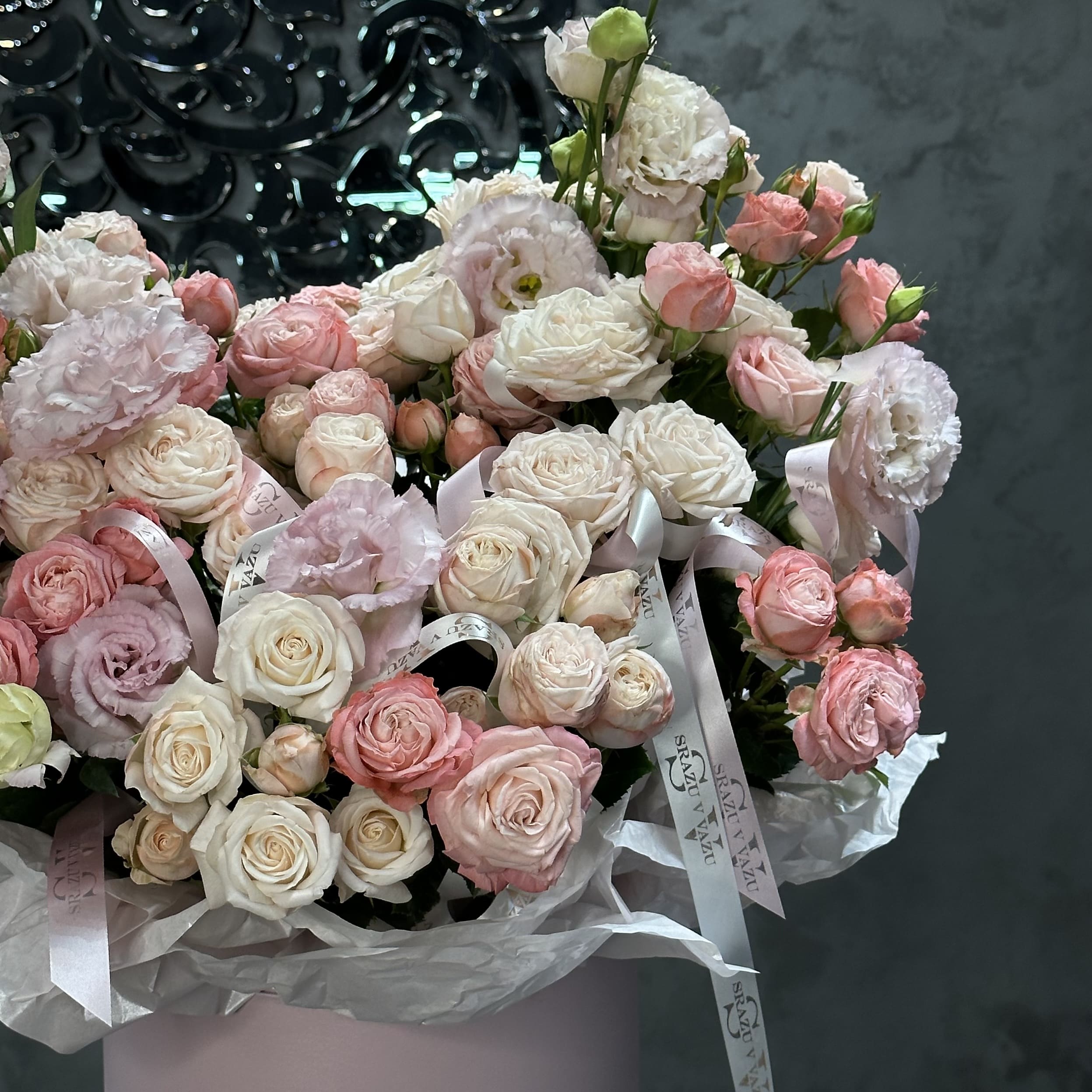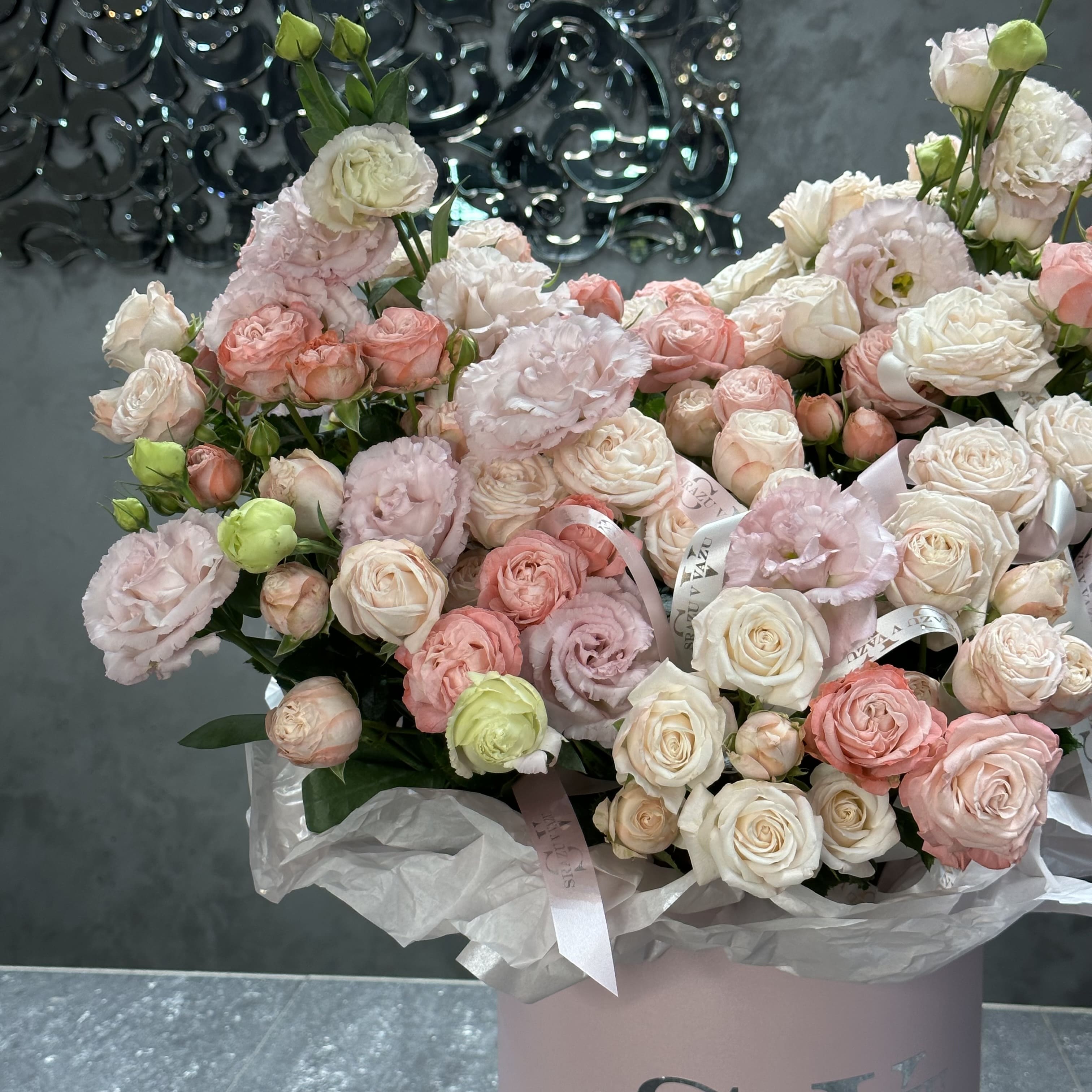 Роскошный бокс наполнен множеством кустовых роз, создающих атмосферу уюта и романтики. В сочетании с изящными эустомами он приобретает особую элегантность и гармонию. Такой букет идеально подойдет для выражения любви, благодарности или поздравлений, подчеркивая искренние чувства и изысканный вкус.