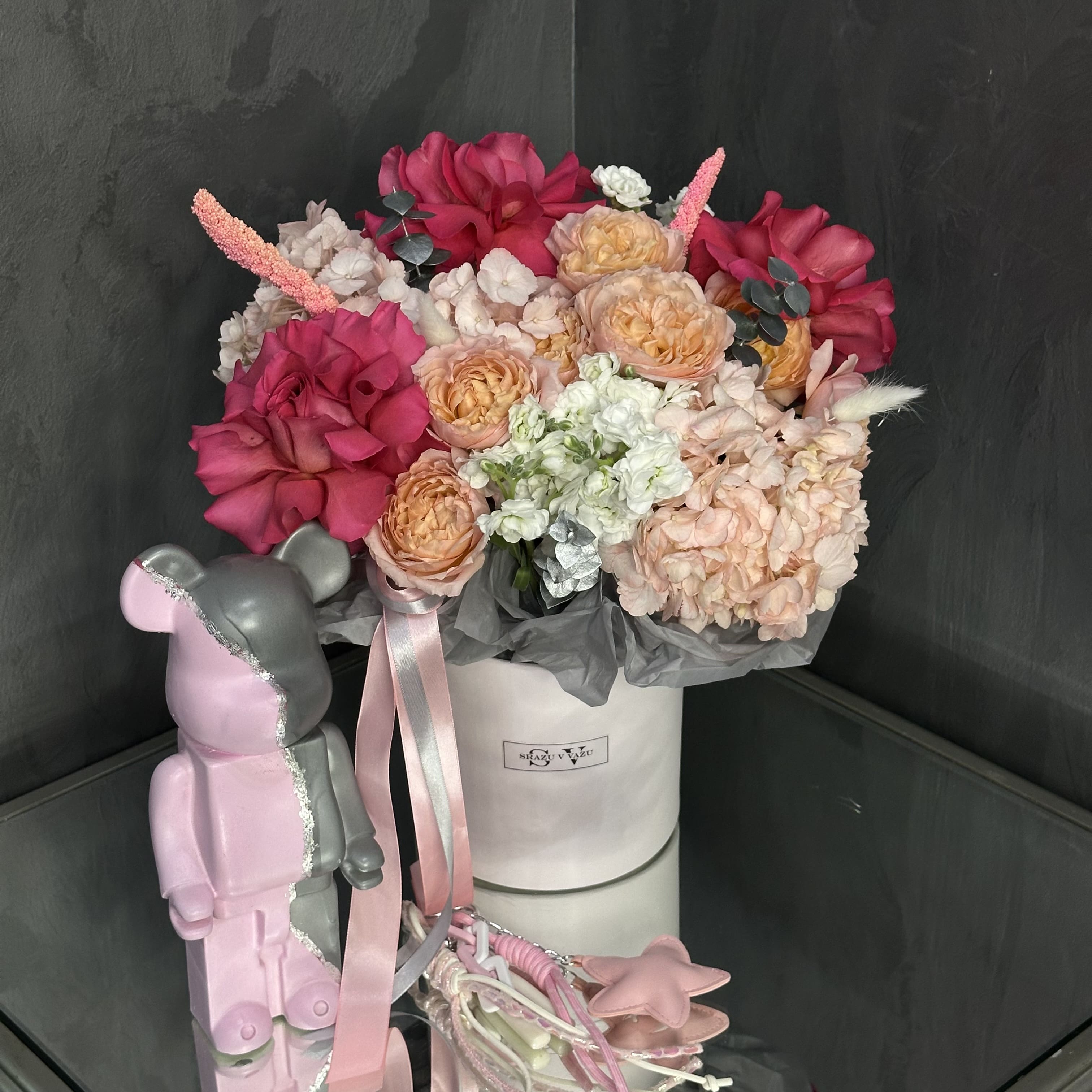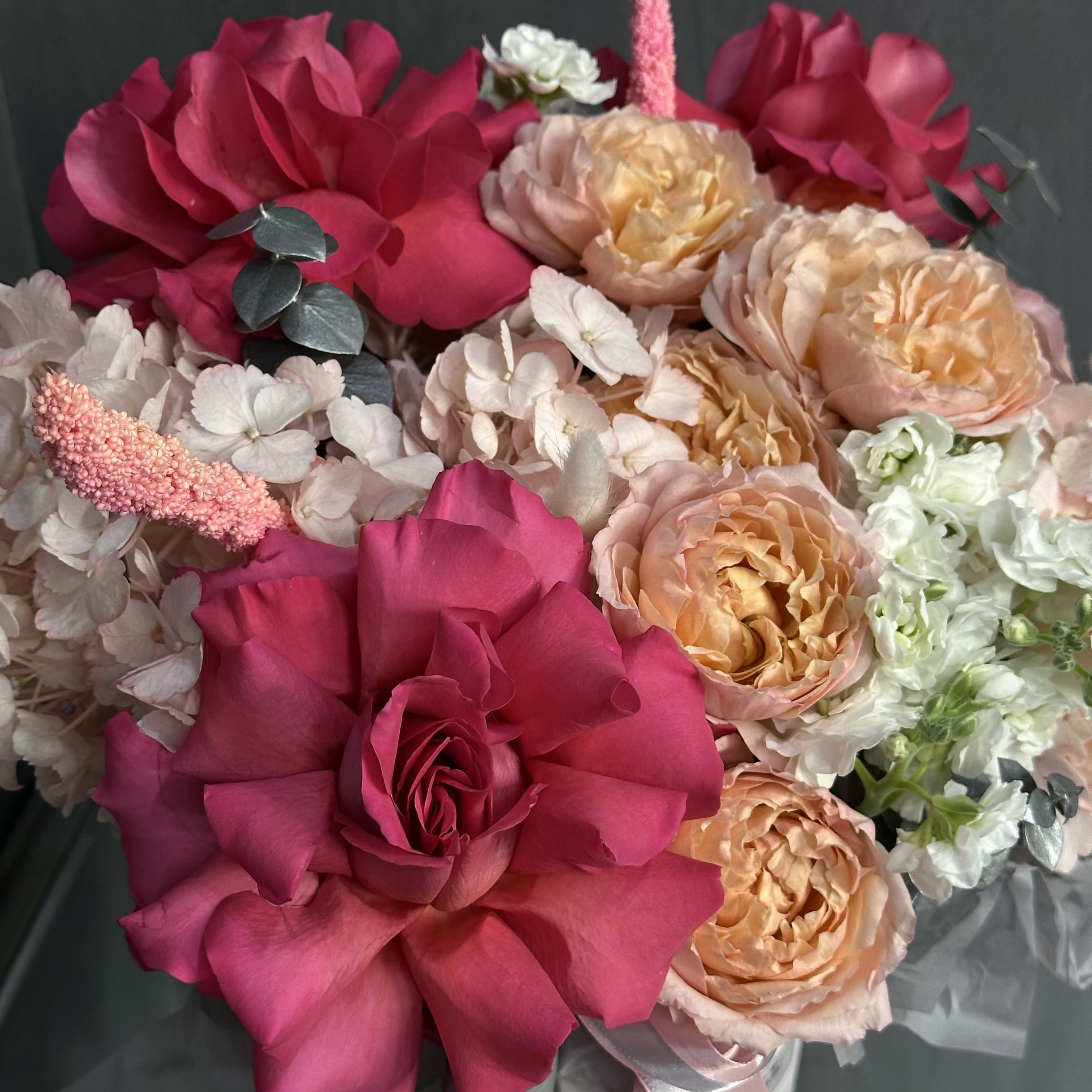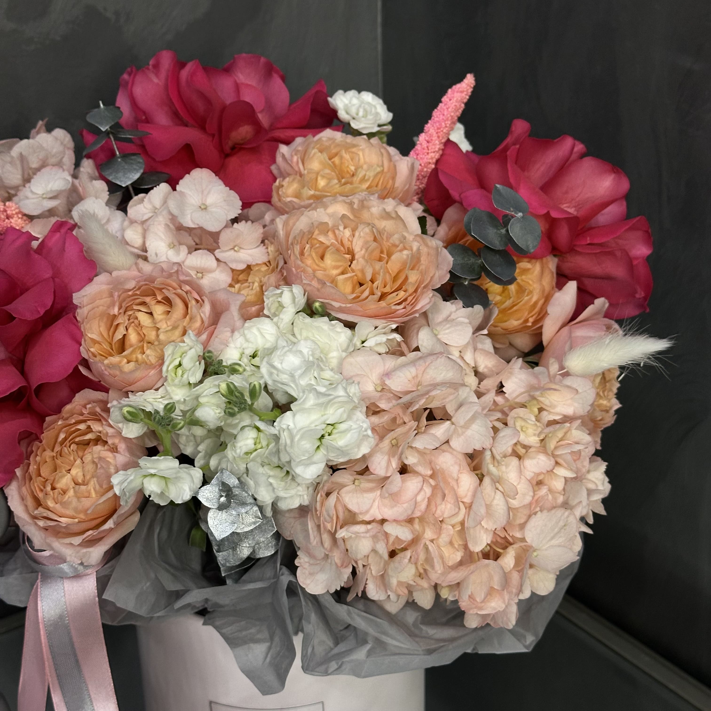 Композиция в шляпной коробке выполнена с особым вкусом и вниманием к деталям. Основу составляют яркие французские розы GOTCHA. Их дополняют пышные гортензии, придающие композиции объём и мягкость. Пастельные оттенки кустовых роз Джульетта вносят нотку нежности и романтичности, подчёркивая деликатность момента.