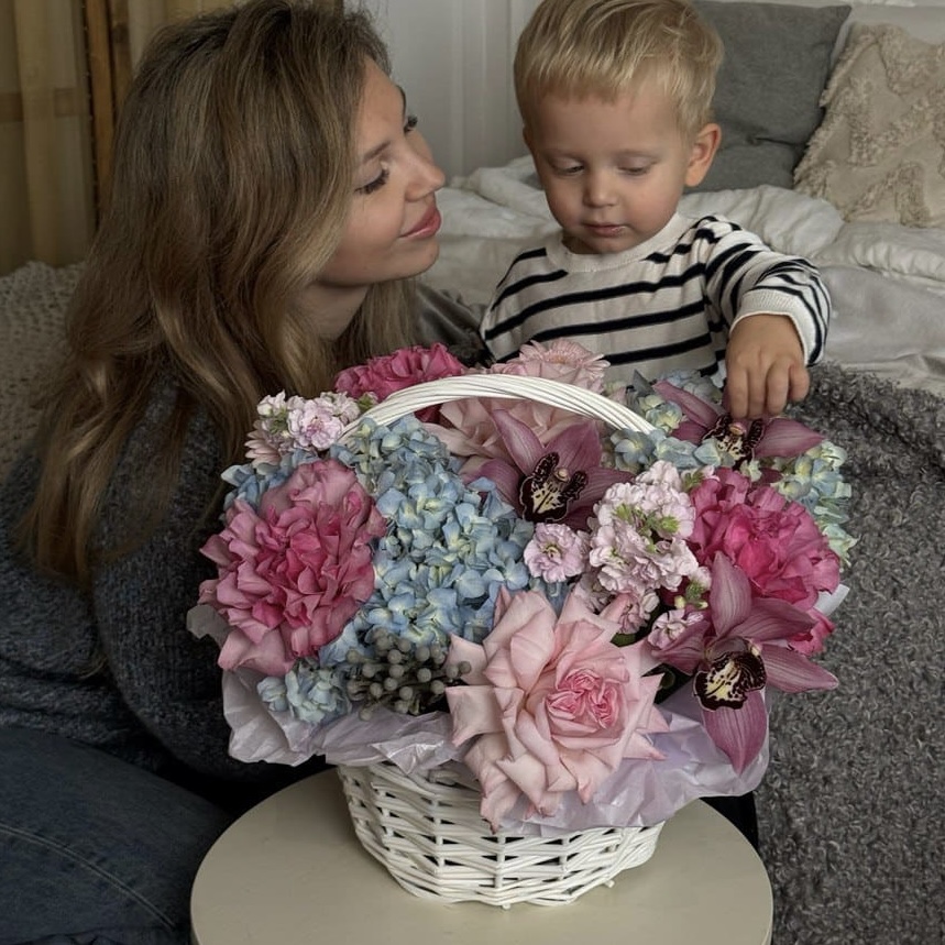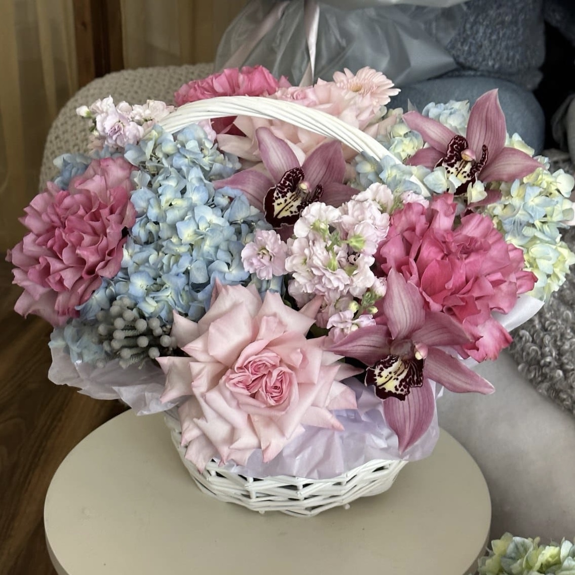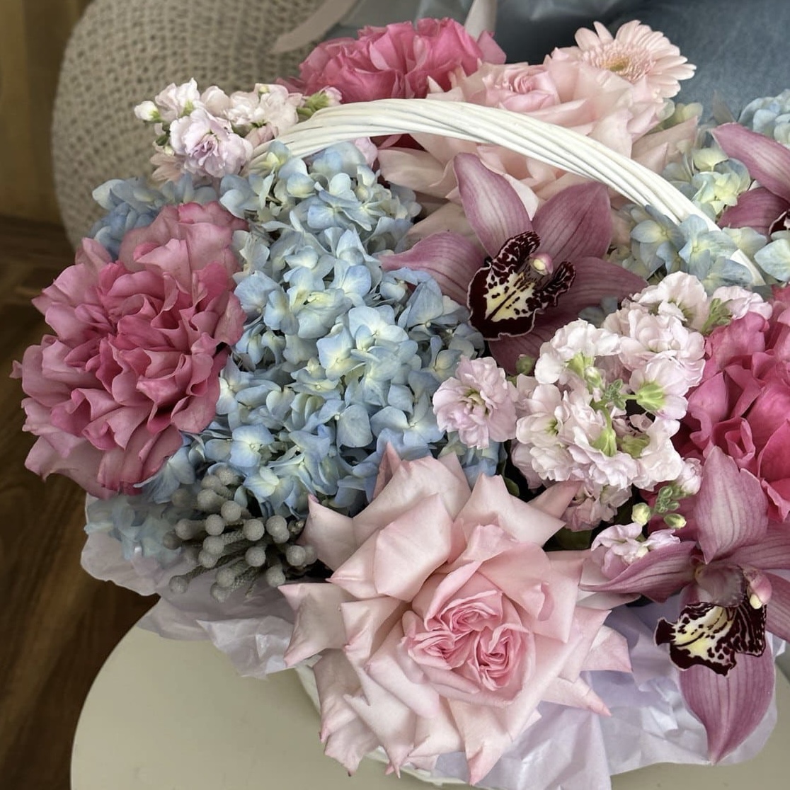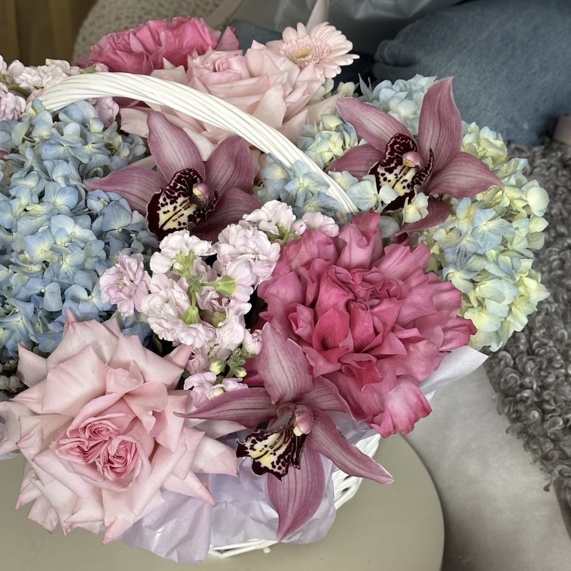 Заказать Авторская корзина с гортензией, орхидеей и розами с доставкой по Самаре