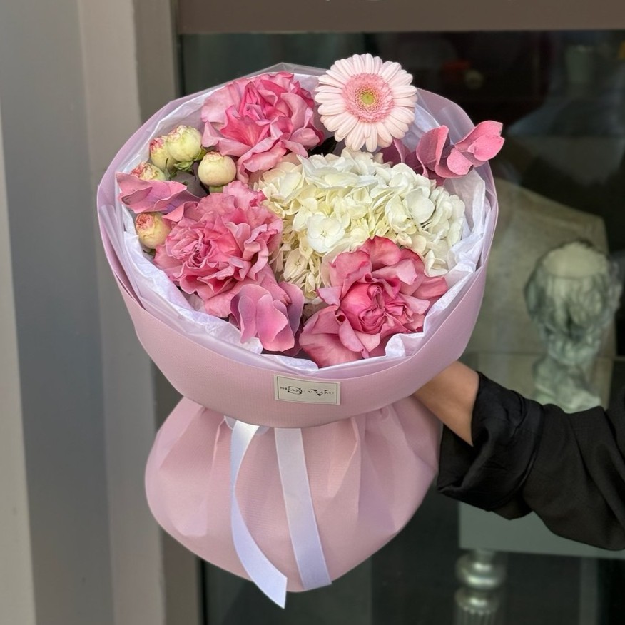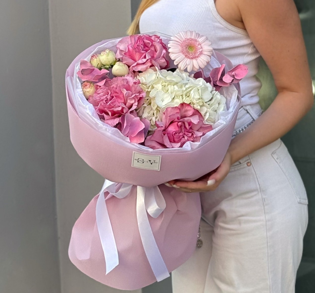 Нежный, чувственный, розовый букет с прекрасным сочетанием пионовидных роз Country Blues и ярко-розового эвкалипта. Белая гортензия добавляет букету объем и глубину, а нежно-розовая гермини - игривости