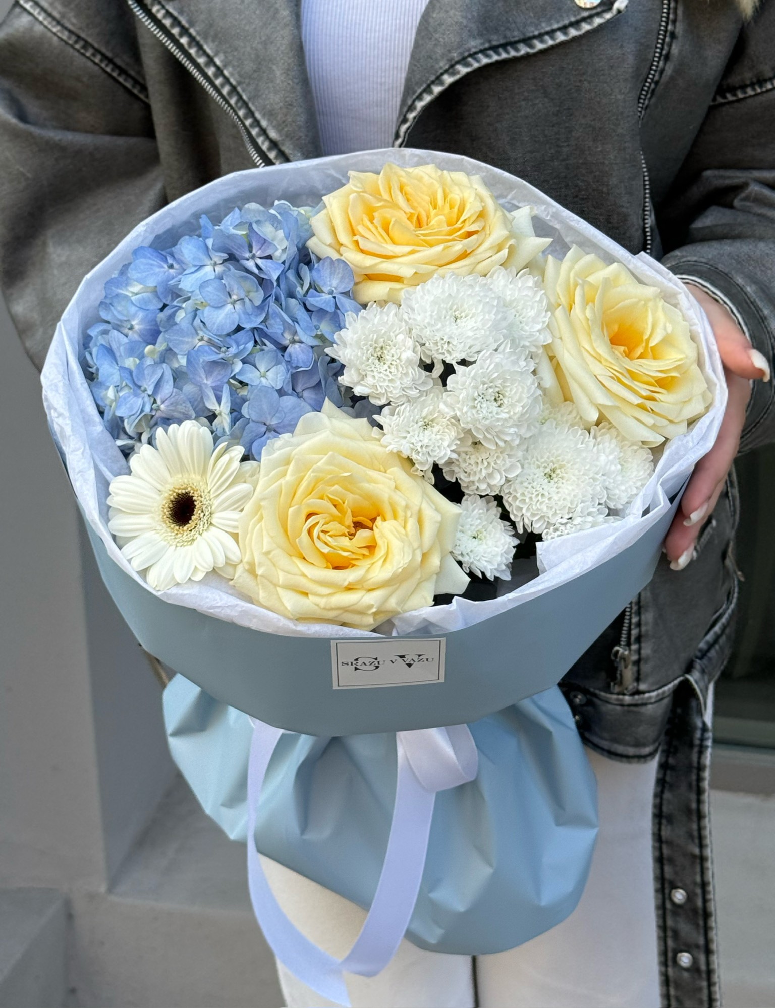 Нежный и стильный букет с завораживающей, как свет тлеющей свечи, розой сорта Candle Light и хрустящей голубой гортензией. Такой букет точно придется по вкусу нежной и хрупкой персоне, а нейтральное сочетание цветов делает букет подходящим для любого повода.