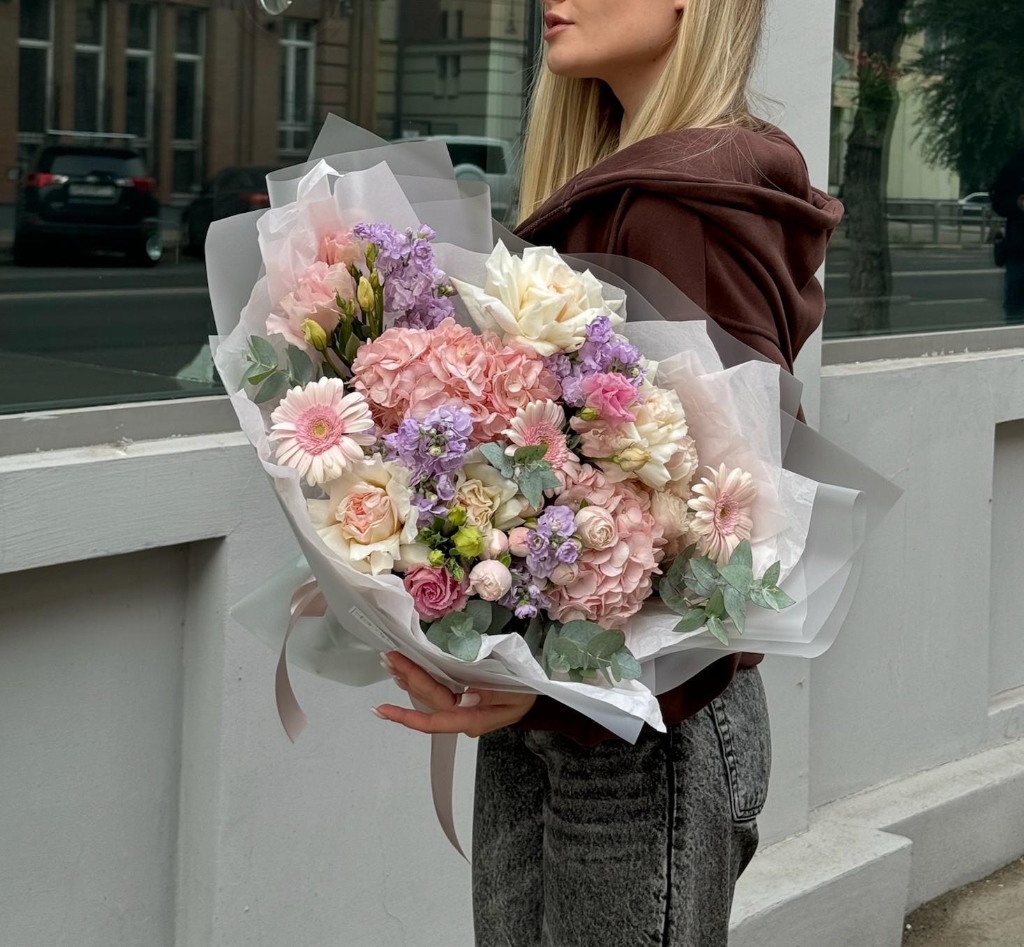 Раскидистый, колоритный букет с ярким весенним дельфиниумом, зефирной эустомой и пудрово-розовой гермини. Игривое сочетание, необычная форма и яркие оттенки делают этот букет запоминающимся