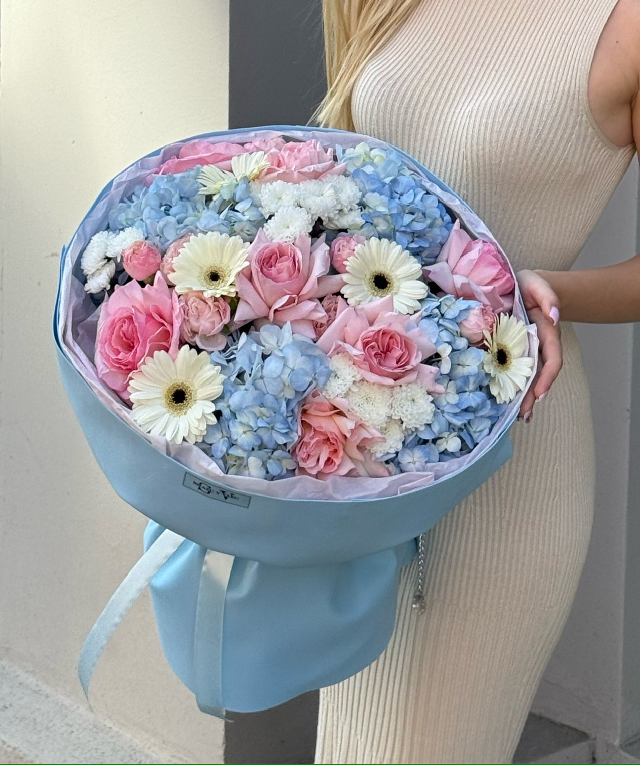 Нежный букет в розово-голубой гамме, с добавлением белоснежной хризантемы Сантини и парфюмированных роз сорта Pink O"Hara. Исключительно гармоничное сочетание, одновременно яркий и нежный, нежный голубой и розовый отлично дополняют друг друга, подчеркивая изящество и красоту.