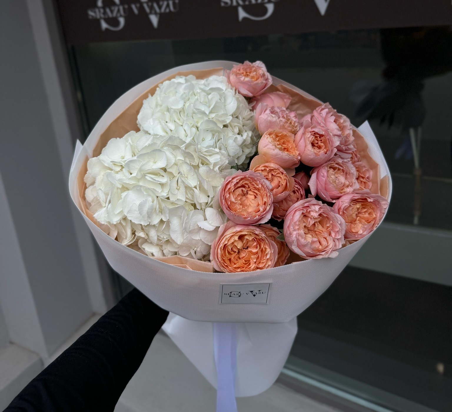 Дуо-букет из белой гортензии и пионовидных роз сорта Julliet. Мягкое и теплое сочетание, для тех кто любит минимализм и красоту.