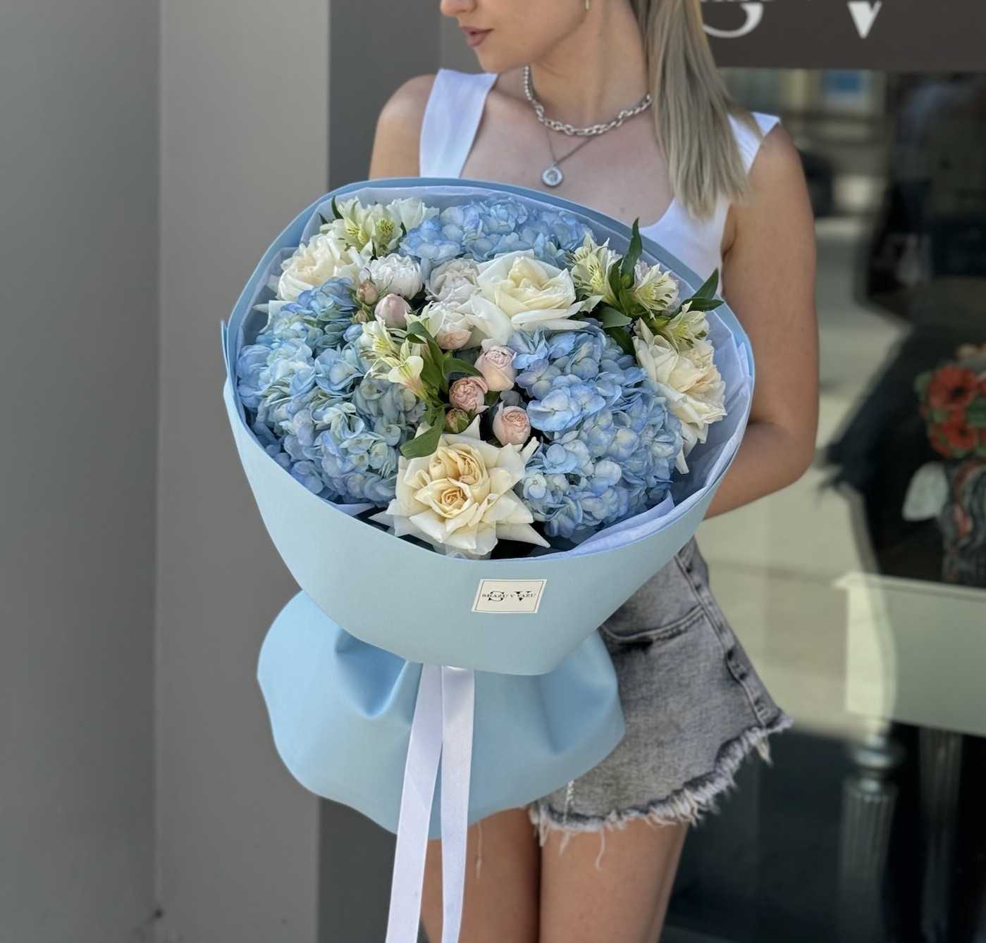 Букет из голубой гортензии, альстромерий и белых французских роз выглядит очень элегантно и свежо. Голубая гортензия, с её нежными цветами, создаёт ощущение лёгкости и воздушности. Альстромерии добавляют яркие акценты и разнообразие с их многоцветностью, в то время как белые французские розы придают букету утончённость и романтичность.
