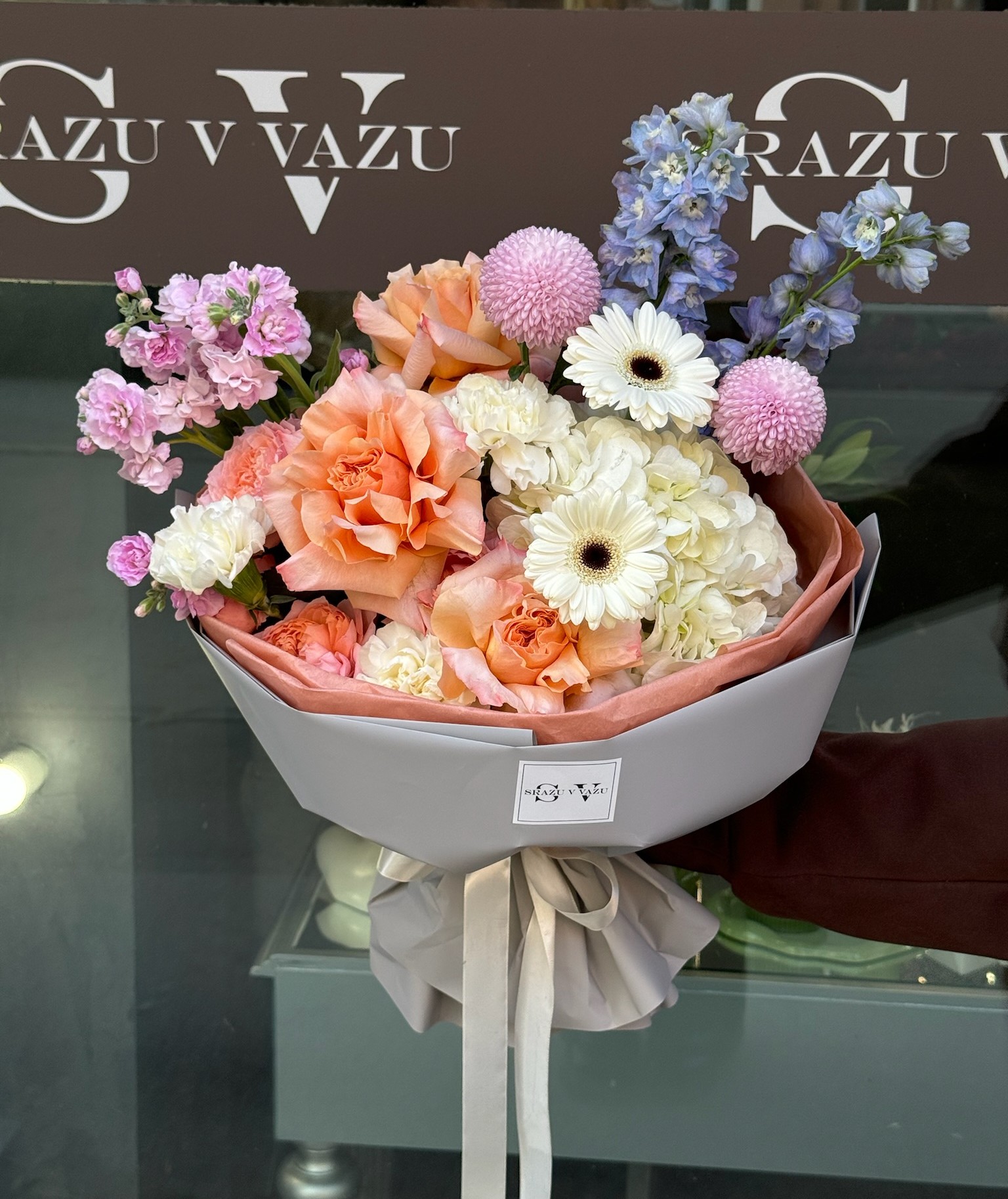 Настоящий взрыв цвета в букете. Невероятная триада ярких цветов: небесно голубой дельфиниум, нежно-лавандовая маттиола и персиковая французская роза сорта Hermosa. Этот букет создан чтобы удивлять и дарить непередаваемые эмоции