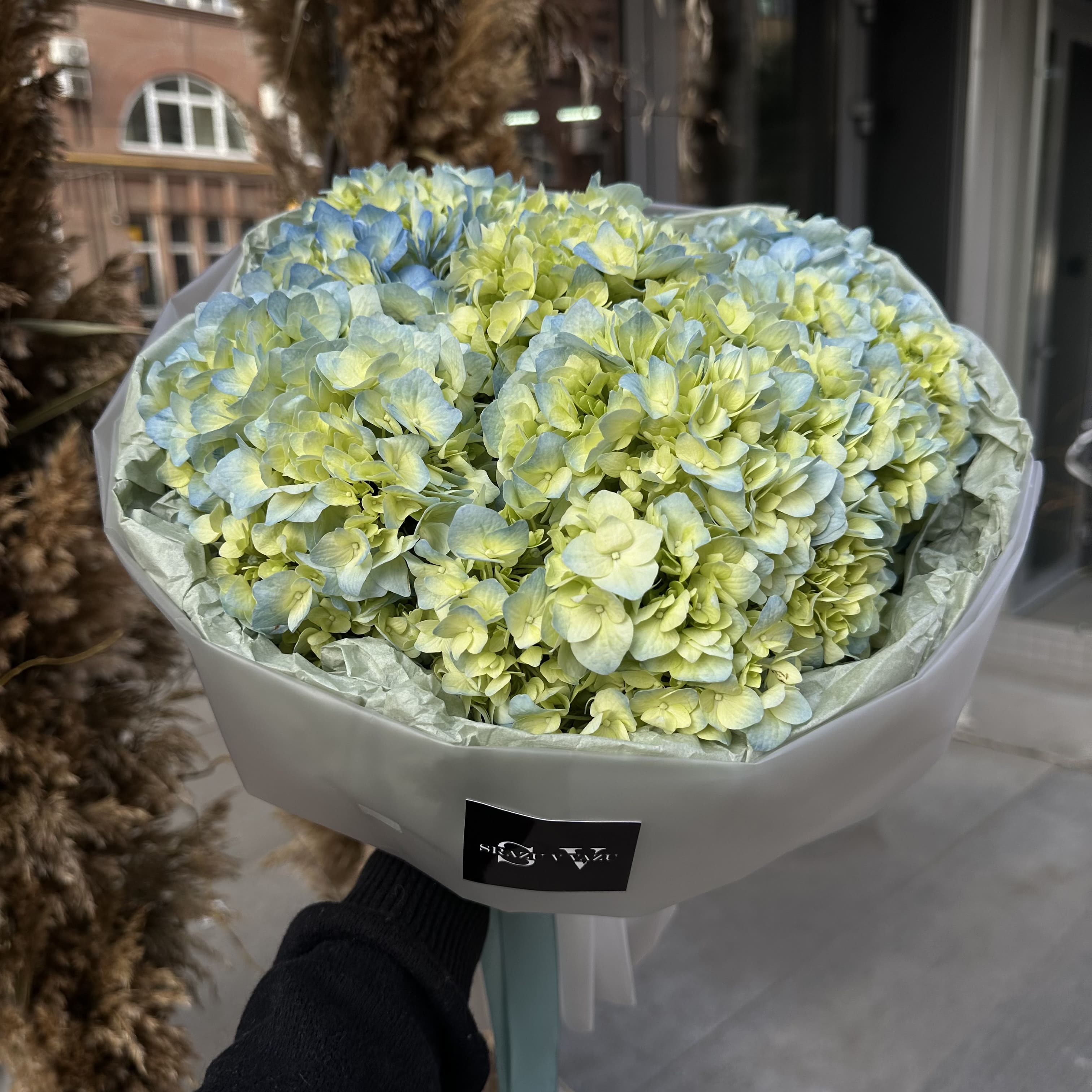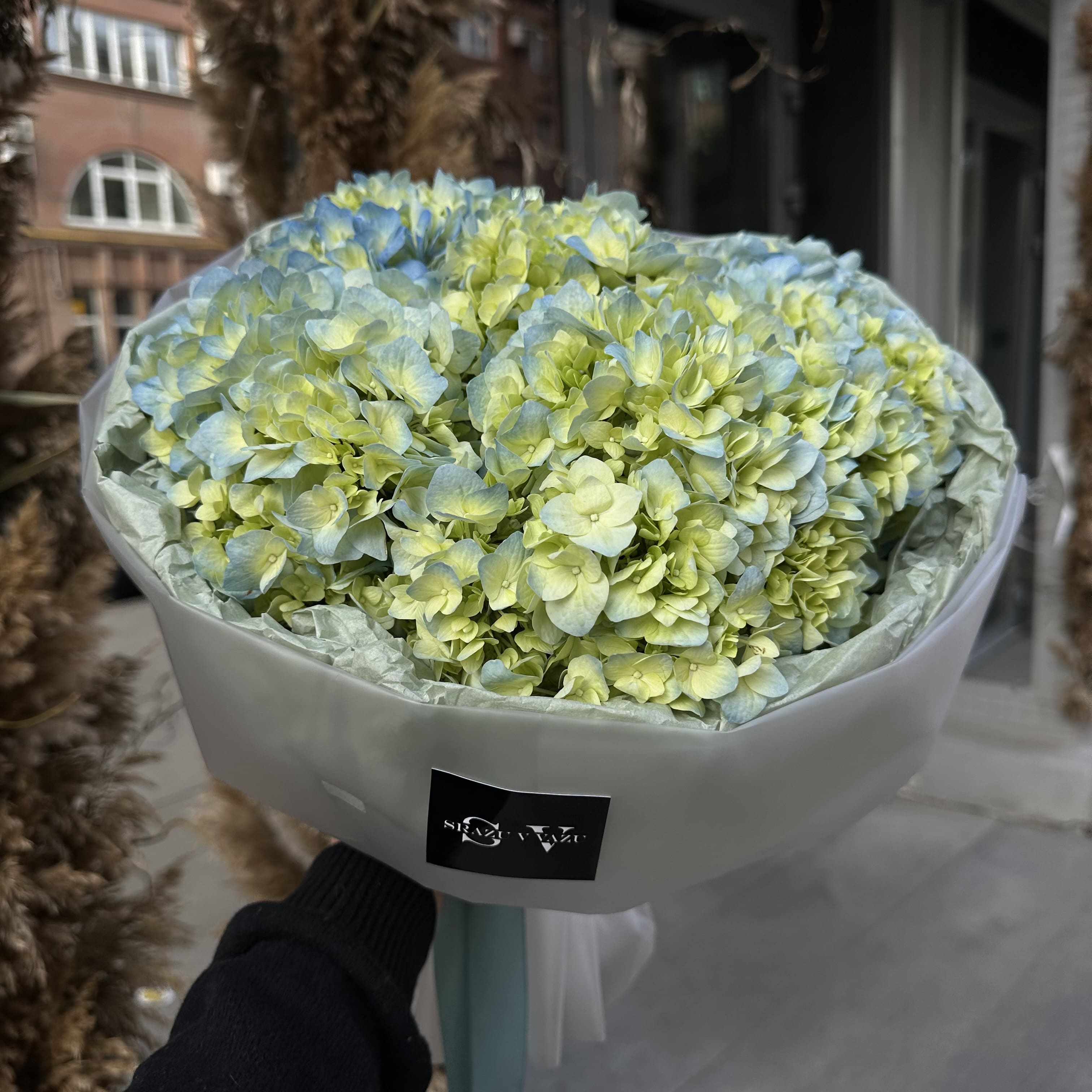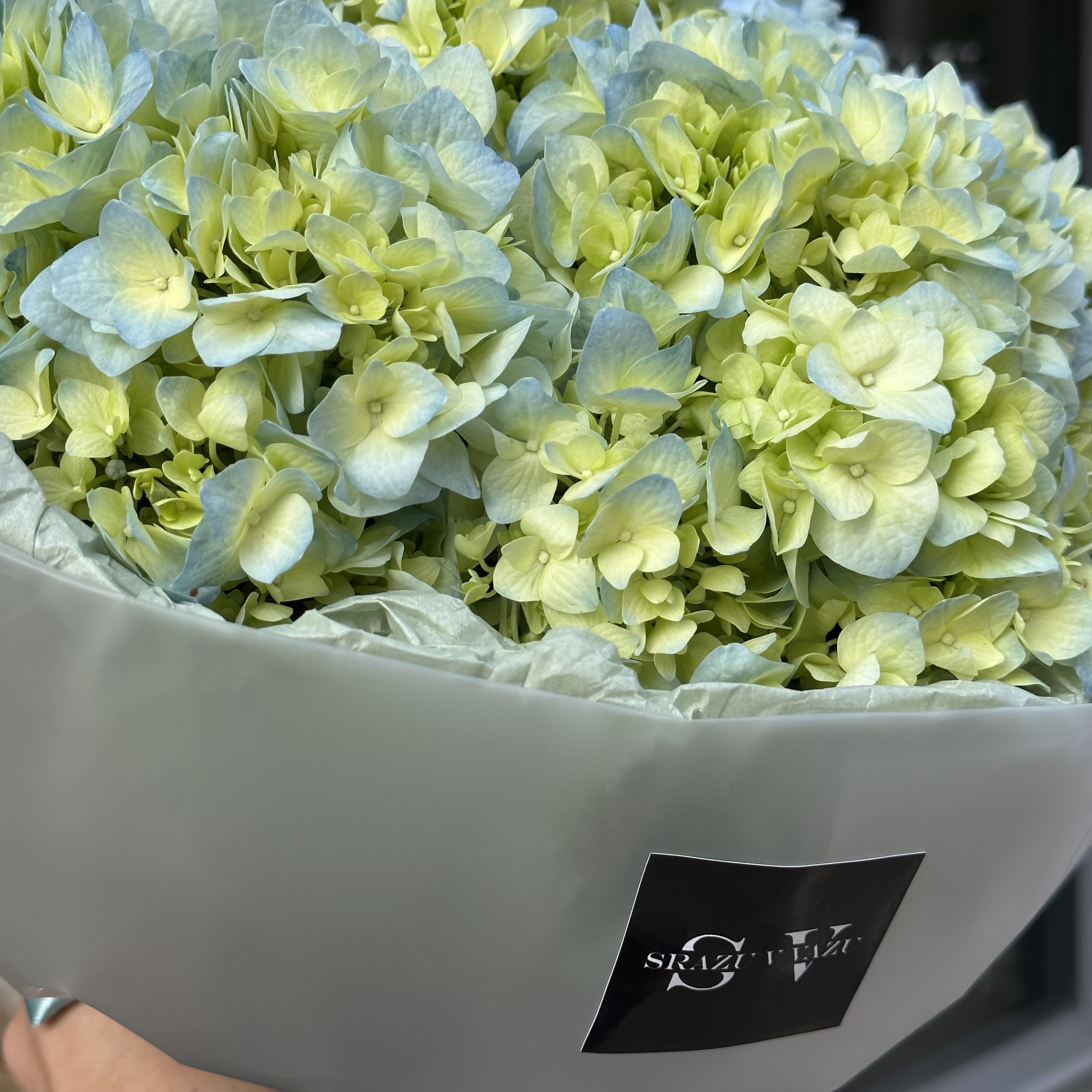 Настоящий взрыв цвета в букете. Яркие сочные голубые гортензии с зеленным оттенком