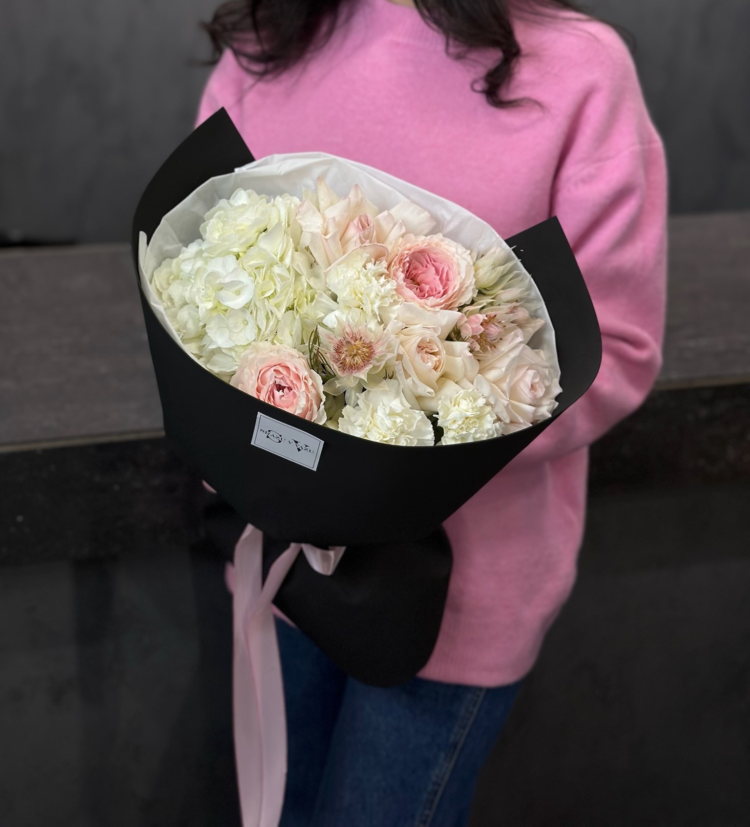 Нежный,бело- розовый букет в стильной упаковке из черного фоамирана - настоящая утонченная классика. Нежные пастельный оттенки серурии, премиальных пионовидных роз Tsumugi и французских роз делают букет легким и воздушным, а гортензия добавляет объема.