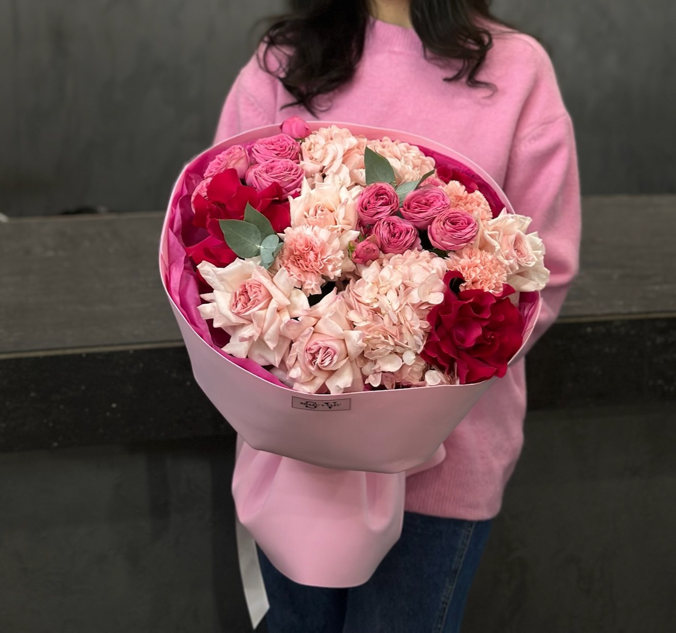 Ярко-розовый букет, состоящий из французских роз цвета фуксии, коралловой гортензии и кустовой розы, создаёт атмосферу страсти и энергии. Различные оттенки розового, цветы с их жизнерадостностью притягивают внимание и добавляют яркие акценты в любую композицию.