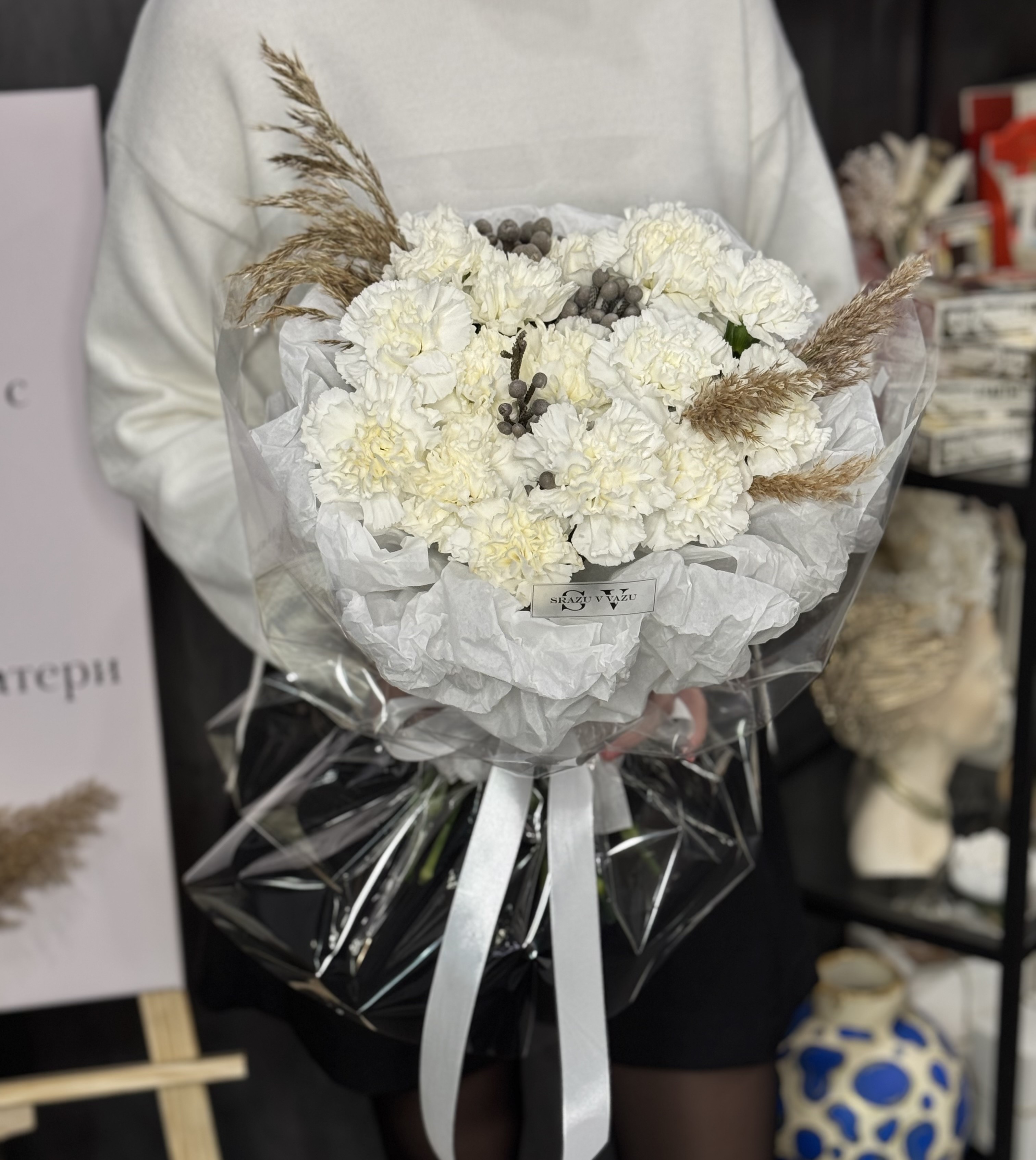Минималистичный авторский букет из белоснежных диантусов, серой изящноц брунии и воздушного пампаса. Легкая упаковка не отвлекает внимание от букета, а эстетичное сочетание природных фактур делает букет стильным, элегантным и воздушным.