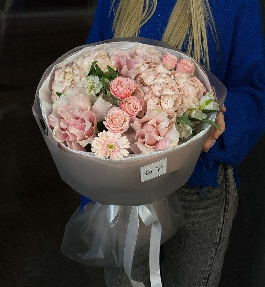 Нежный свежий букет, состоящий из альстромерий, французской розы Pink Mondial и кустовой розы создаёт атмосферу чистоты и утончённости. Нежный розовый оттенок гортензии, элегантные французские розы и свежесть альстромерий гармонично сочетаются, придавая композиции воздушность и лёгкость. Идеальный выбор для любого важного повода в Вашей жизни.