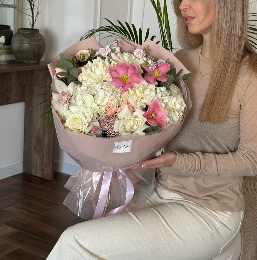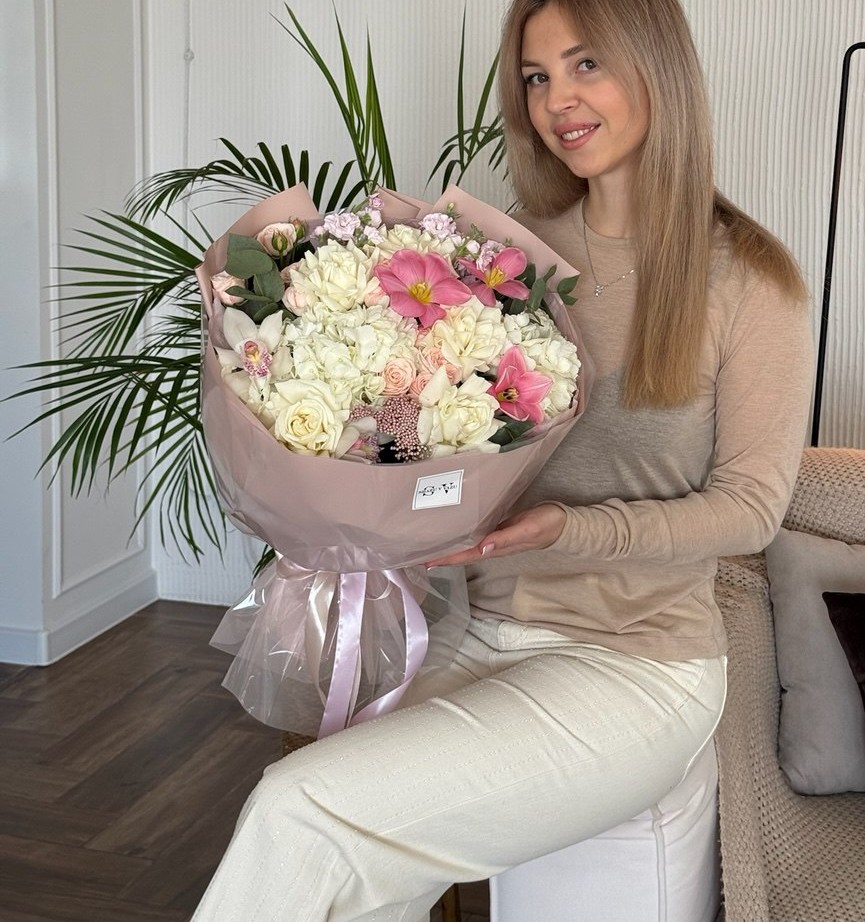 Заказать Авторский букет с тюльпанами, гортензией и розами с доставкой по Самаре
