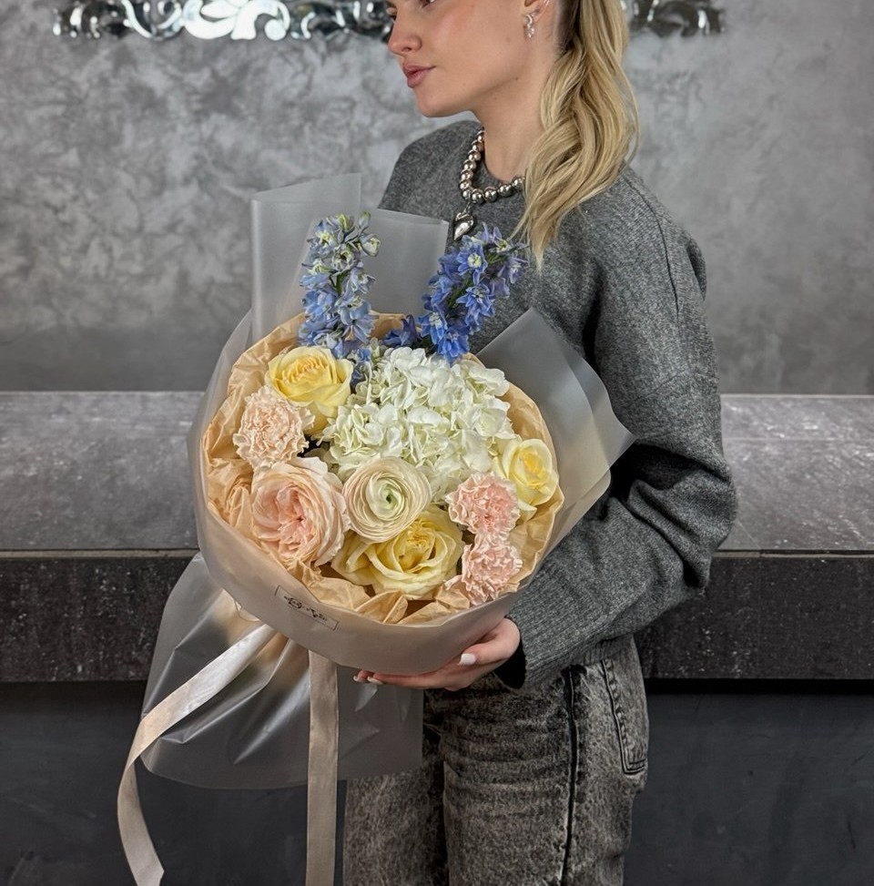 Кремовое, чарующее сочетание нежно-розовых роз, гортензии, пастельных ранункулюсов с акцентным ярко-голубым дельфиниумом- элегантный и стильный выбор, для нежной получательницы, которая ценит нежность, с небольшой яркой изюминкой