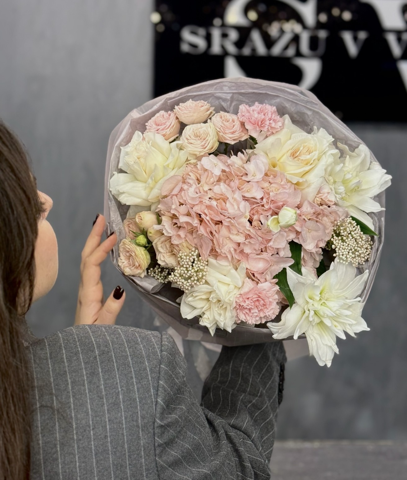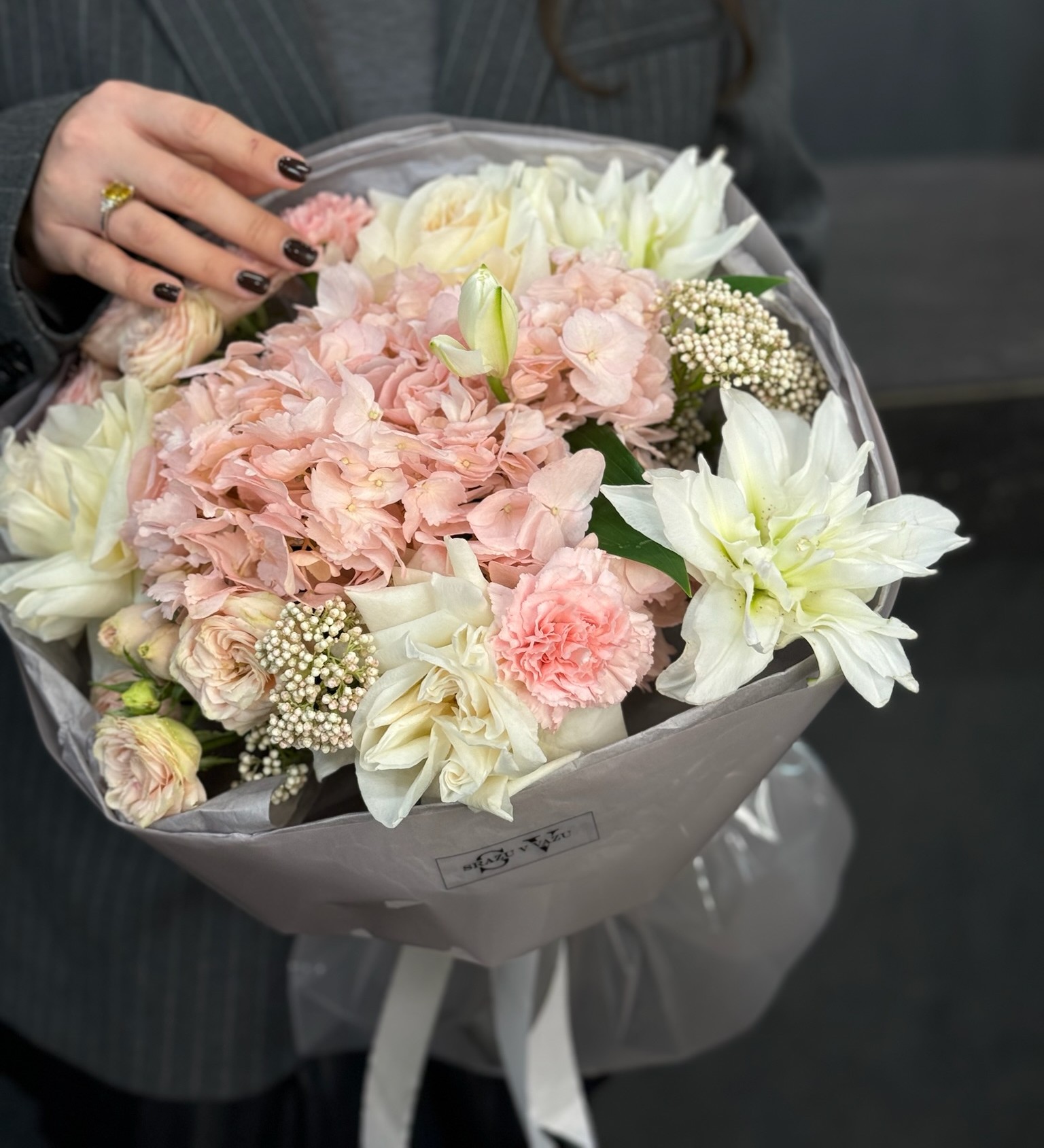 Бело-розовый букет, особенно с добавлением лилий и гортензий, выглядит очень элегантно и романтично. Лилии с их крупными, изящными цветами придают букету утонченность и величие, в то время как гортензии добавляют ему пышность и объем. Белые цветы символизируют чистоту и невинность, а нежно-розовые оттенки придают теплоту и мягкость.