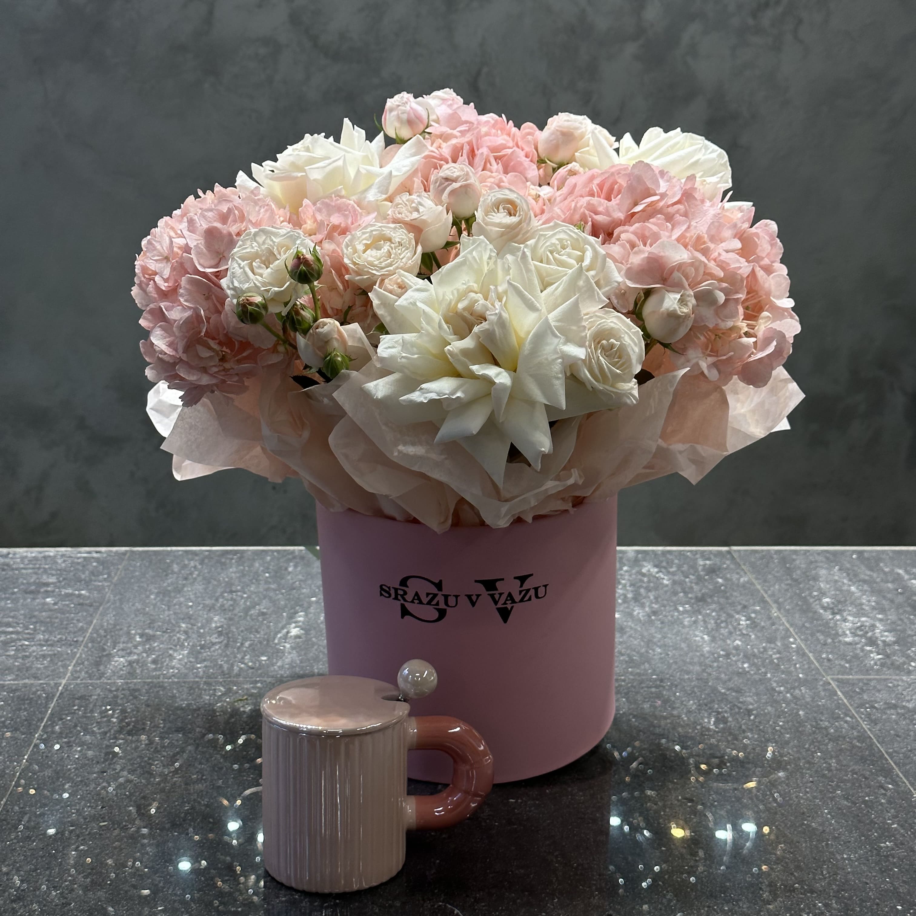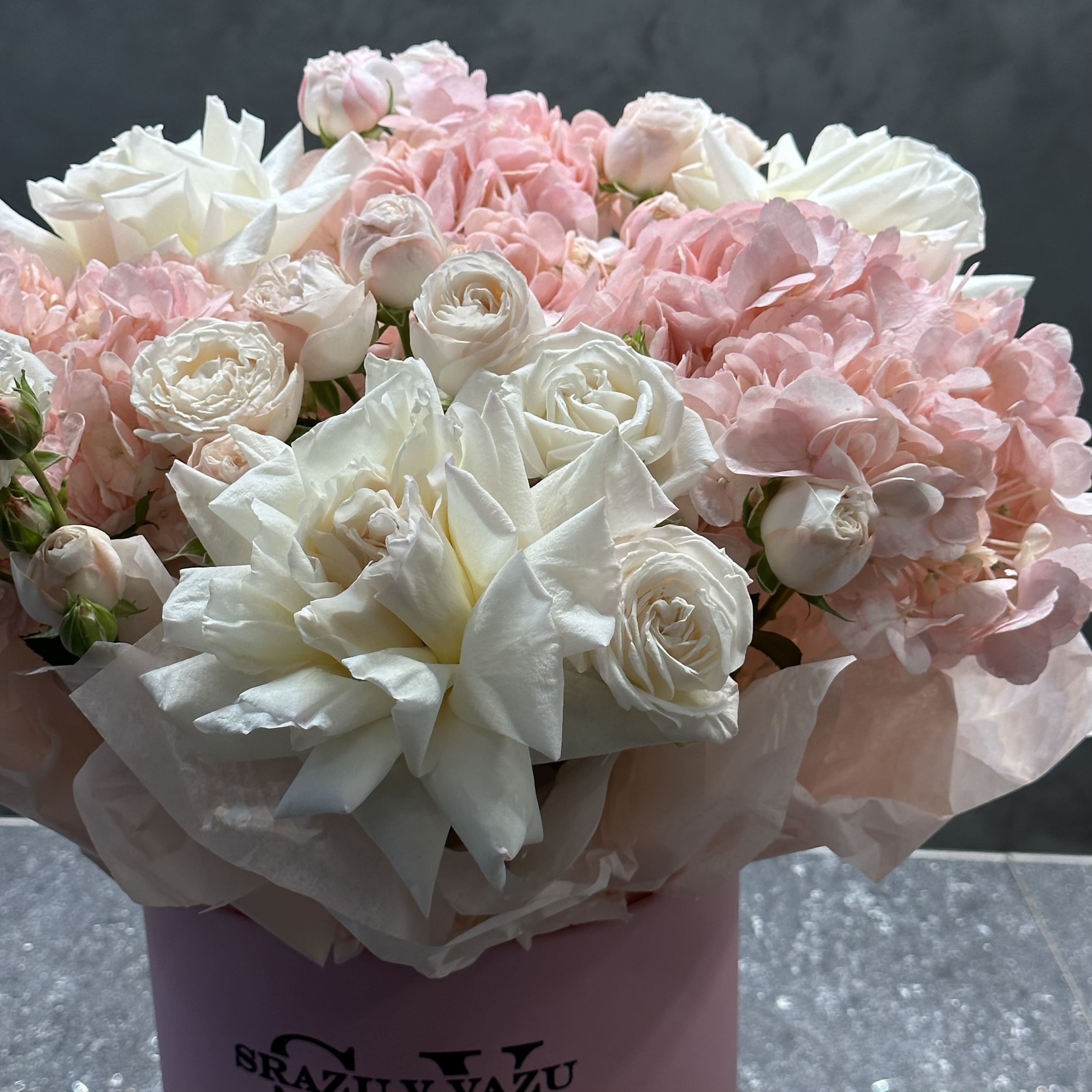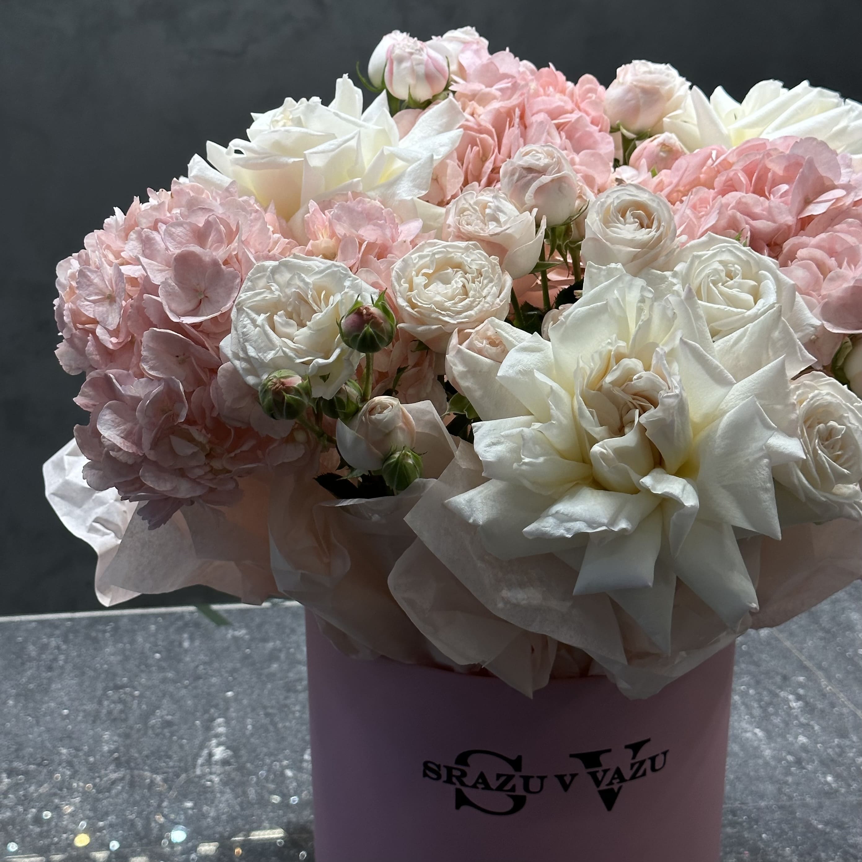 Изящная композиция сочетает в себе нежность розовых гортензий, элегантность французских роз и романтику кустовых роз. Мягкие оттенки и пышные формы создают атмосферу уюта и гармонии, идеально подходящую для выражения любви, благодарности или поздравлений. Восхитительный букет, наполненный нежностью и стилем.