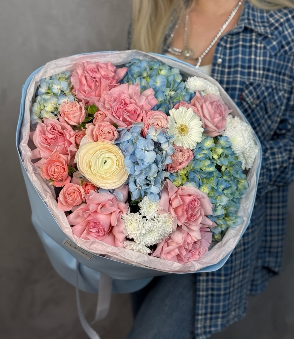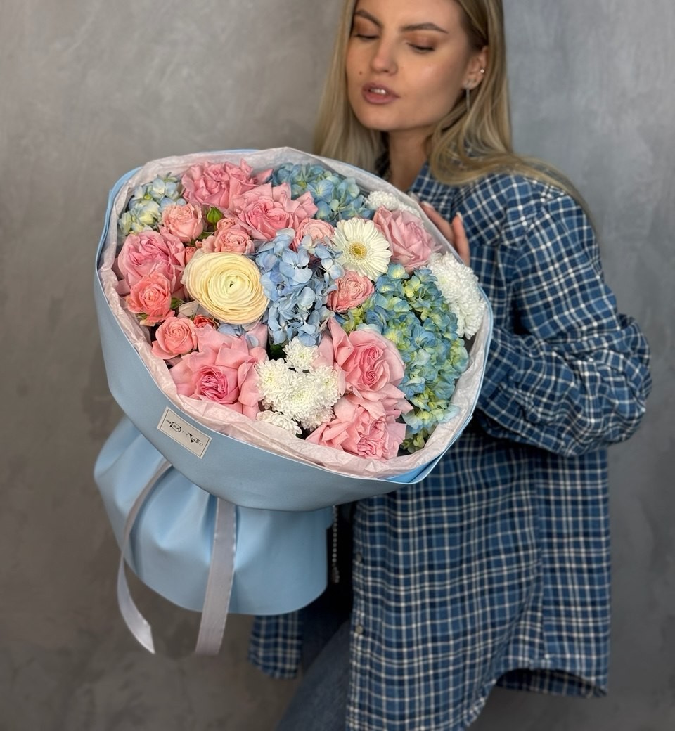 Этот нежный розово-голубой букет — настоящий символ утонченной красоты и спокойствия. Этот букет станет прекрасным подарком для особенного случая или милым акцентом для вашего интерьера, наполняя пространство атмосферой романтики и покоя.