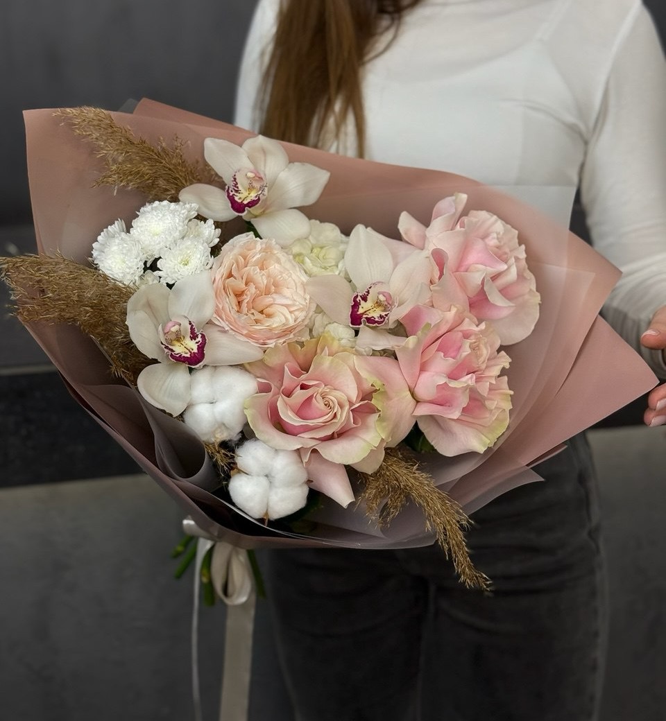 Бежево- розовый букет, сдержаный и элегантный, максимально естественный и нежный, имеет в составе стойкие орхидеи, нежнейшие пудровые французские розы сорта Pink Mondial, трава пампаса добавляет букету воздушности и легкости. Отличный выбор, который подойдет для любого повода