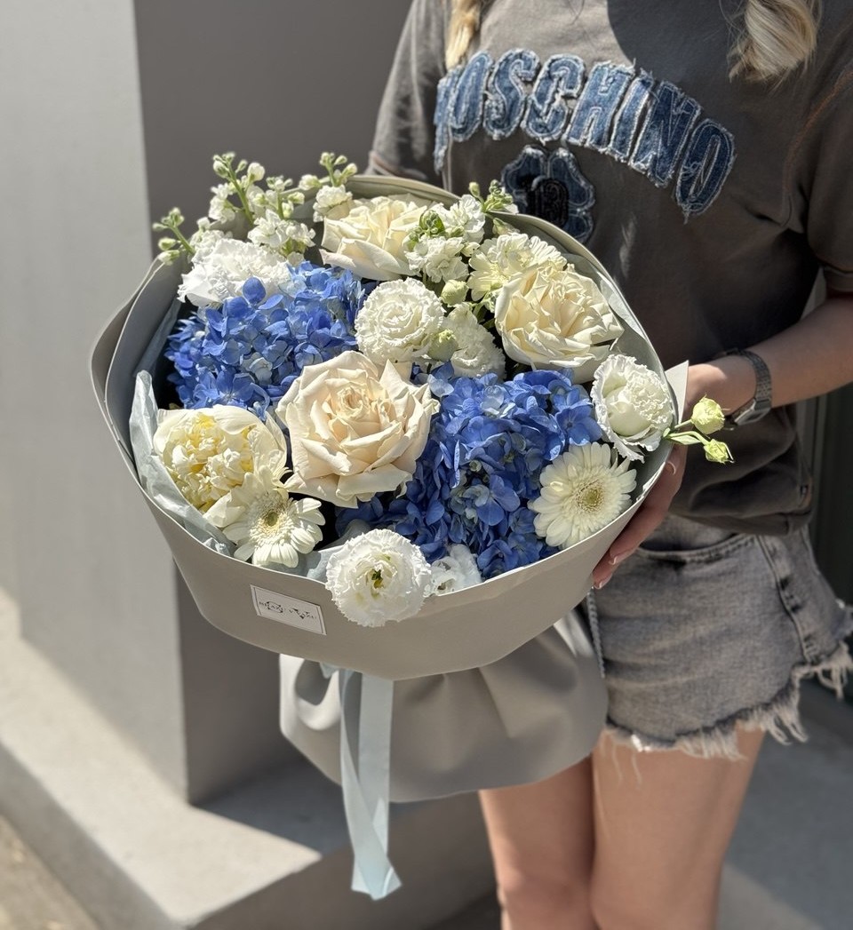 Главным акцентом композиции является синяя гортензия, которая своими крупными цветами создаёт ощущение глубины и объёма. Её насыщенный цвет прекрасно гармонирует с нежным голубым эвкалиптом, добавляя легкость и свежесть. Белая гермини, символизирует изящество и чистоту, а белая эустома завершает картину своим утонченным ароматом и изяществом. Весь букет выглядит как символ спокойствия и гармонии.