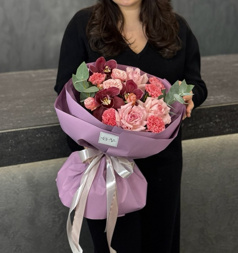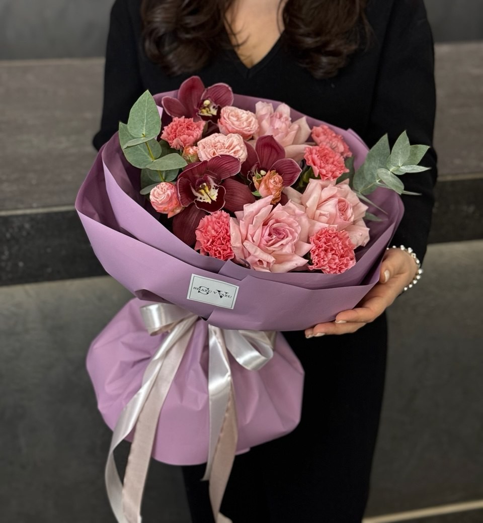 Стойкий букет из орхидей и гвоздик, очаровательный презент, который будет радовать своего получателя долгое время. Парфюмированные розы сорта Pink O'Hara, яркие орхидеи и коралловые гвоздики- яркое и элегантное сочетание