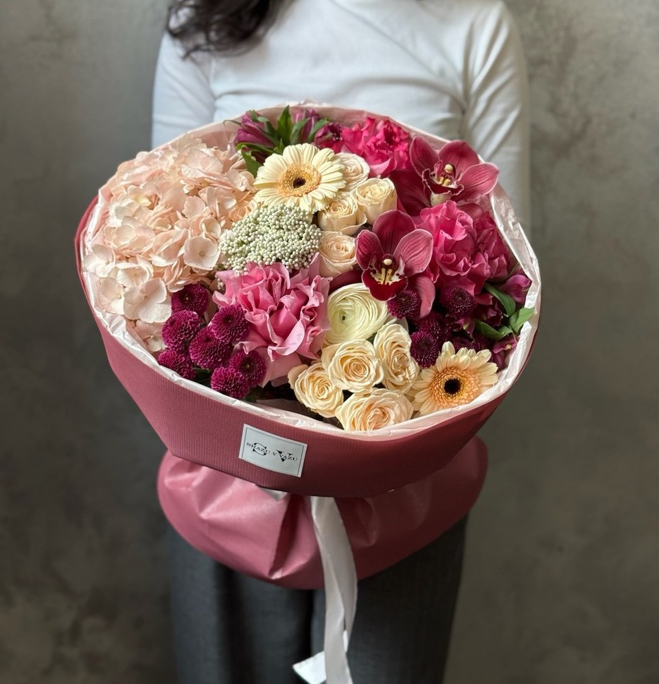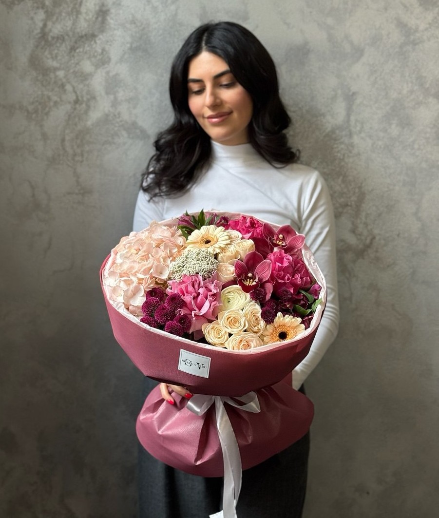 Этот темный букет — воплощение элегантности и загадочности, который притягивает взгляды и вызывает восхищение. Винные орхидеи, с их глубоким и интригующим цветом, выступают в главной роли, излучая роскошь и утонченность. Их окутывающая красота идеально дополняется пурпурной альстромерией, которая добавляет ярких акцентов и текстуры в композицию.