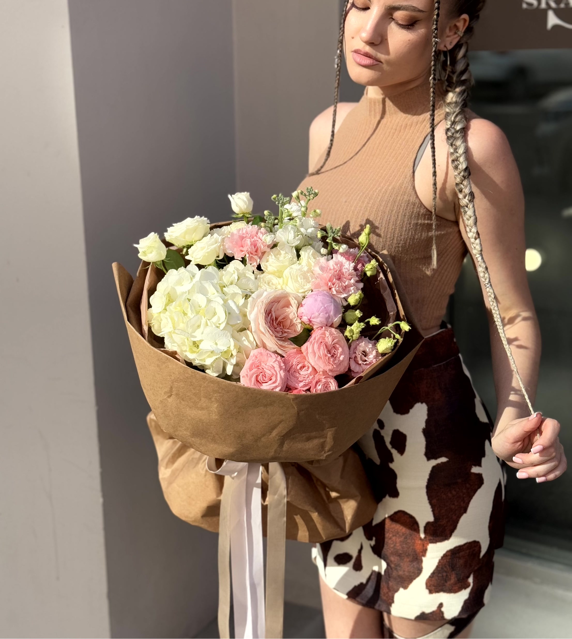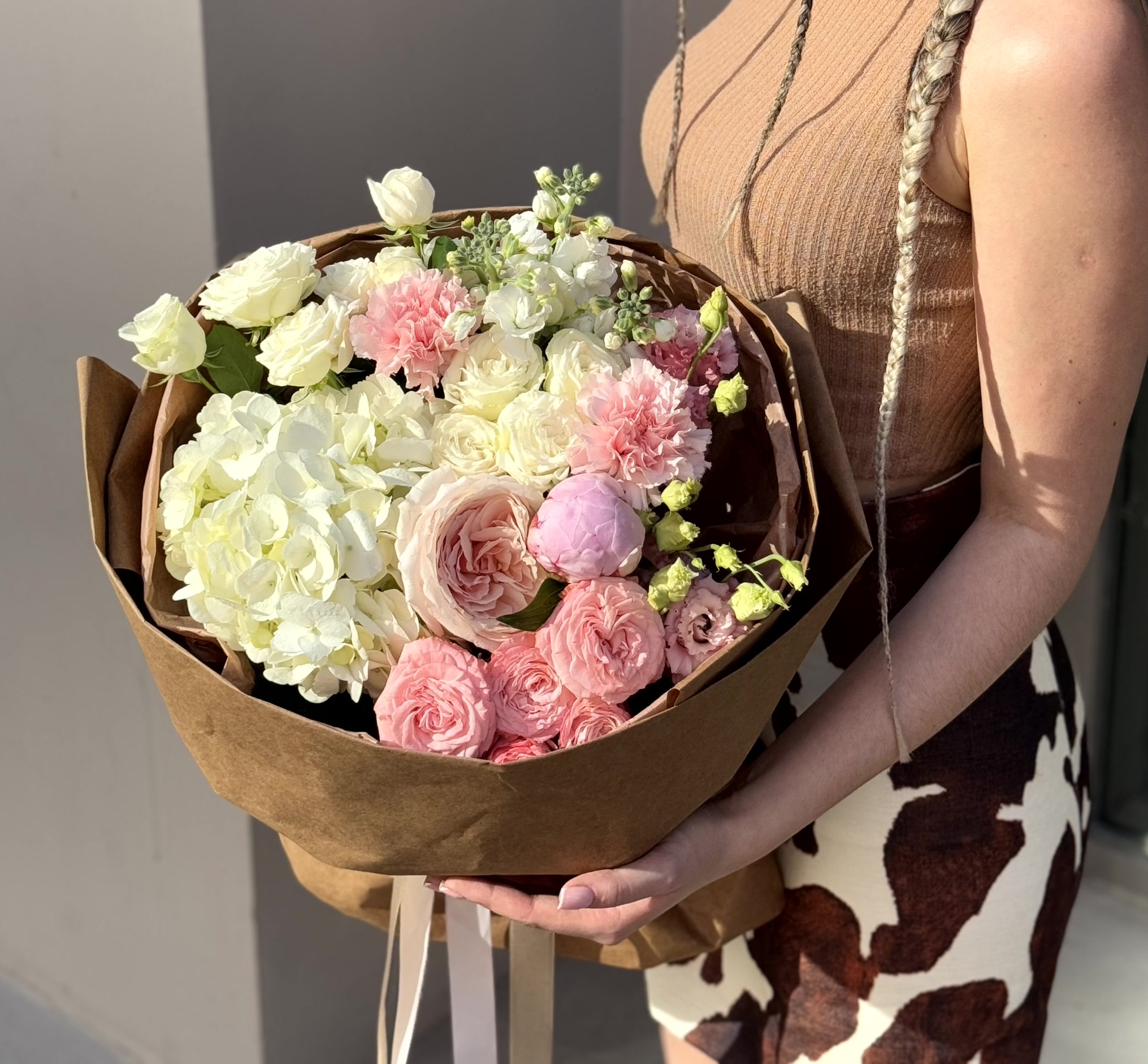 Заказать Авторский букет с пионом,гортензией и розами с доставкой по Самаре