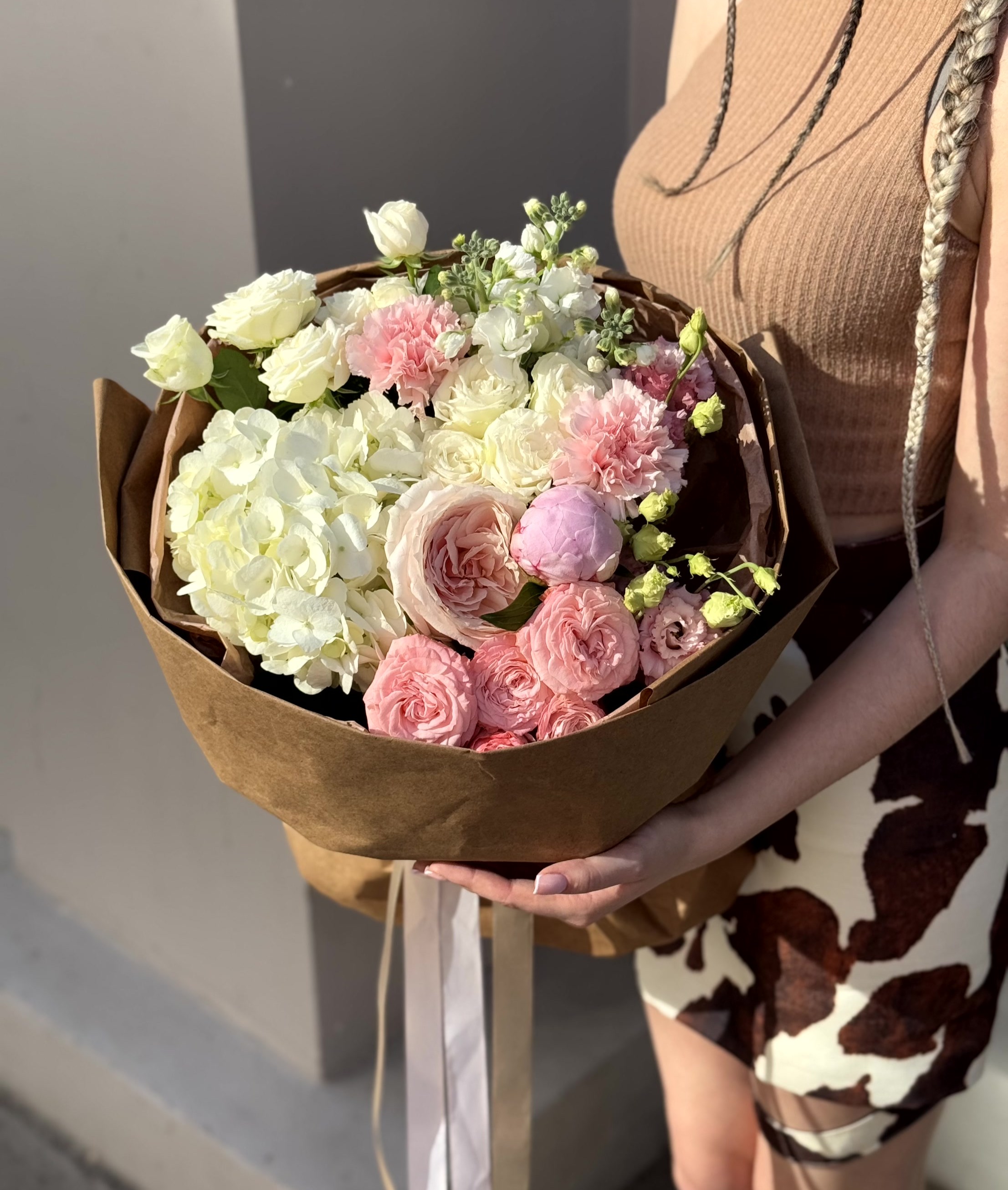 Стильный букет с сезонными летними цветами в крафтовой упаковке- нежные пионы Сара Бернар, ароматная маттиола и цветущая стойкая эустома- отличный летний тандем.