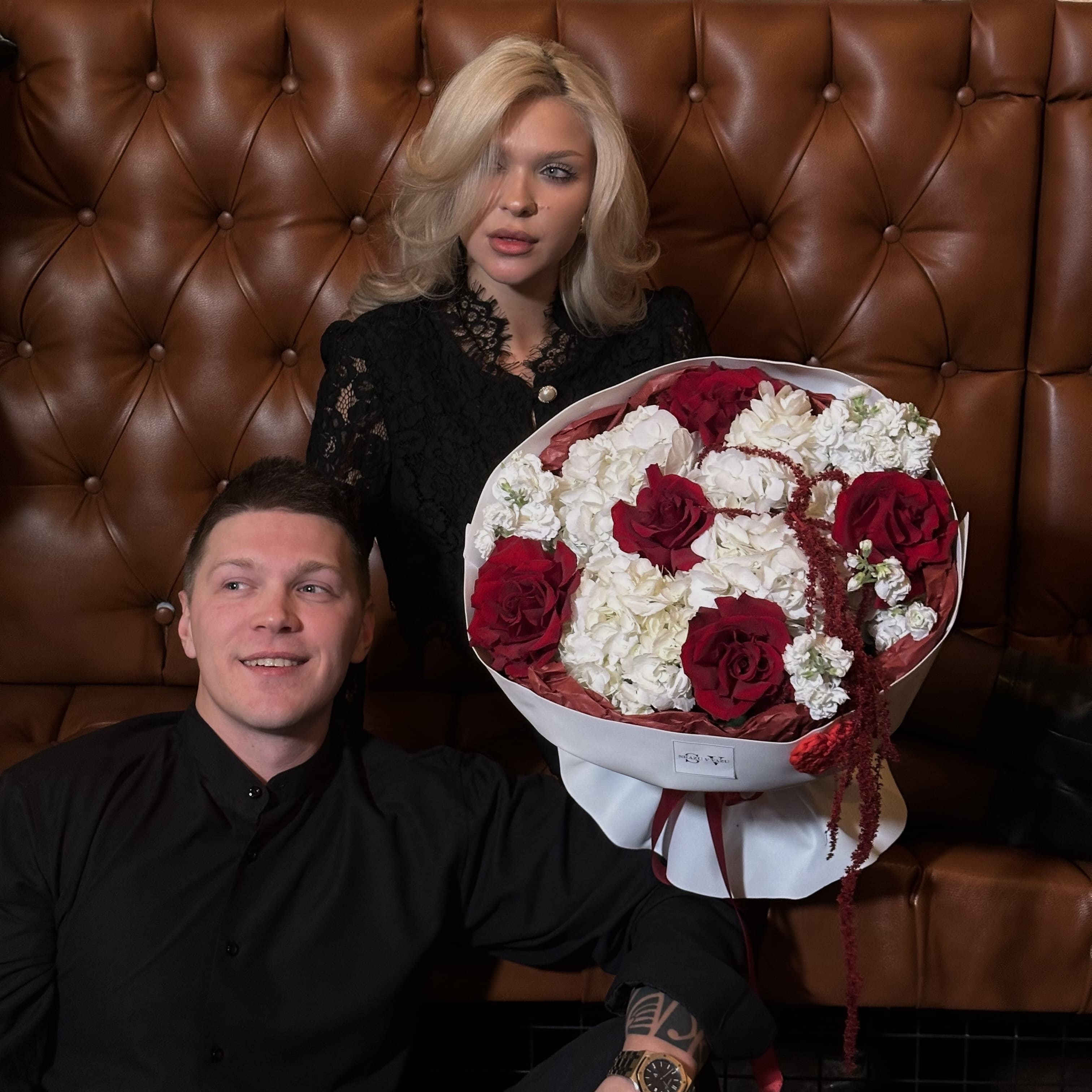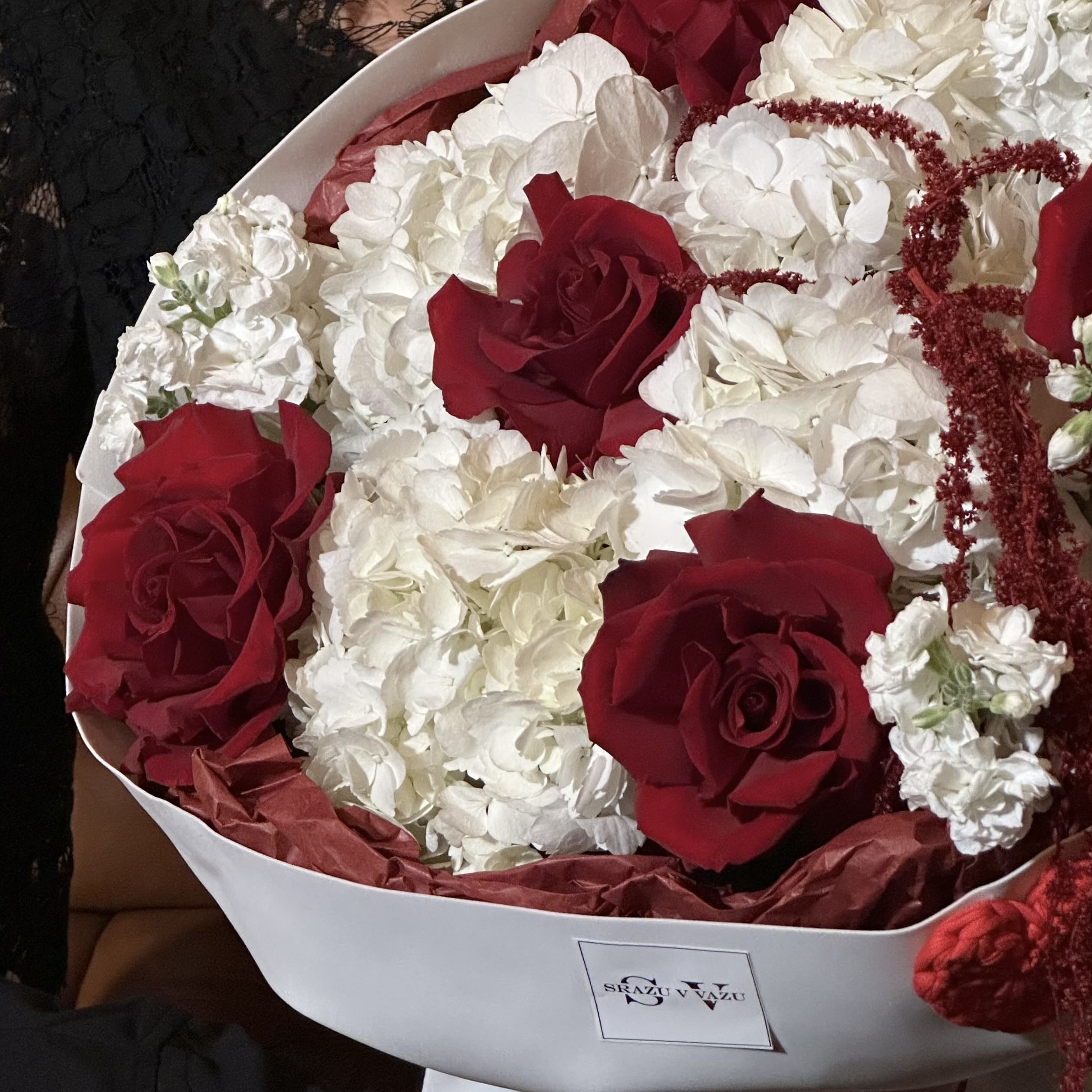 Авторский букет в бело-бордовых тонах из гортензий, французских роз сорта Explorer, ароматной белой маттиолы и изящно свисающего амаранта. Элегантный букет наполнит пространство свежестью и лёгкостью, создавая атмосферу чистоты и совершенства