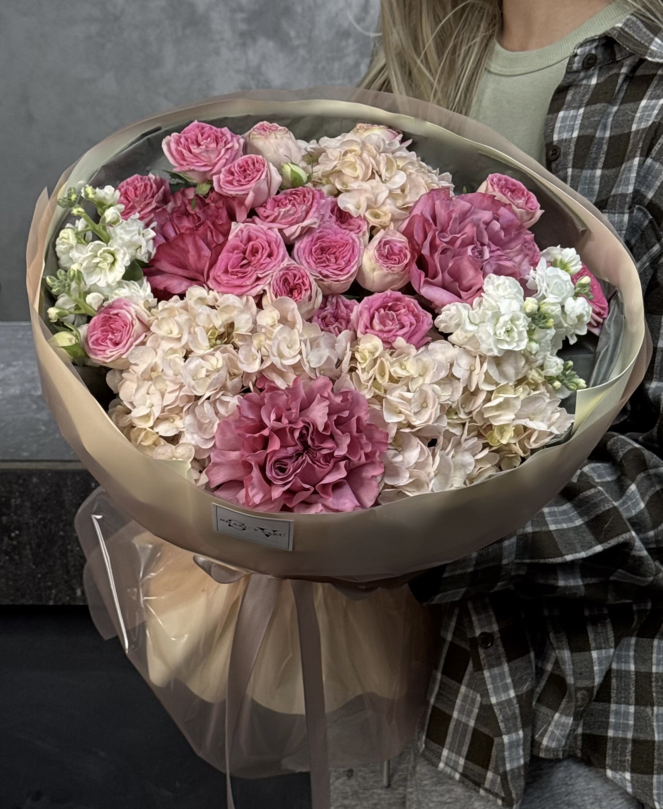 Легкий воздушный букет в нежных тонах, который подойдет на любой повод! Уютное сочетание пионовидных и кустовых роз с гортензией и антиринумом