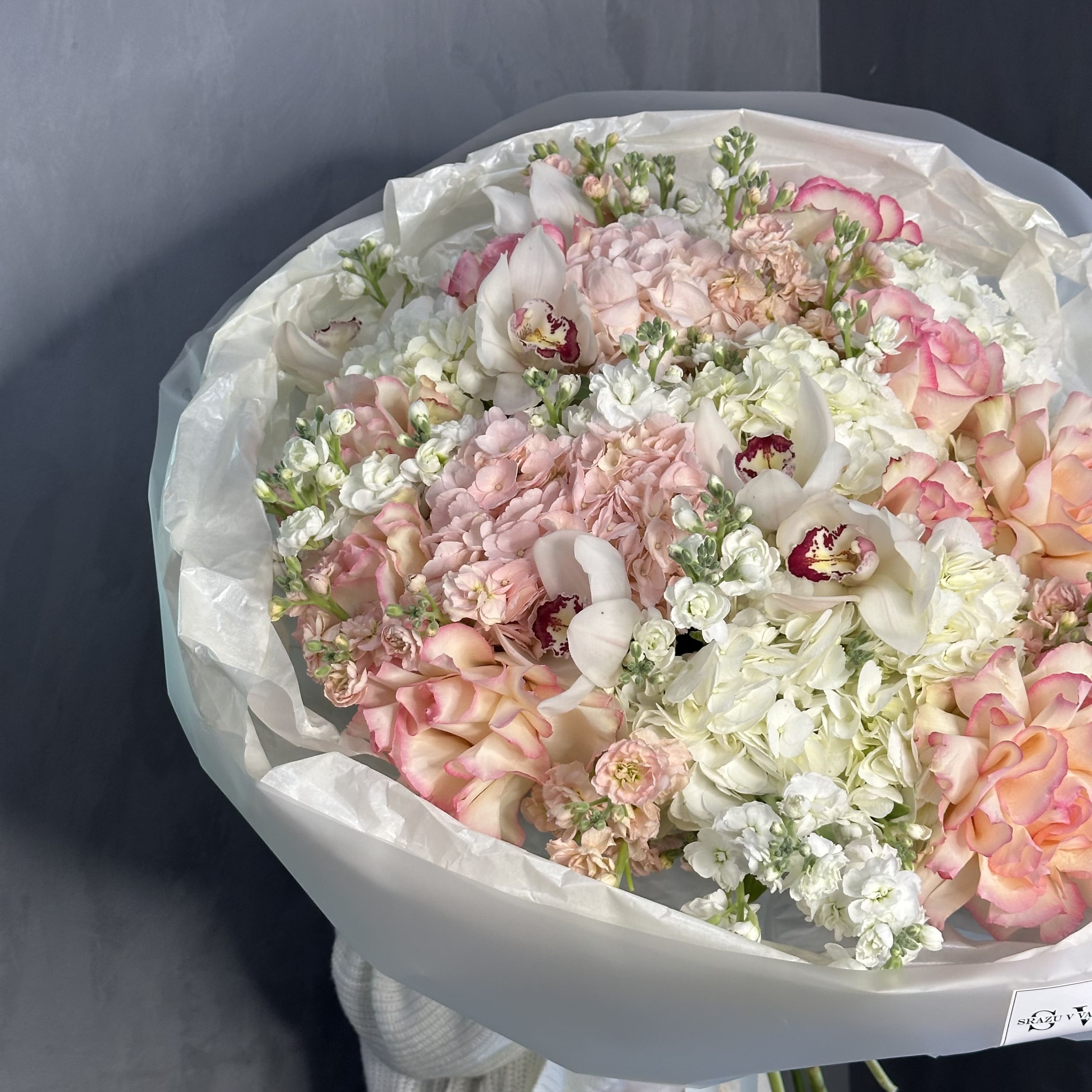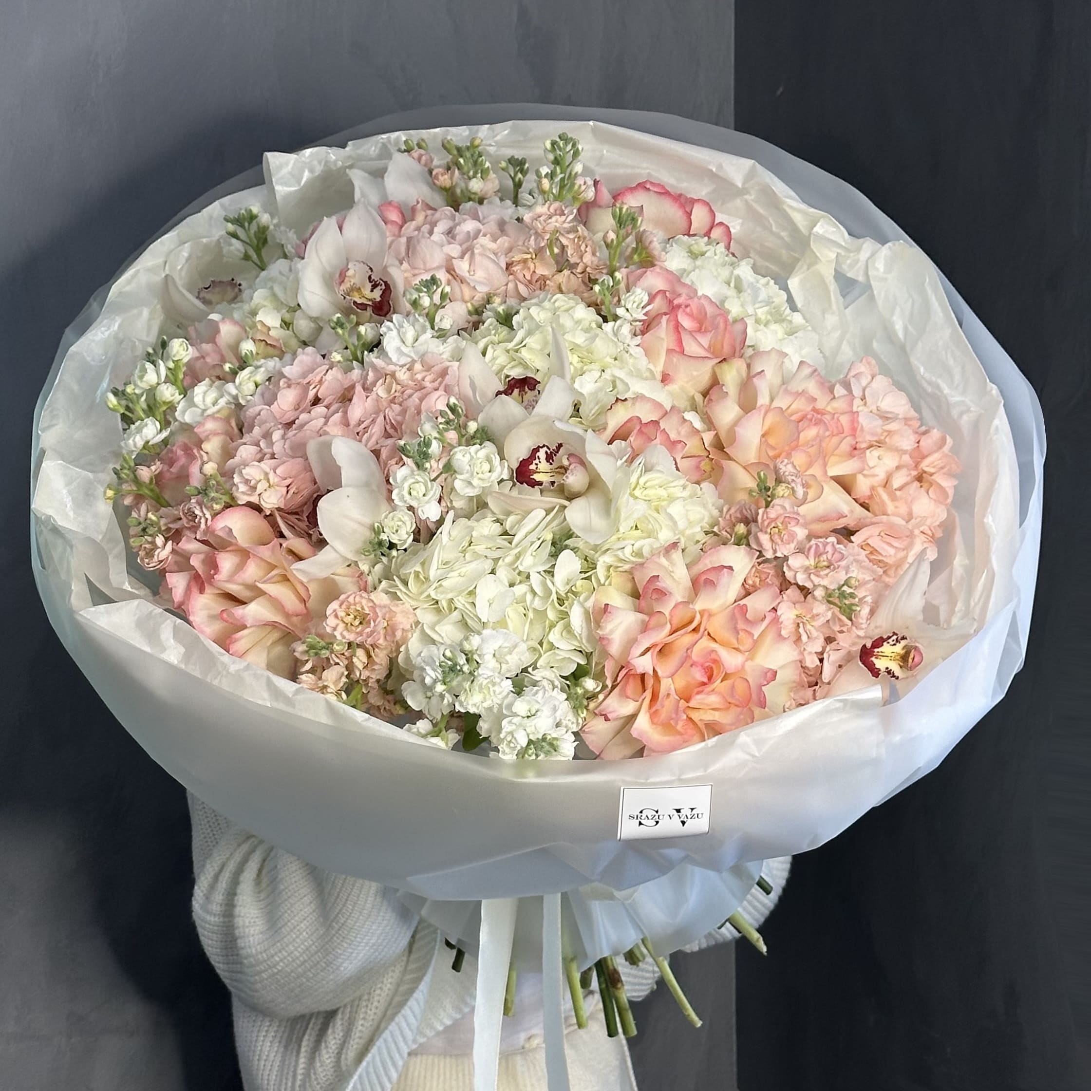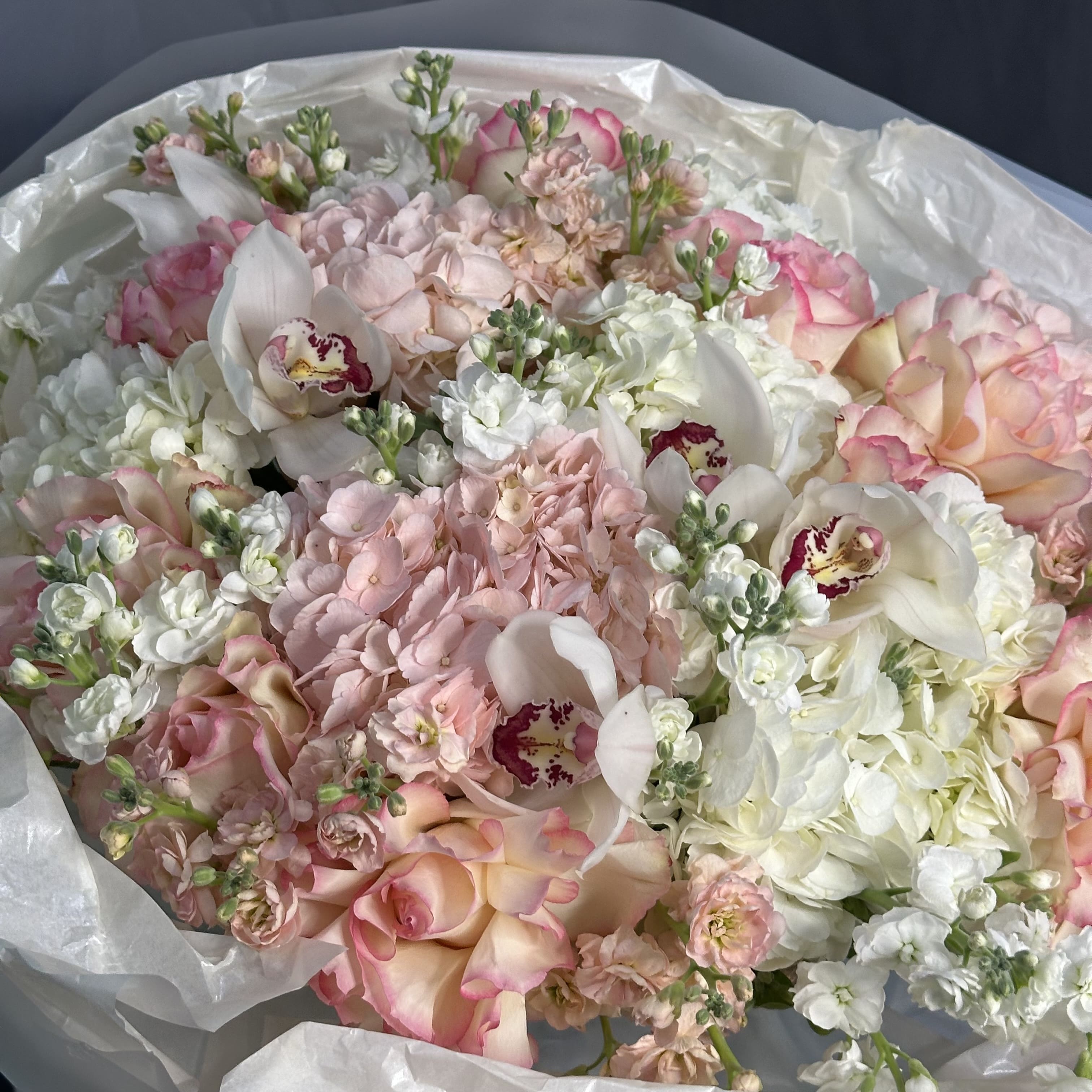 Роскошный, ярко‑выразительный букет с богатой фактурой и мягкими переходами оттенков. В центре — крупные гортензии, окружённые орхидеями и французскими розами Espérance, а акценты создают маттиола для лёгкой воздушности и текстурности. Итог — эффектный, праздничный ансамбль для торжеств.
