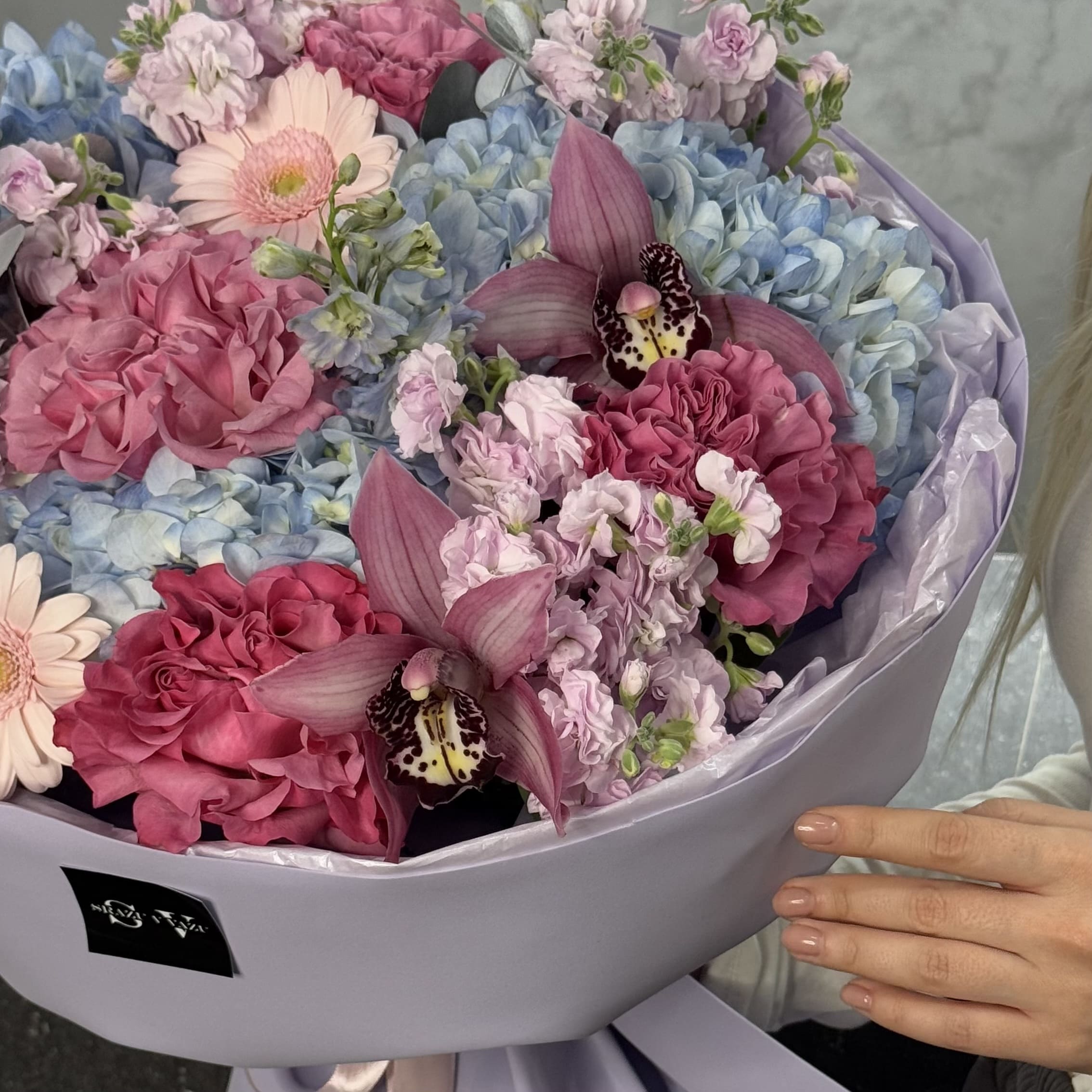 Авторский букет с голубой гортензией, пионовидными розами, гермини и маттиолой — это нежное и элегантное сочетание. Мягкие оттенки и разнообразие форм создают гармоничную композицию, которая визуально радует глаз и наполняет атмосферу уютом и красотой. Отличный выбор для тех, кто ценит стильные и необычные цветочные решения.