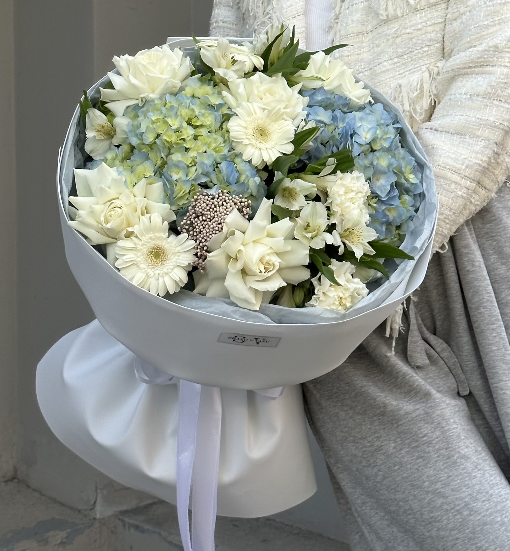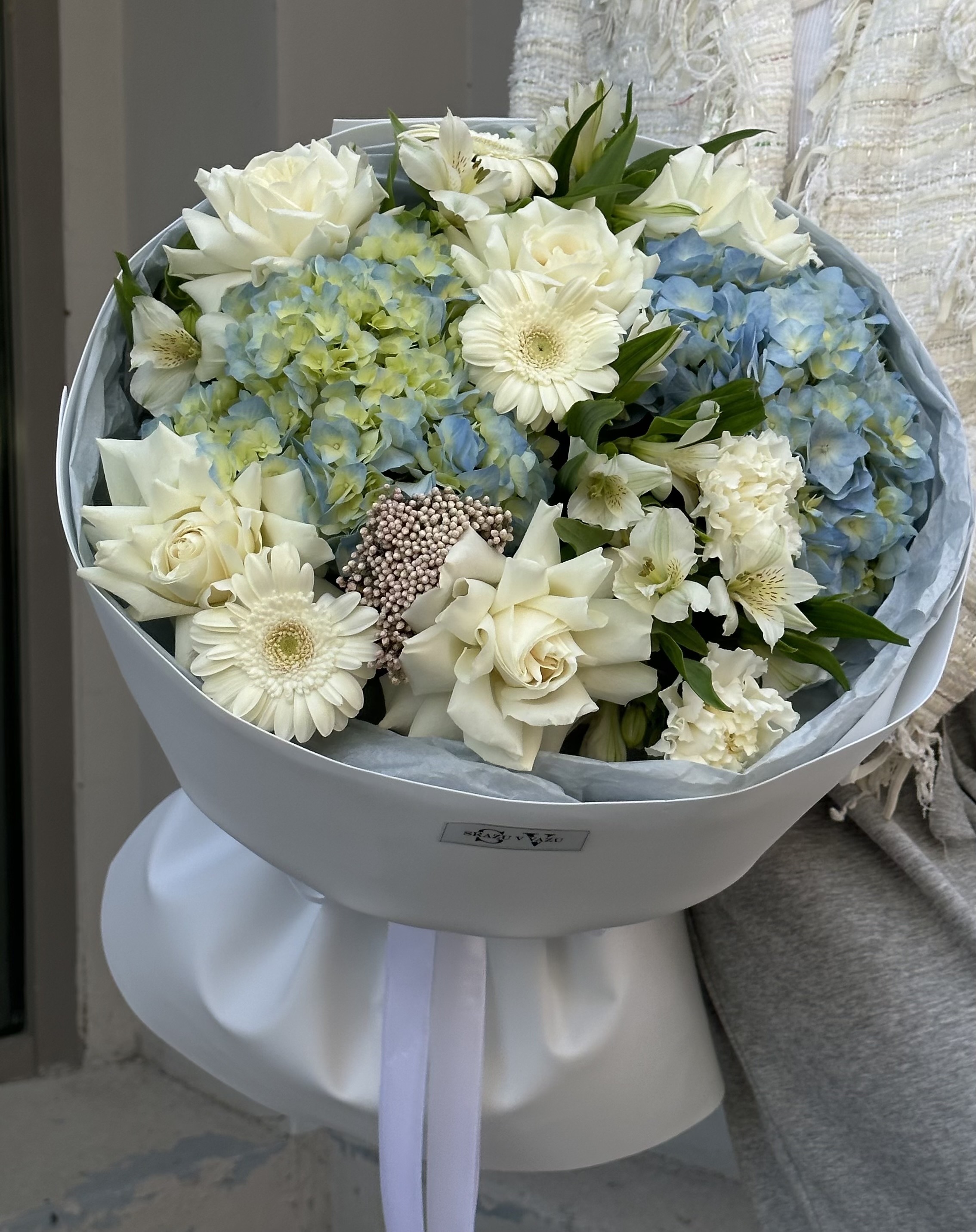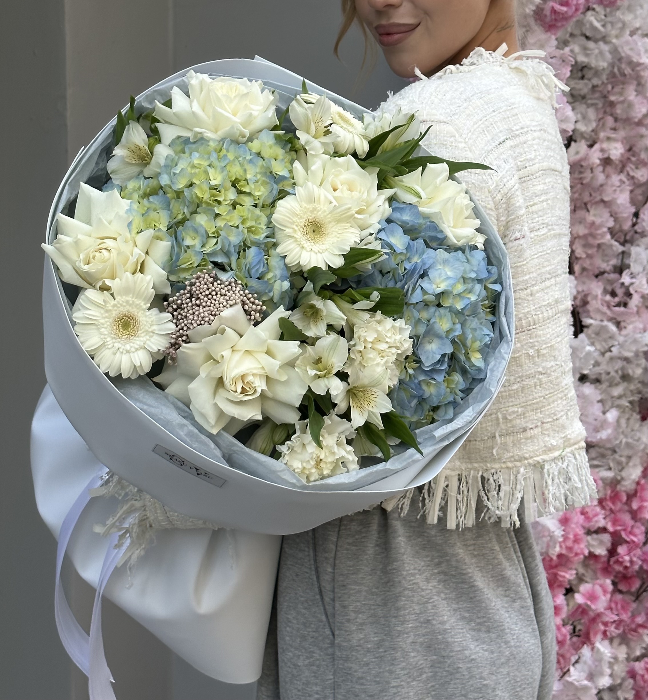 Воздушное облачко из голубых гортензий, белых французских роз, стойких альстромерий, гермини и ароматного озотамуса. Букет будет собран в повторе и может незначительно отличаться, но цветовая гамма и стилистика будет максимально сохранена