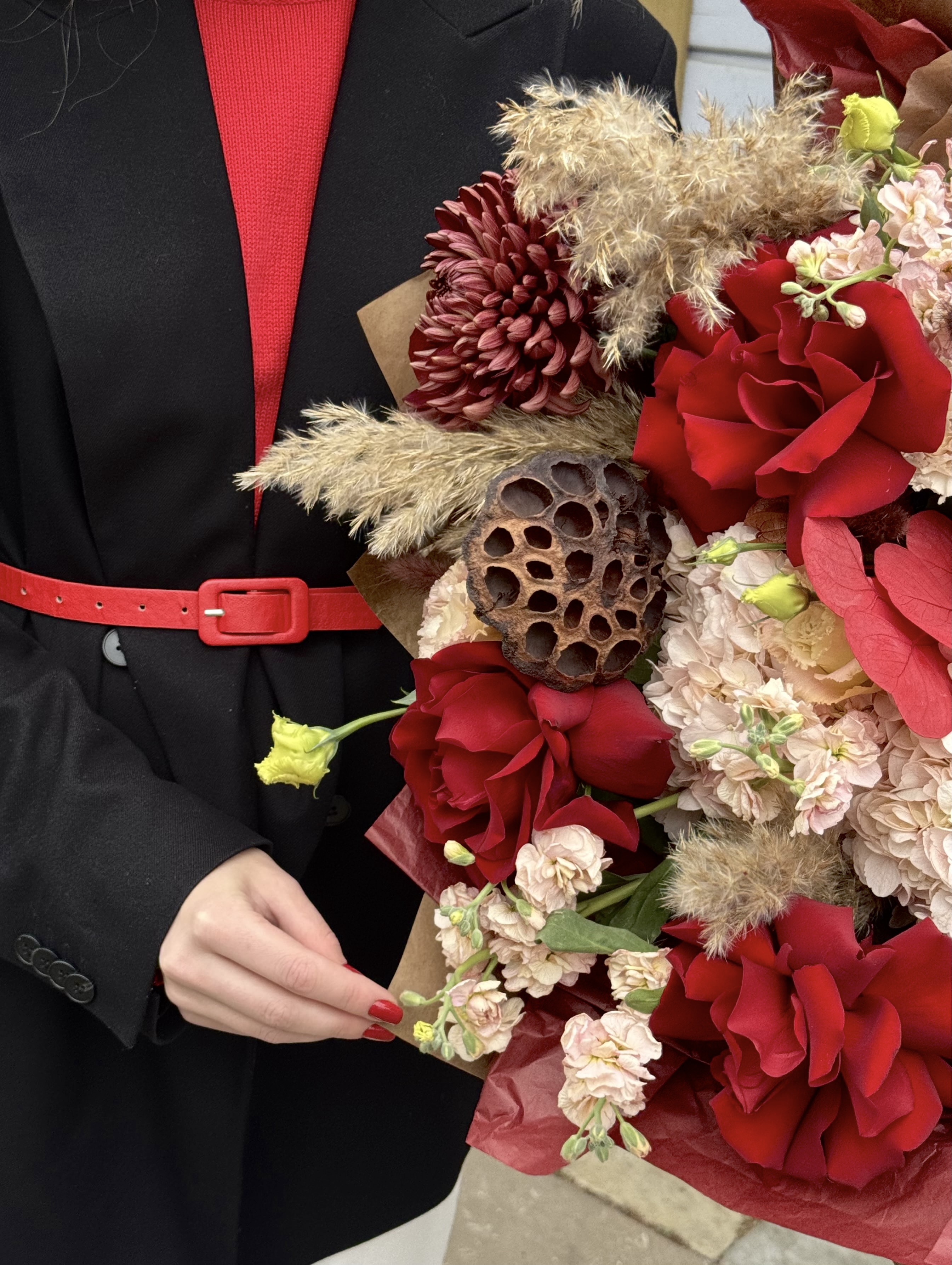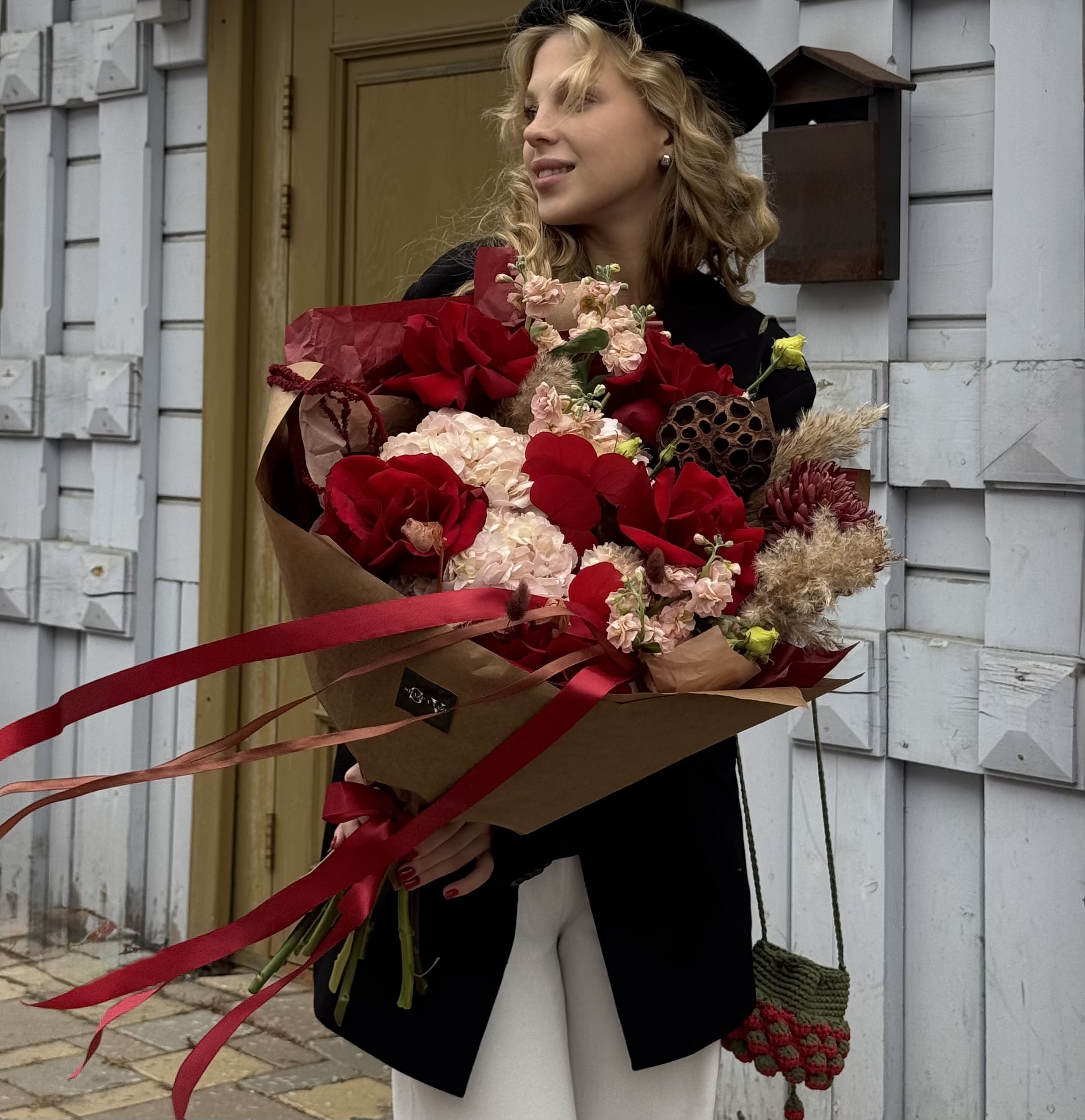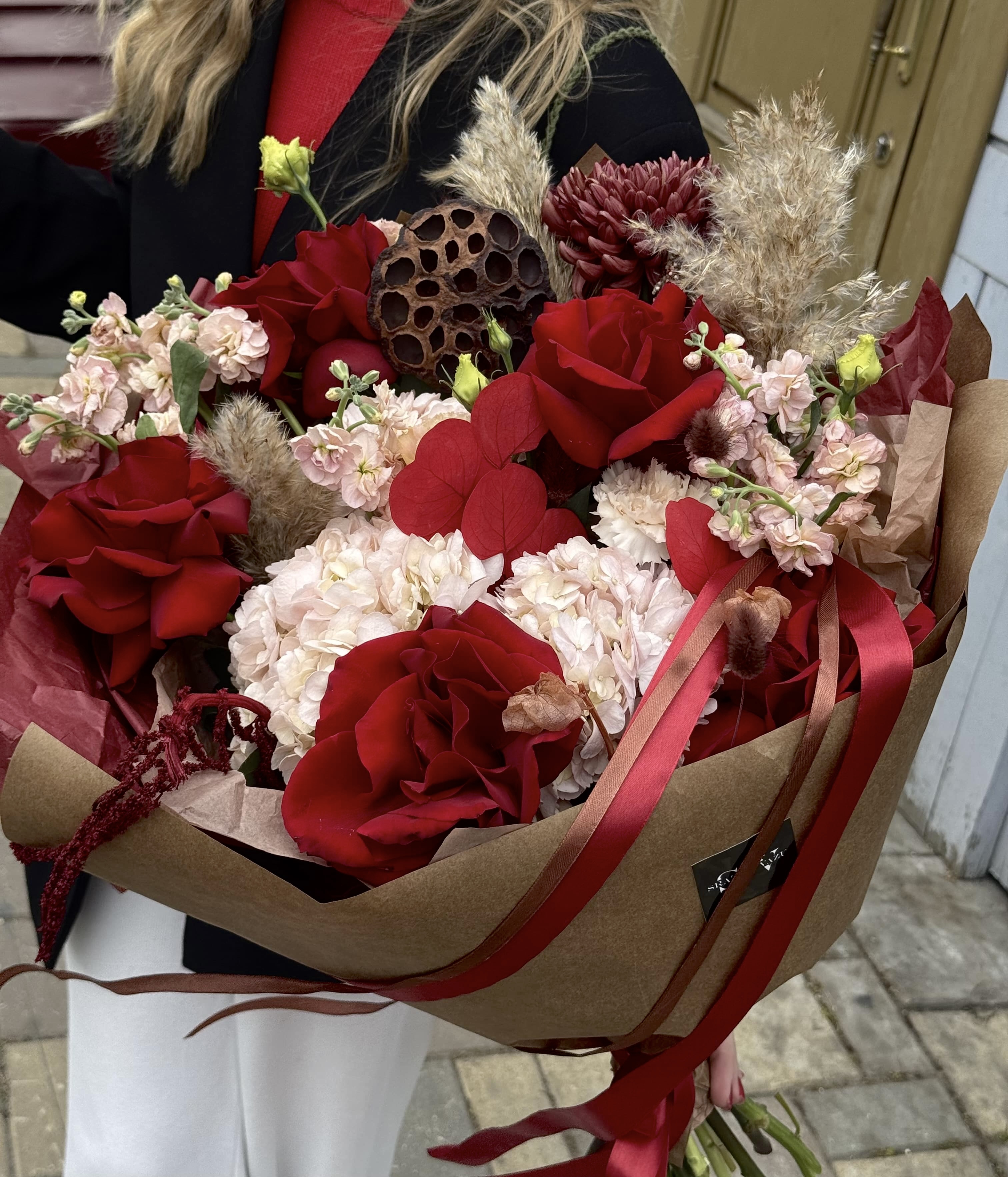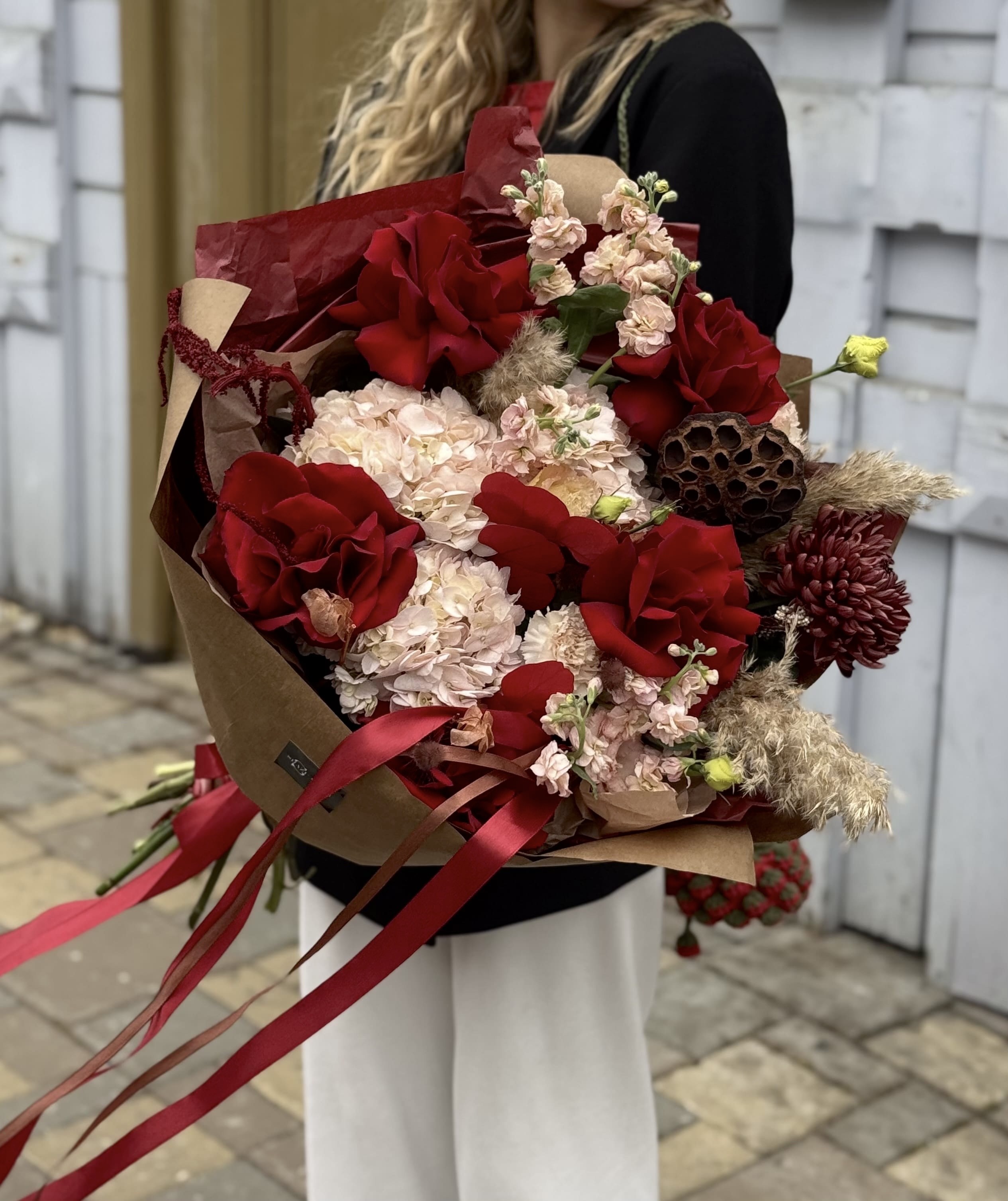 Яркий осенний букет — сочетание бордовых французских роз, элегантного лотоса, нежной маттиолы и сухоцветов. Теплая палитра и насыщенные оттенки создают атмосферу уюта и красоты, идеально подчеркивая богатство осенней природы. Упаковка из крафтовой бумаги с бордовыми лентами добавляет композиции изысканности и завершенности, делая этот букет прекрасным подарком для особых случаев.