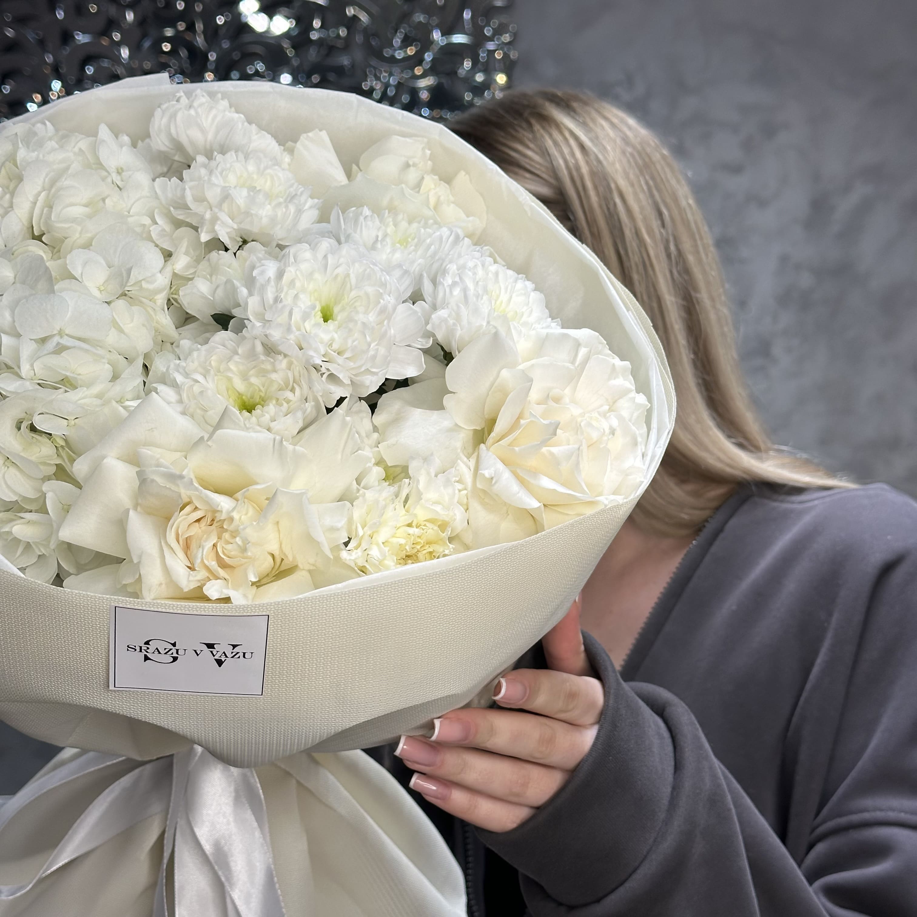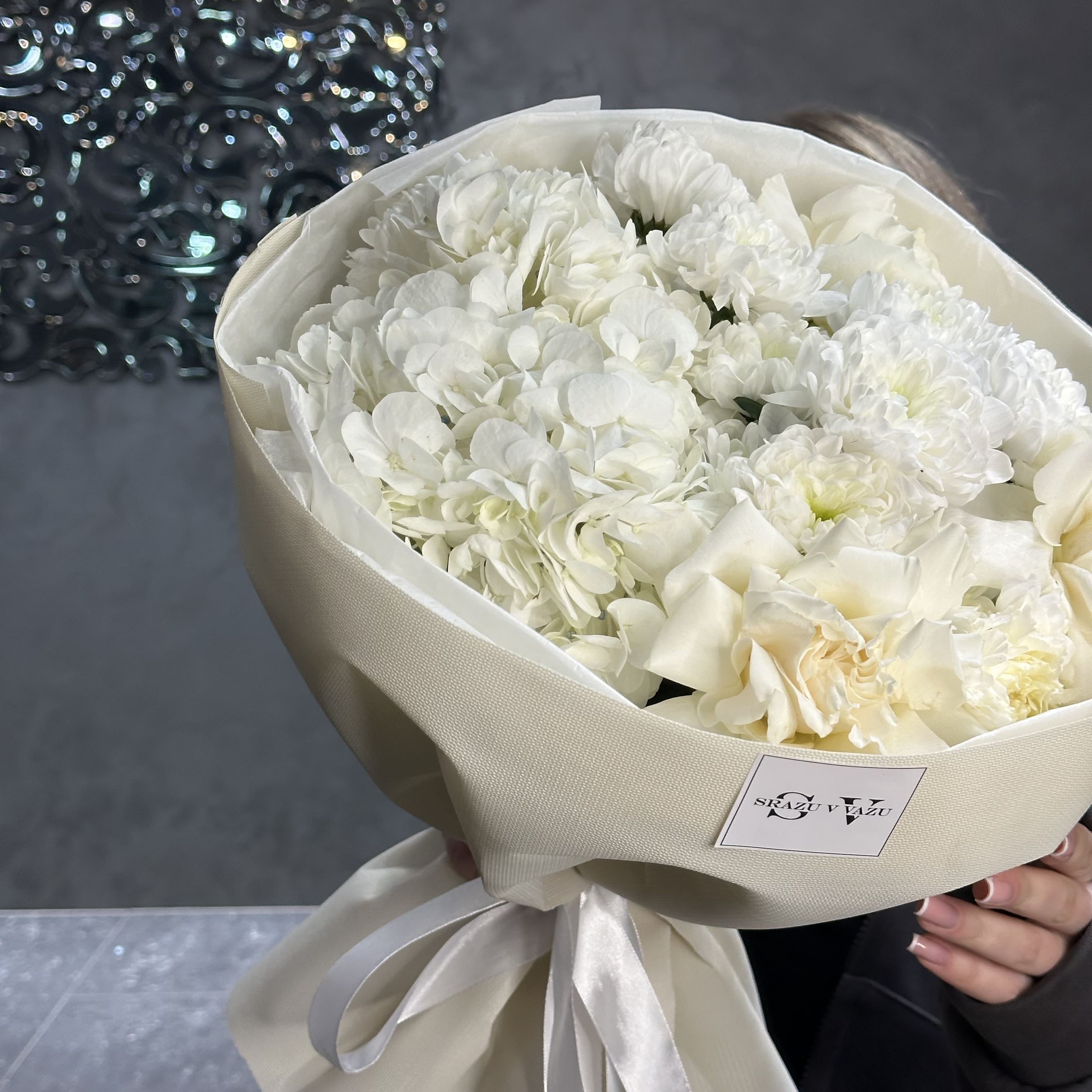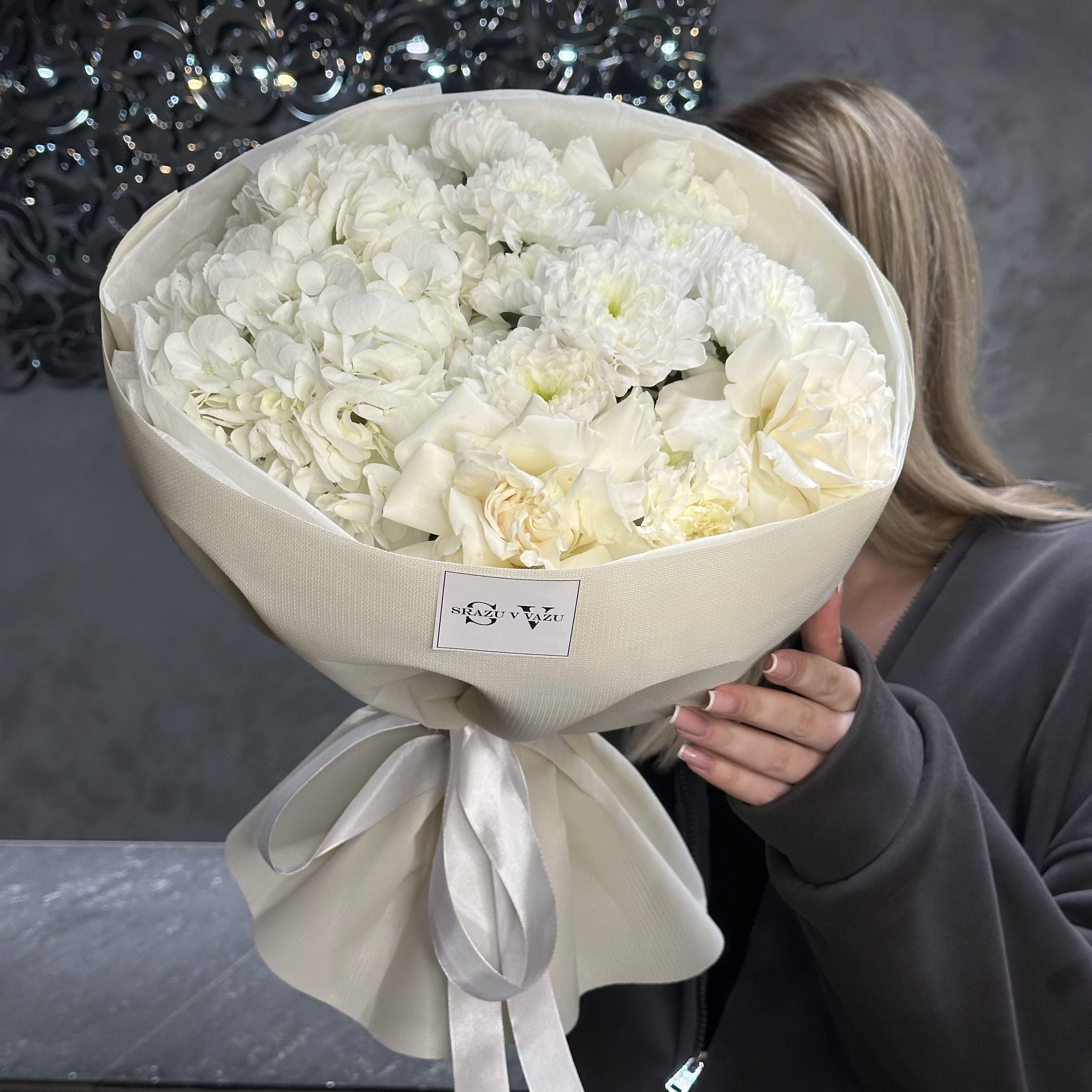 Белый букет, состоящий из пышной гортензии, элегантных французских роз, хризантемы Алтай и гвоздики - создает атмосферу чистой и светлой энергии. Гармония каждого цветка бережно подобрана, чтобы подчеркнуть друг друга, раскрывая свою индивидуальность. Светлая палитра отражает искренность и нежность чувств, делая этот букет идеальным символом уважения, благодарности и глубоких эмоций