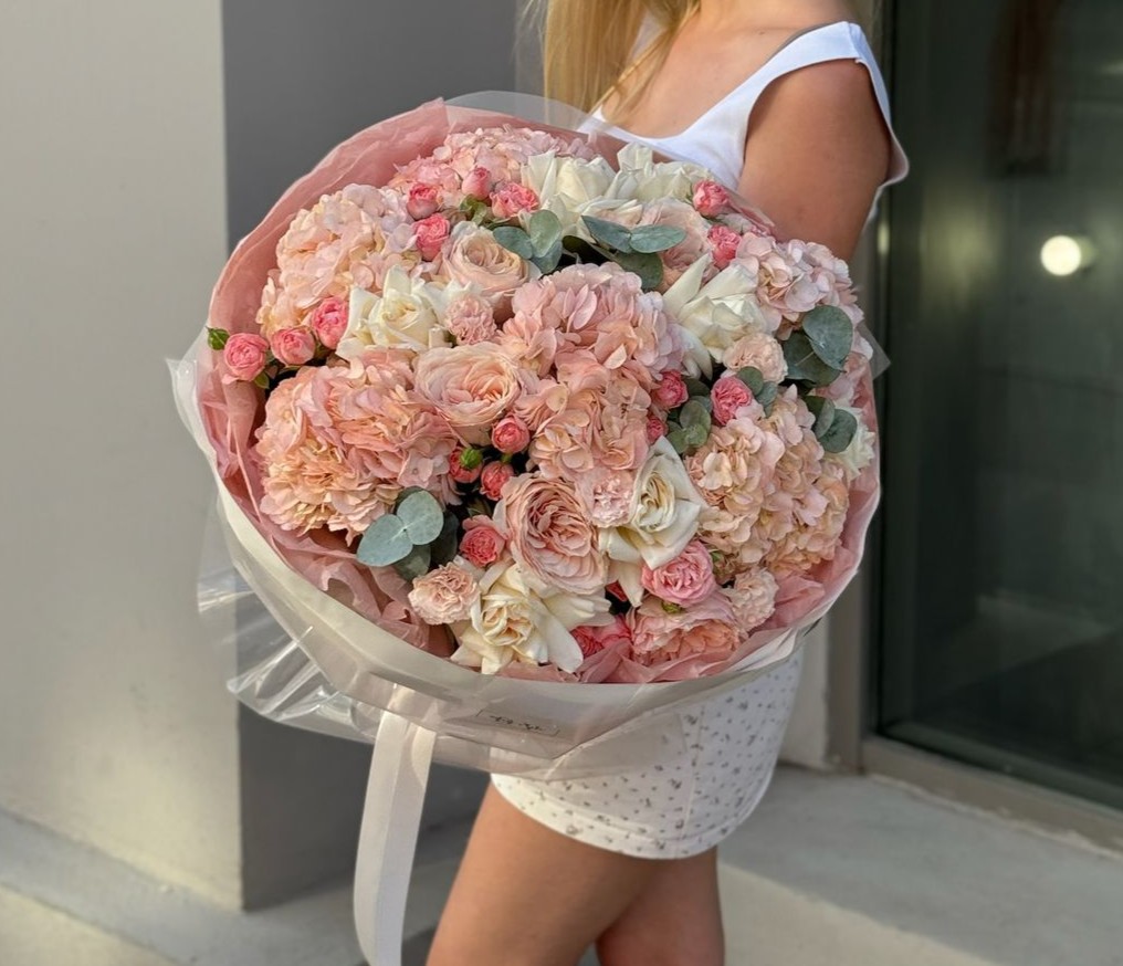 Объемный,нежный букет, как выражение самых сильных чувств и глубокой признательности. Нежно-розовые шапки гортензий и премиальной розы Tsumugi, белоснежная ароматная роза White O"hara и небольшие акценты в виде кораловой кустовой розы с добавлением свежего эвкалипта- это сочетание, которое сочится изящностью и красотой.