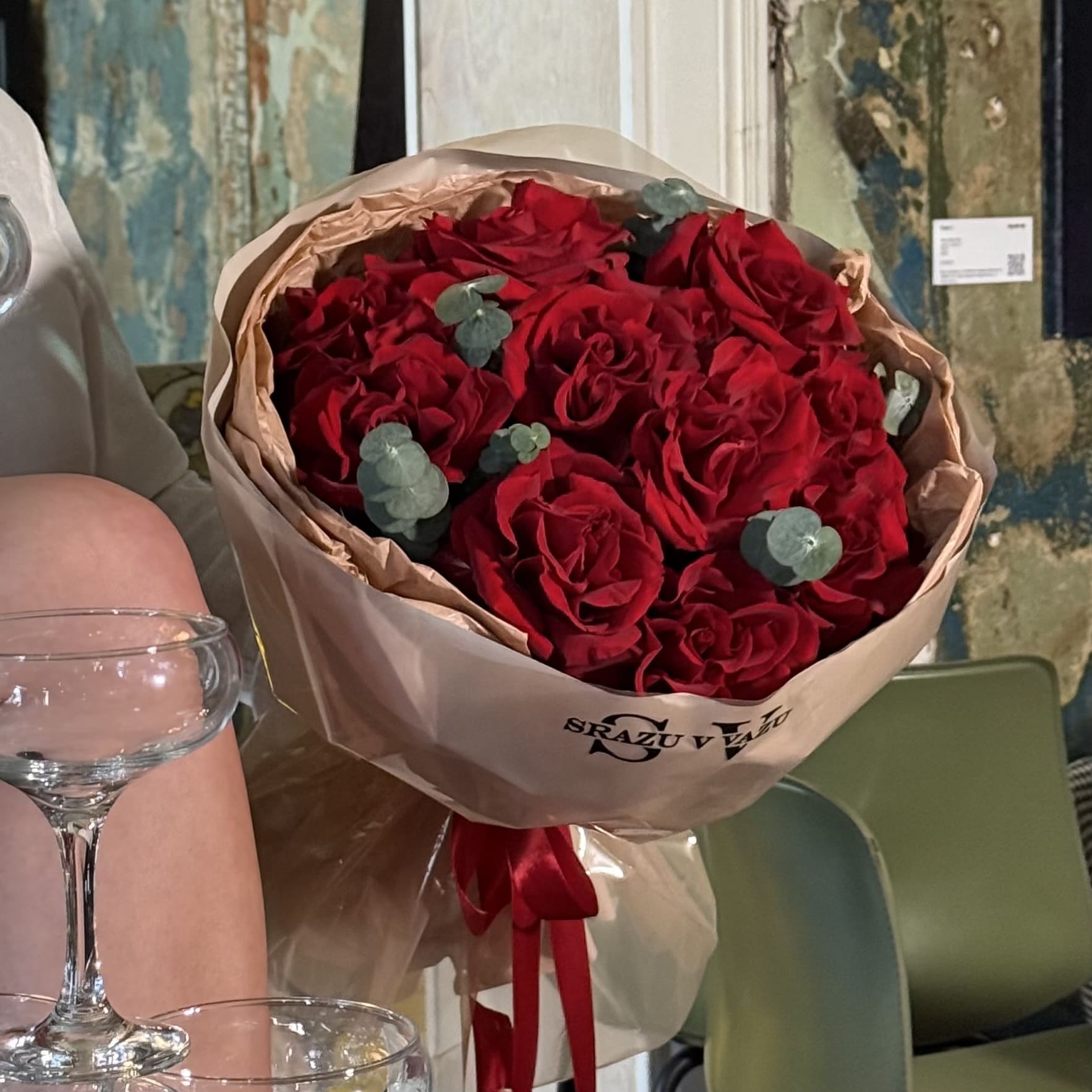 Моно-букет из величественных 9 французских роз сорта EXPLORER украшен листьями эвкалипта, придавая композиции особый шарм и свежий аромат. Элегантный и лаконичный букет идеально передаёт чистоту и натуральную красоту, став отличным выбором для подарка и украшения интерьера.