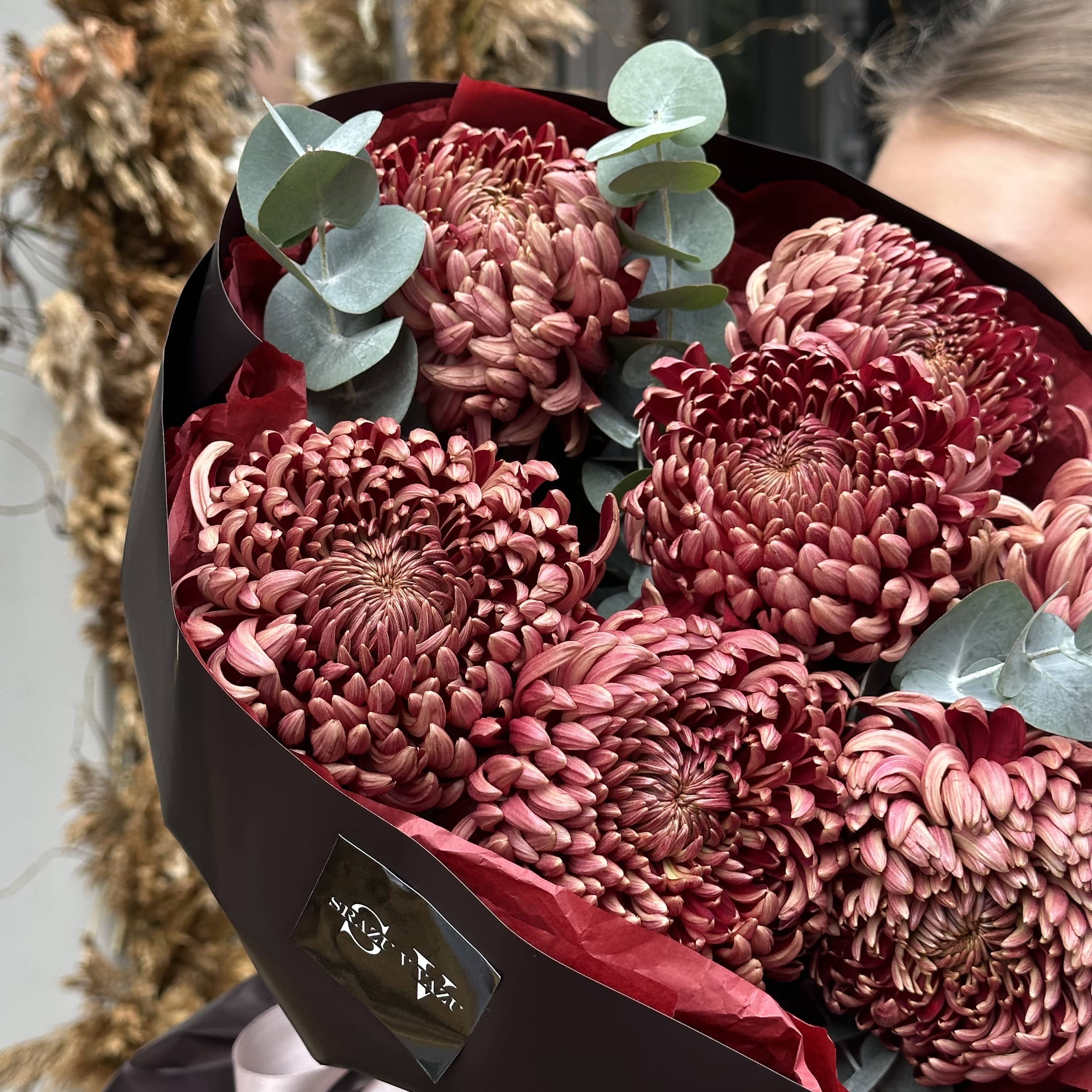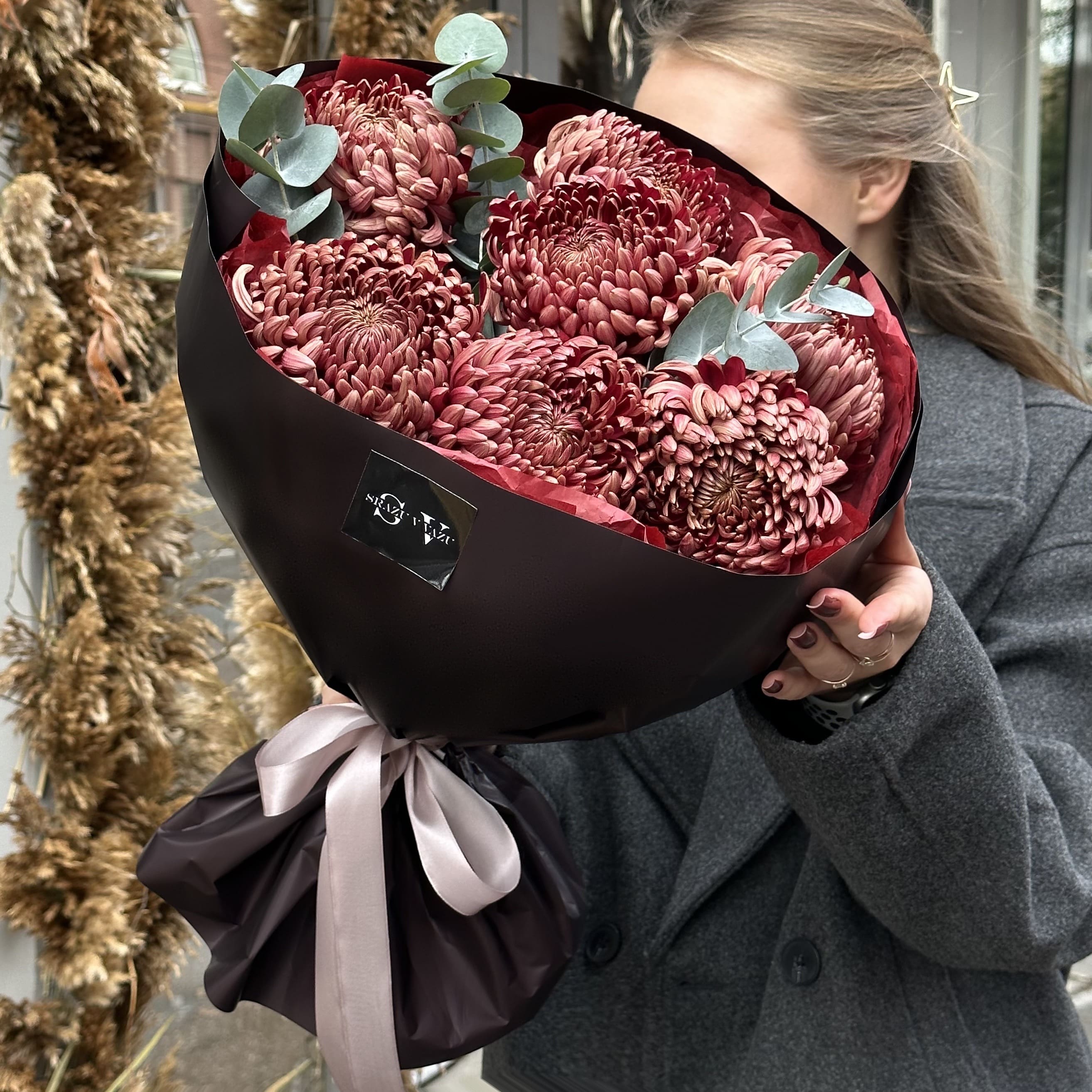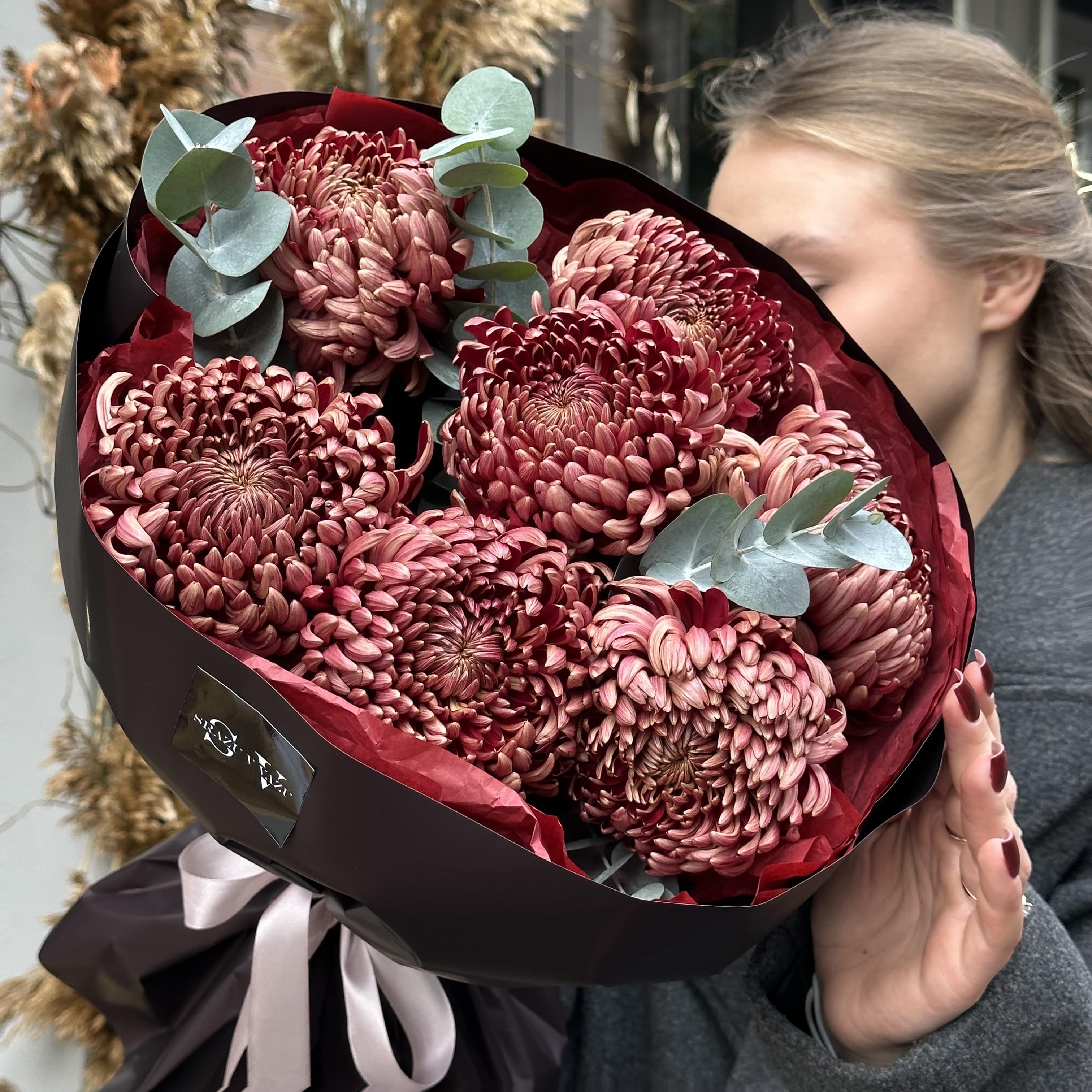 Сезонные и невероятные стойкие хризантемы сорта Бигуди в сочетании с ароматным эвкалиптом - отличный вариант порадовать близкого человека сезонными цветами!