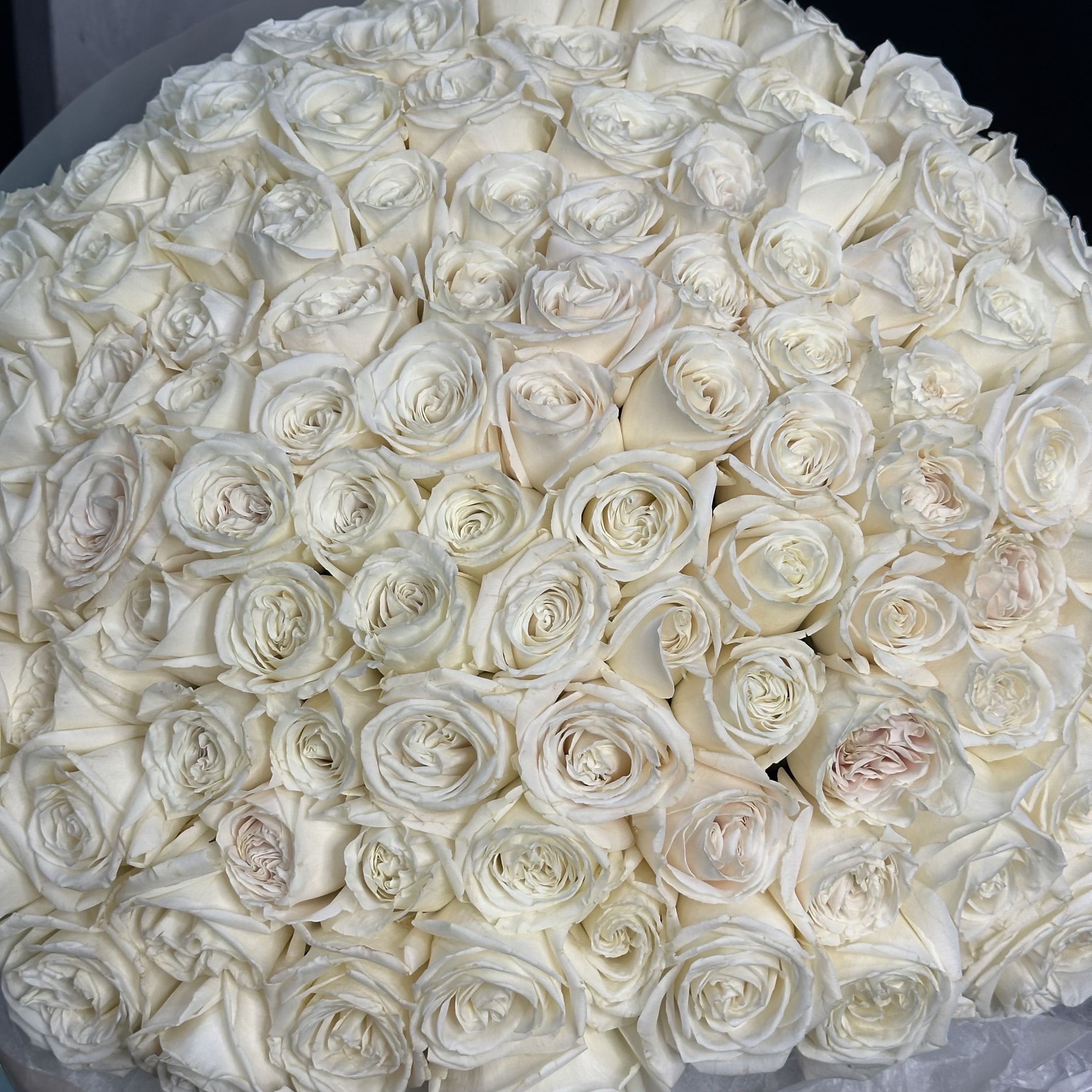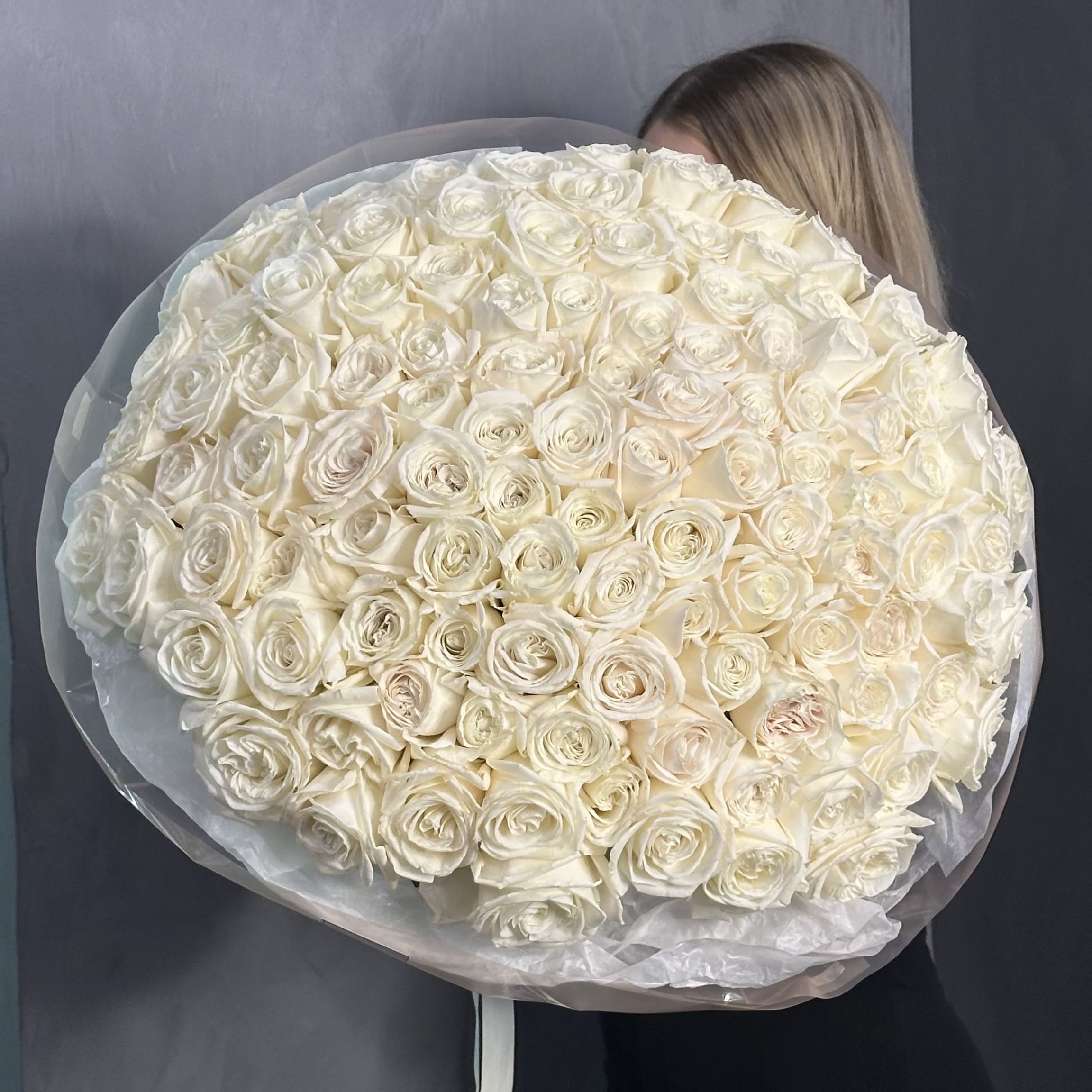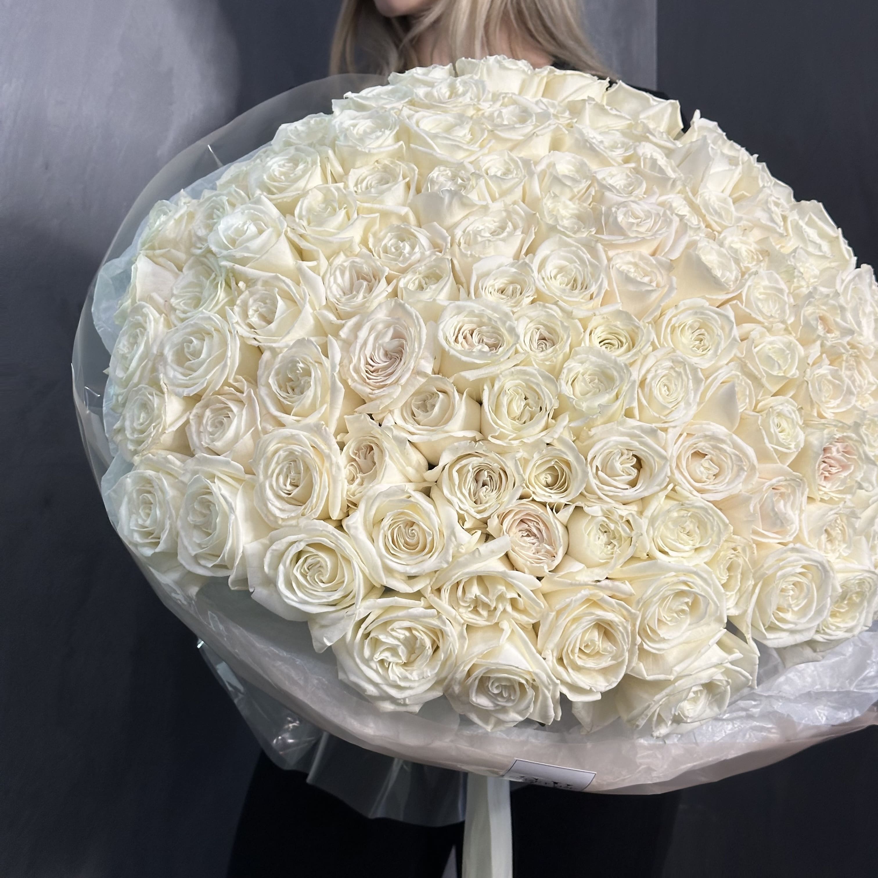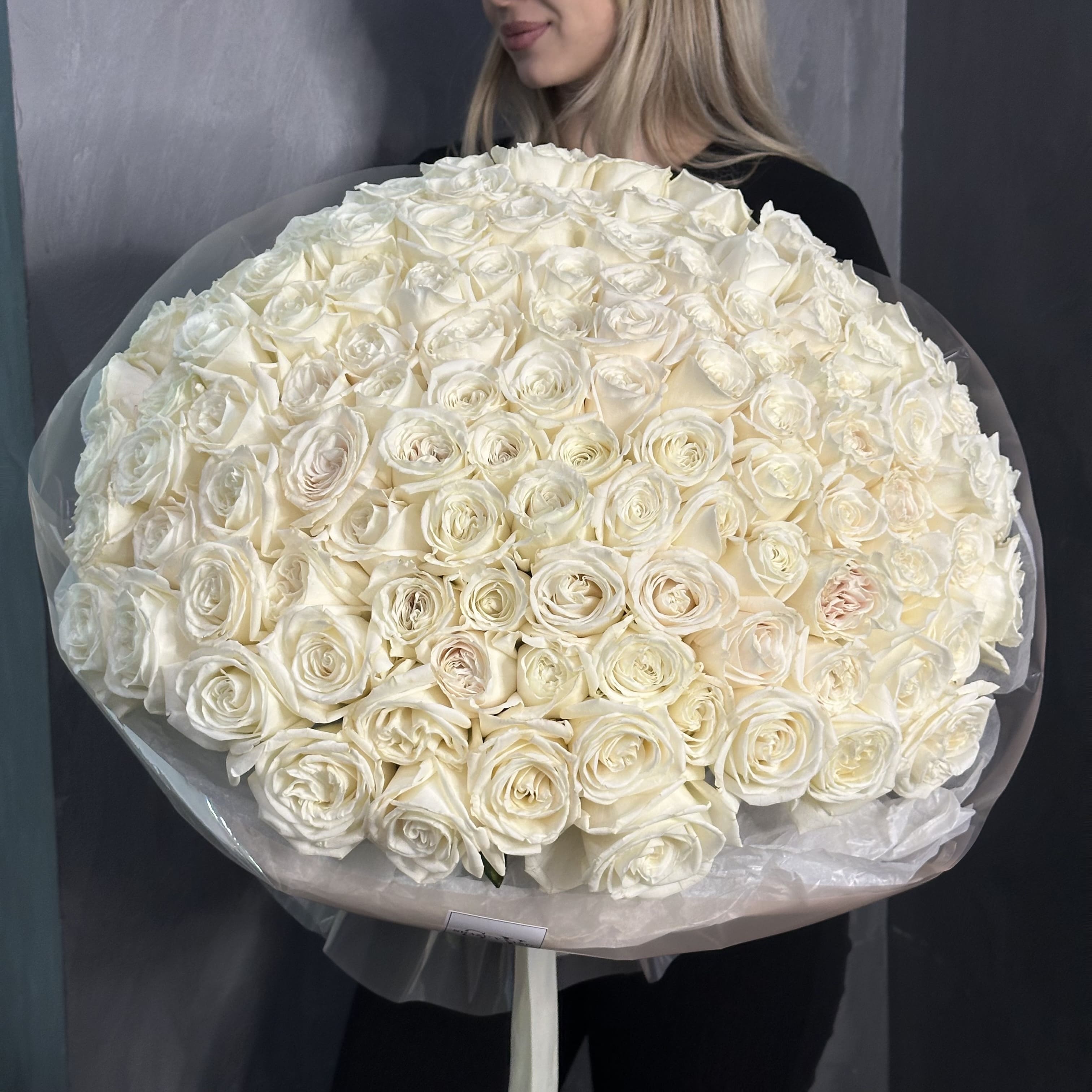 Гигантский букет из 111 крупных белых роз — чистая элегантность в каждом лепестке. Свежие, ровная композиция на длинных стеблях, идеален для торжественных моментов и подарит яркие эмоции.
